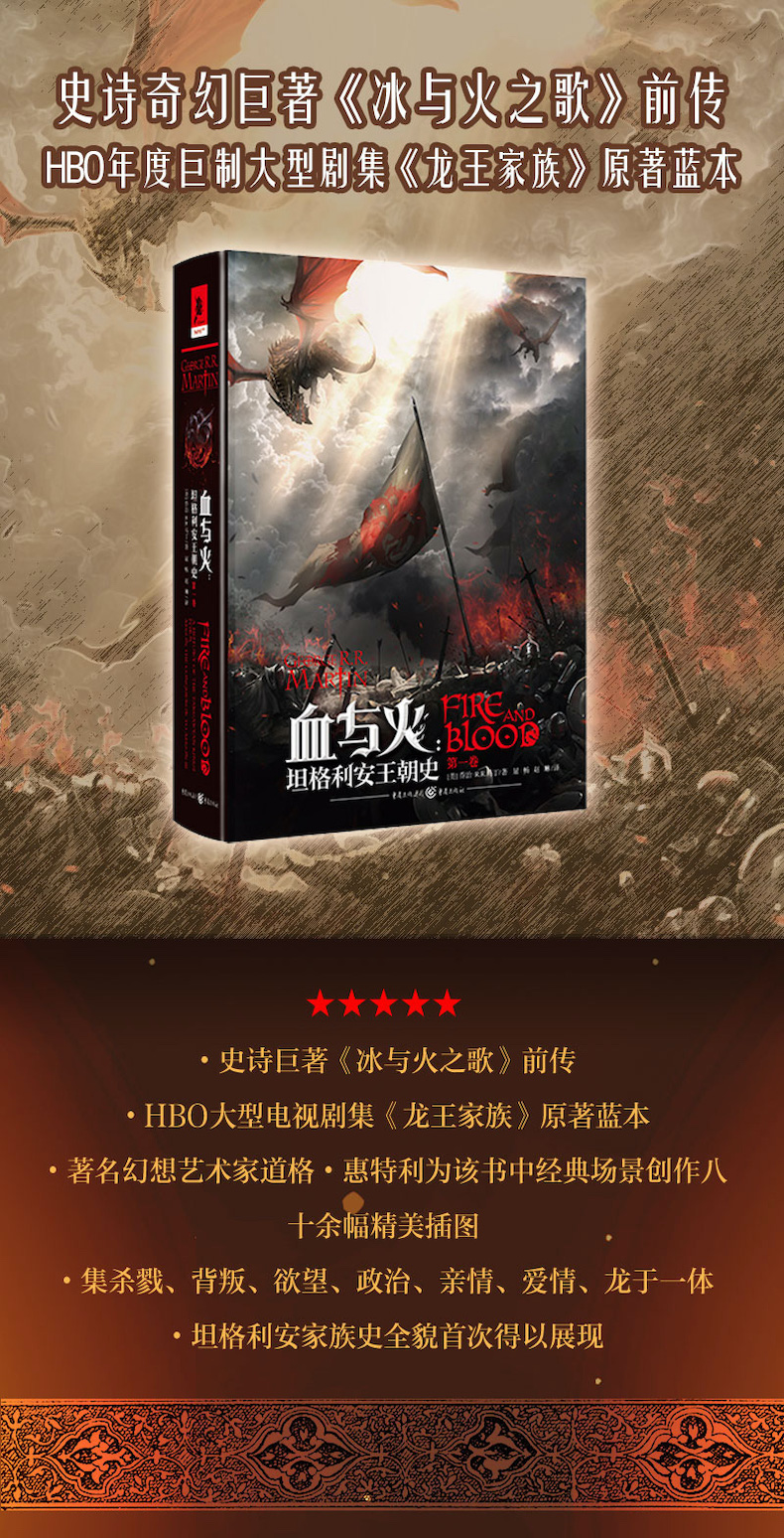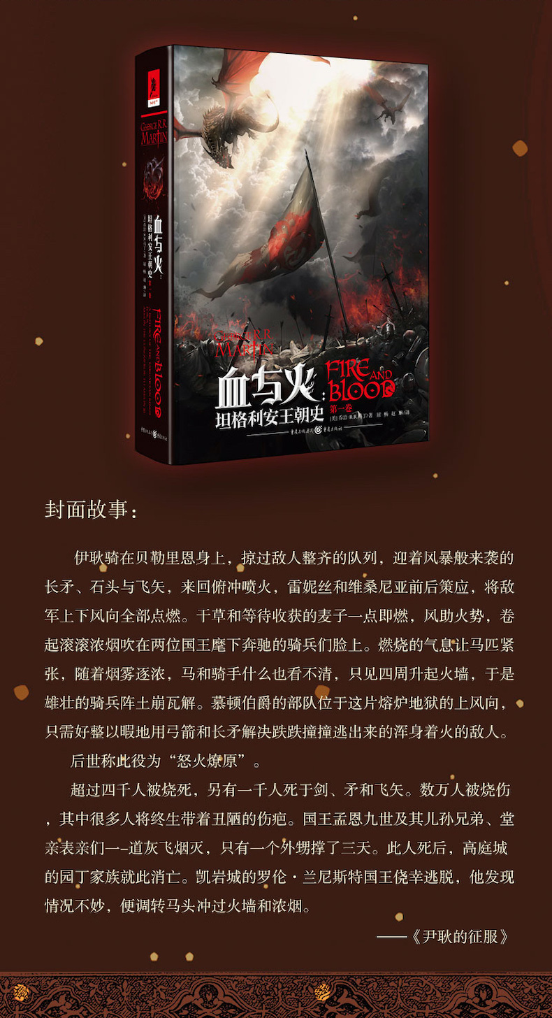 《冰与火之歌》系列小说开篇的三百年前,坦格利安家族作为幸存于瓦雷利亚“末日浩劫”的龙王家族,定居龙石岛,并发动征服战争,成功统一了维斯特洛大陆。全书以铁王座、传奇的“征服者”伊耿为开端,讲述了坦格利安王朝历代圣君与昏君不同时期的精彩典故,及永恒不变的权力斗争。读者曾在《冰与火之歌》中瞥见这些故事的一鳞半爪,现在,它们的全貌得以展现。本书由乔治·R.R.马丁托名学城学士“葛尔丹”撰写,配以幻想艺术家道格·惠特利创作的八十余幅精美插图,一经出版便长时间占据纽约时报畅销书榜前列,亦将成为HBO大型电视剧集《龙王家族》的原著蓝本。