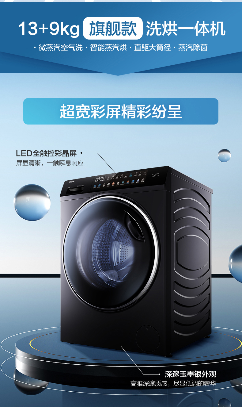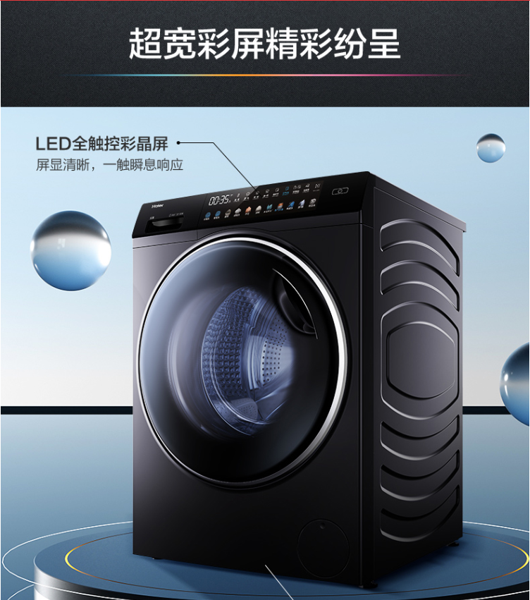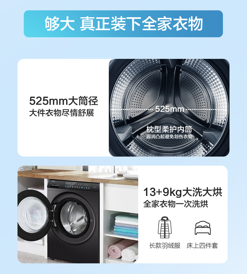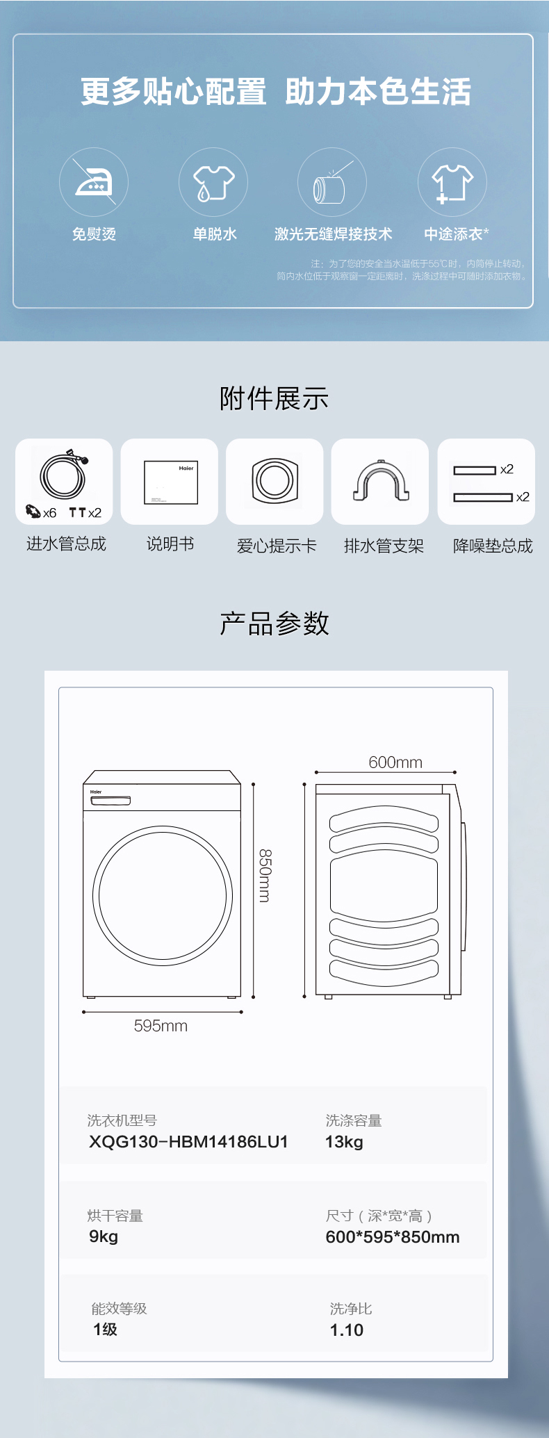 海尔滚筒洗衣机 超薄13公斤大筒径 全自动家电 磁悬浮防震动 洗烘XQG130-HBM14186LU1