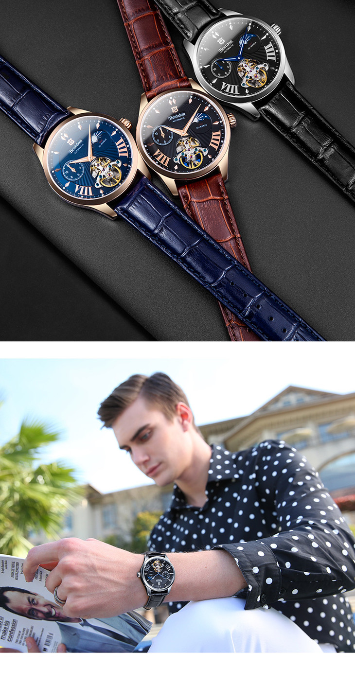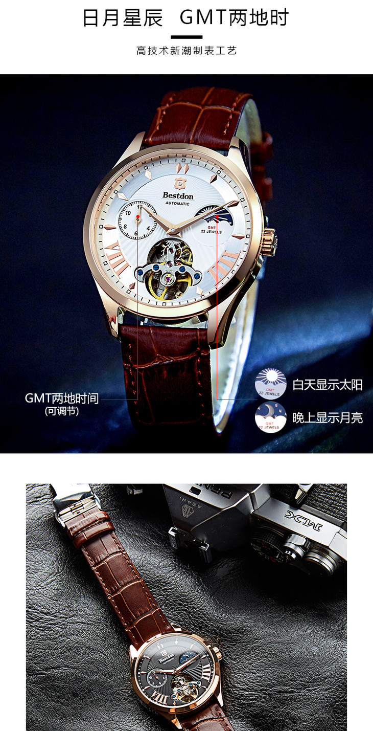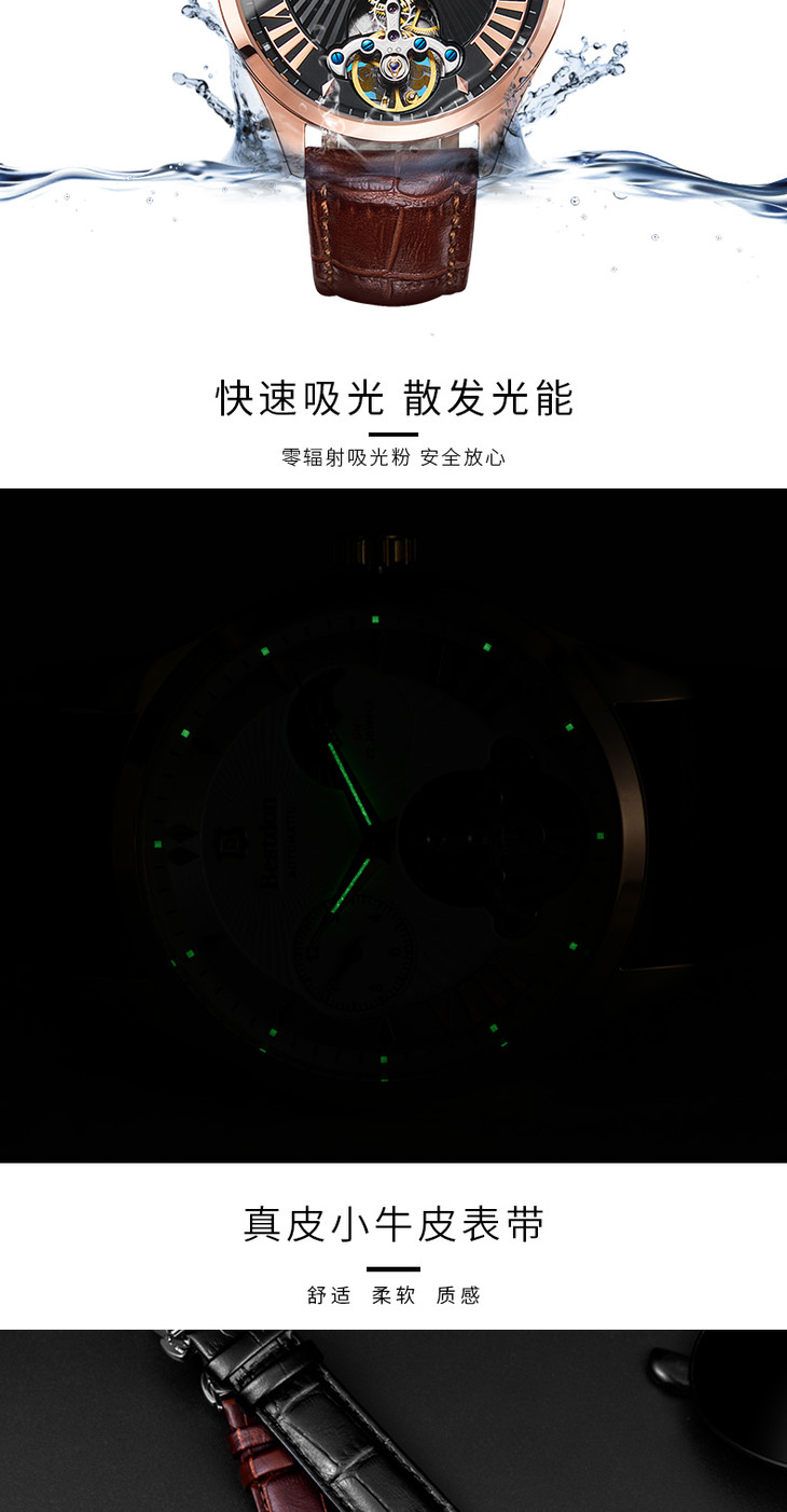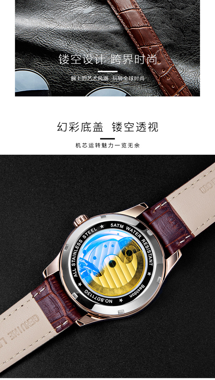 邦顿手表男士潮机械表全自动防水镂空正品真皮带男表 7113