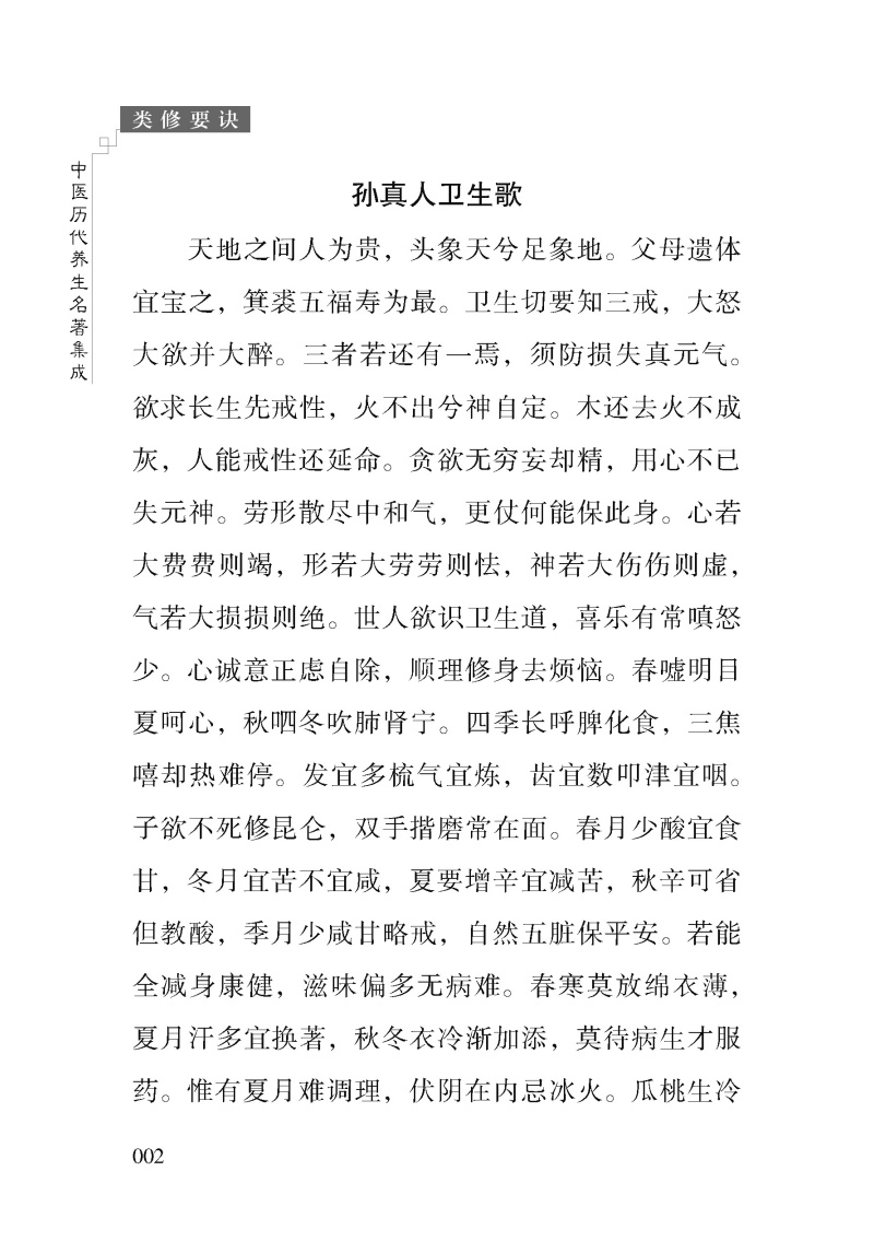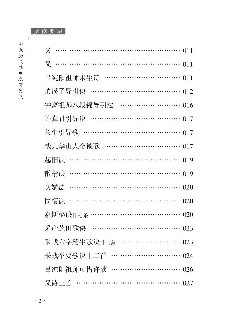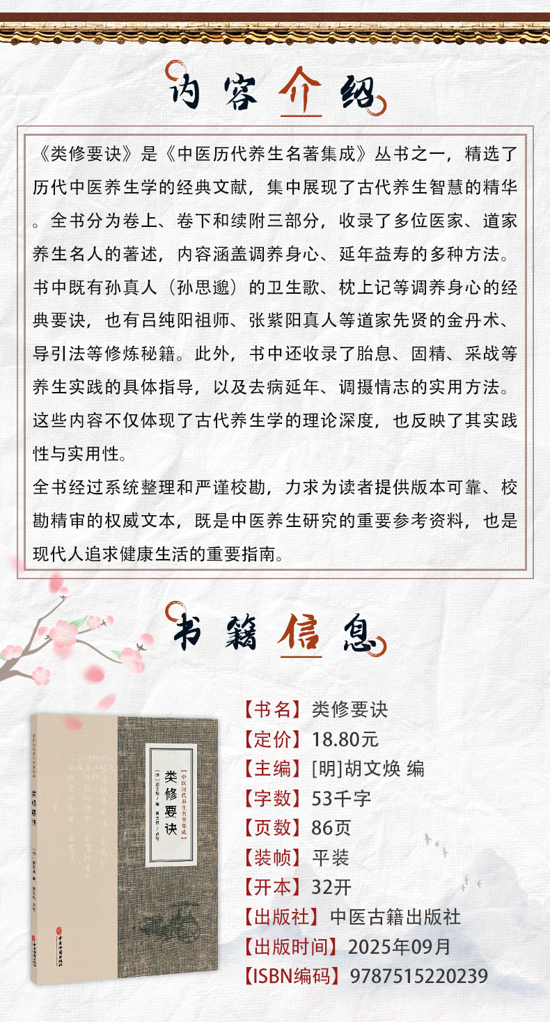 《类修要诀》是《中医历代养生名著集成》丛书之一,精选了历代中医养生学的经典文献,集中展现了古代养生智慧的精华。全书分为卷上、卷下和续附三部分,收录了多位医家、道家养生名人的著述,内容涵盖调养身心、延年益寿的多种方法。书中既有孙真人(孙思邈)的卫生歌、枕上记等调养身心的经典要诀,也有吕纯阳祖师、张紫阳真人等道家先贤的金丹术、导引法等修炼秘籍。此外,书中还收录了胎息、固精、采战等养生实践的具体指导,以及去病延年、调摄情志的实用方法。这些内容不仅体现了古代养生学的理论深度,也反映了其实践性与实用性。