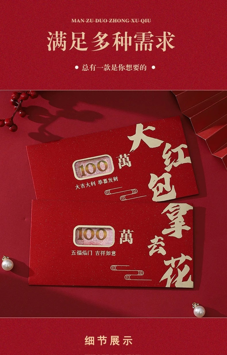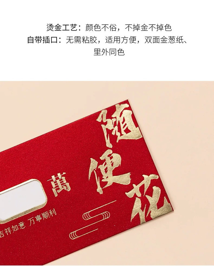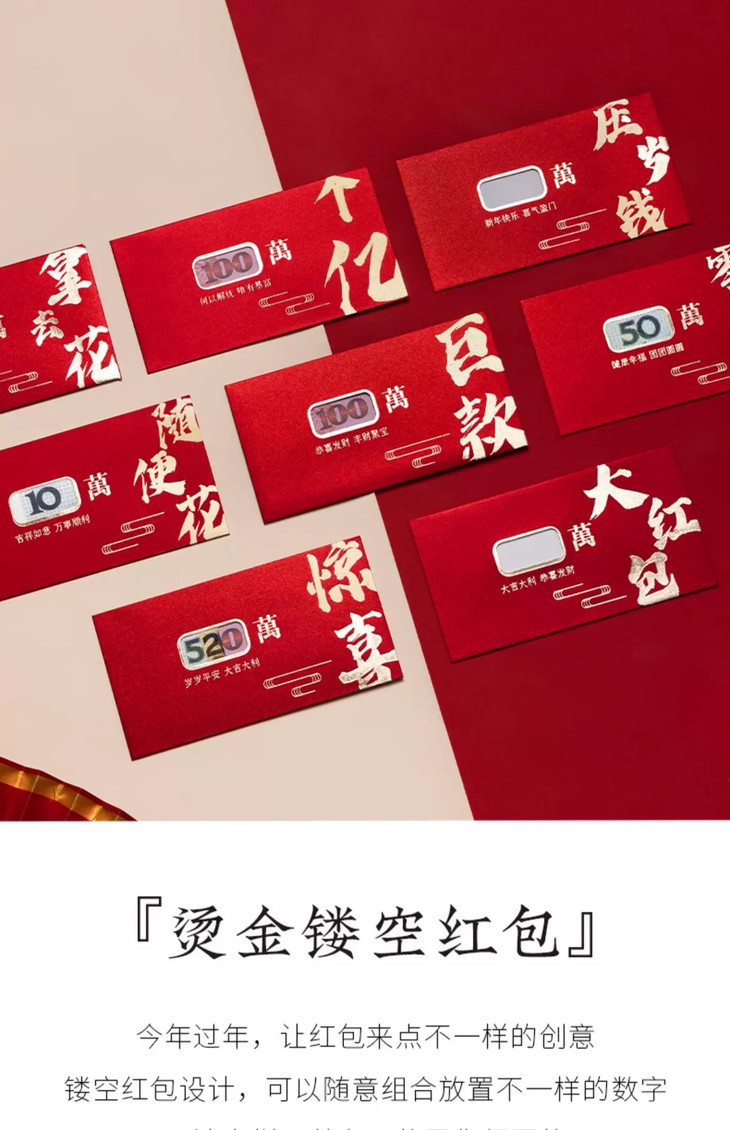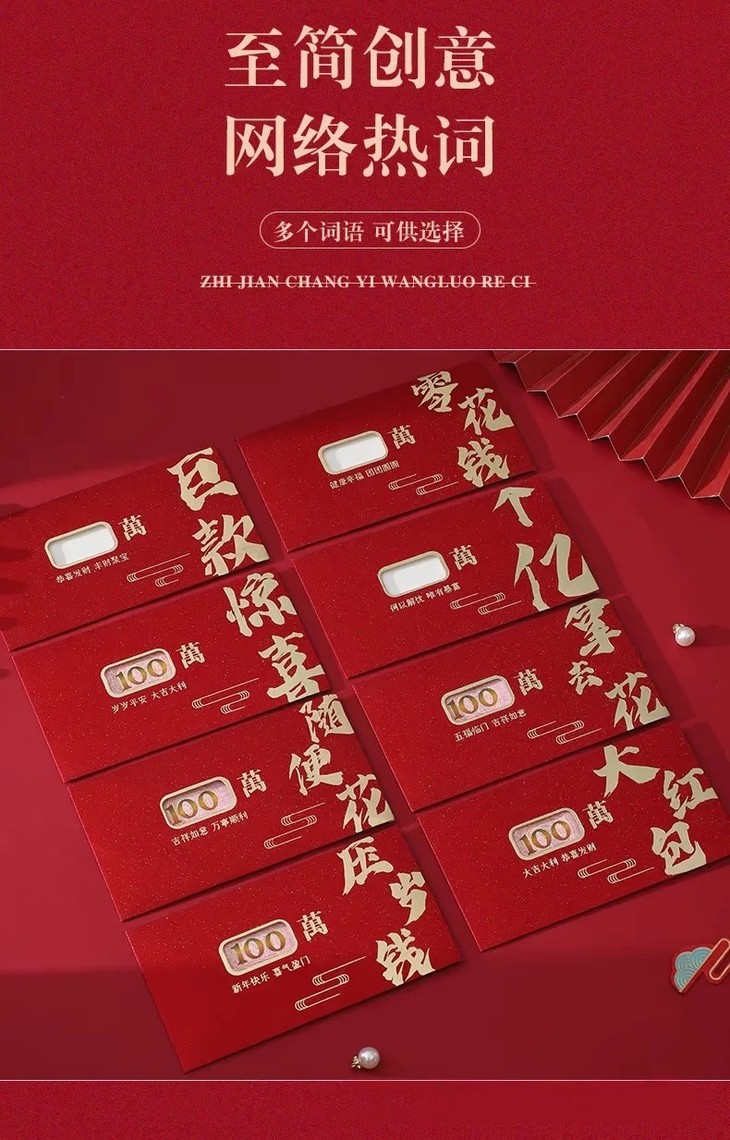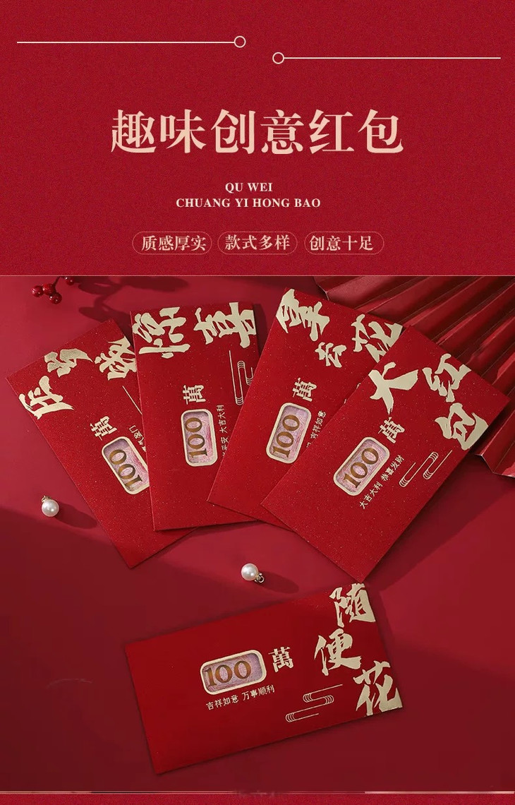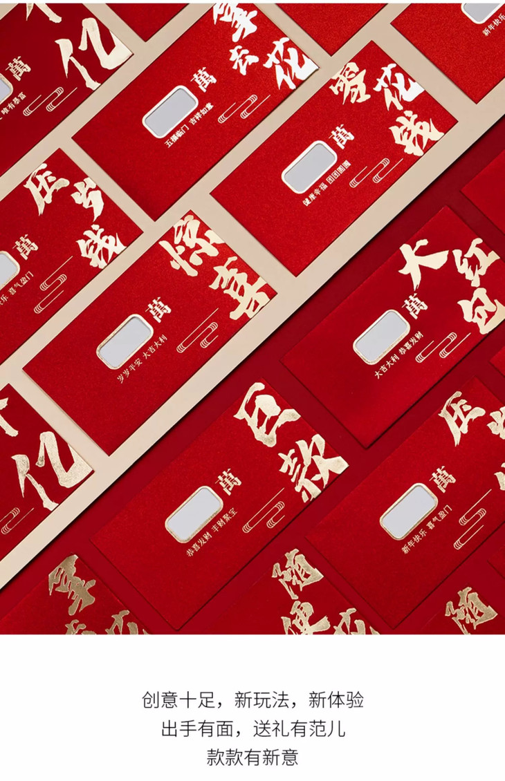 年关将至,按照我国的传统习俗 家家户户都要准备喜庆的🧧红包以示辞旧迎新 期冀度过和和睦睦的新年,迎来甜甜美美的🧨新春佳节 新年购置红包必不可少🥰寓意喜庆团圆幸福美满、万象更新、财源滚滚、春风满面、辞旧迎新~️