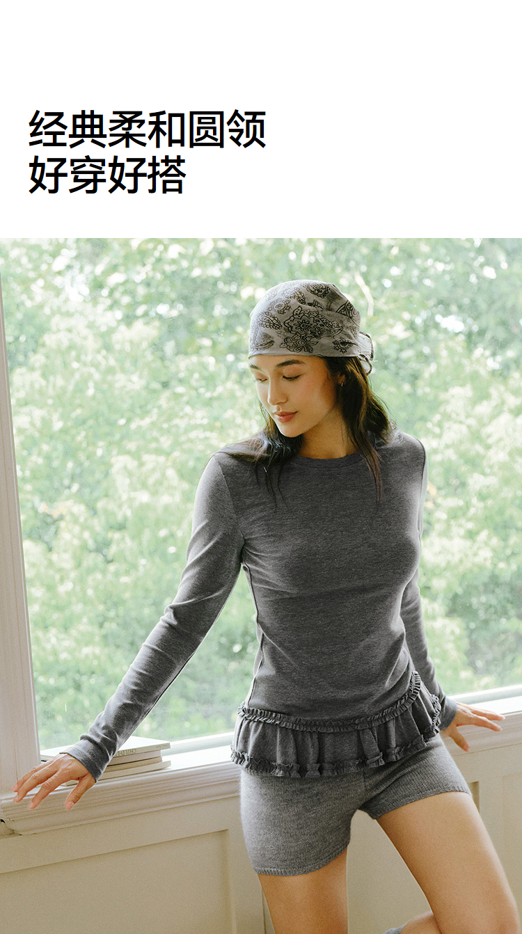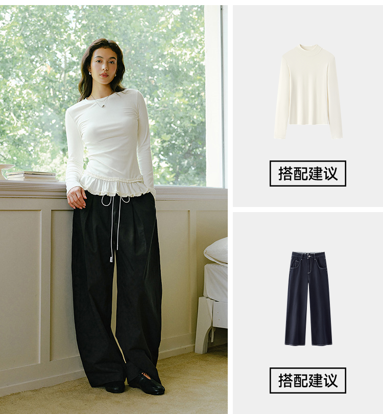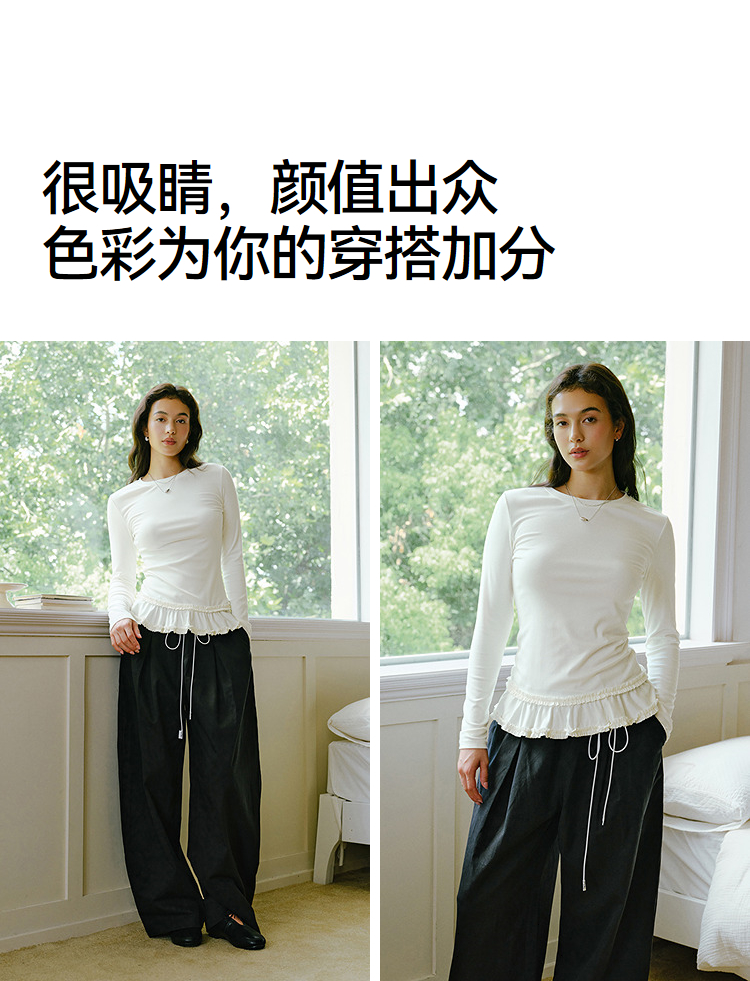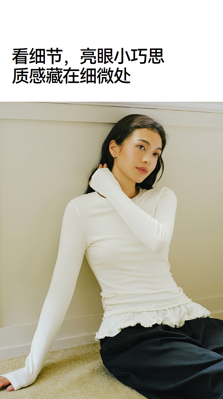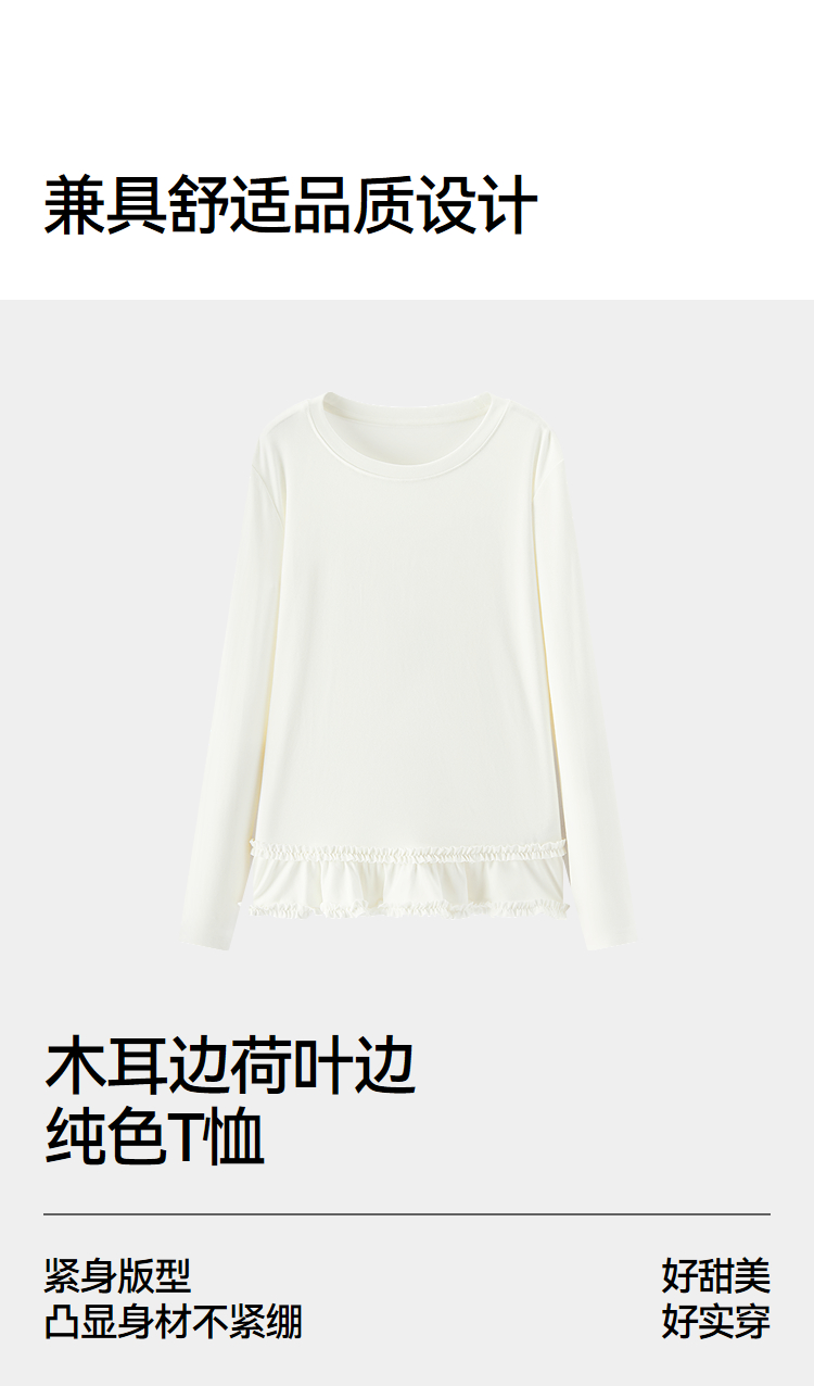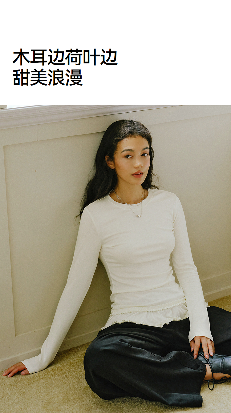 森马长袖T恤女纯色木耳边气质紧身冬2025新款荷叶边上衣简约甜美