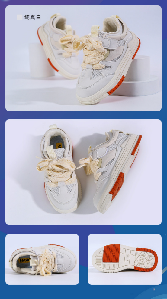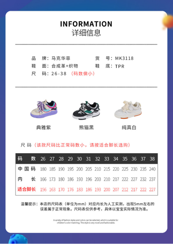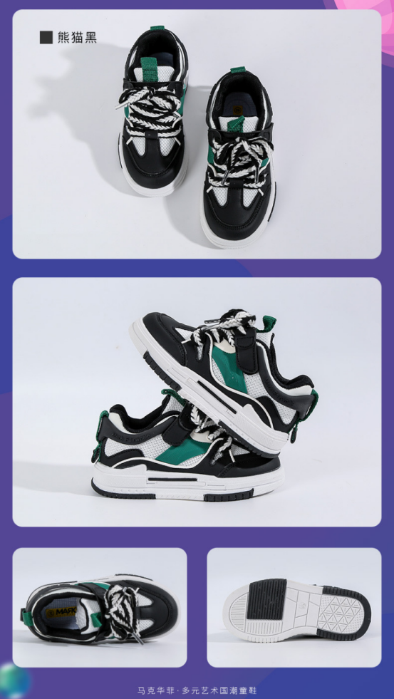 马克华菲23年春季新品童鞋MK3118 品牌:马克华菲 规格:26-38码(码数偏小) 颜色:纯真白/典雅紫/熊猫黑3色可选 材质:合成革+织物+TPR 跟高:3cm 帮高:5cm 产地:福建泉州 发货地:福建泉州 发货快递:圆通快递/丰网速运/中通快递/韵达快递随机发 发货时长:72小时 不发货地区:港澳台、海外 售后说明:在不影响二次销售的情况下,支持7天无理由退换货,非产品本身质量问题需要客户自行承担运费