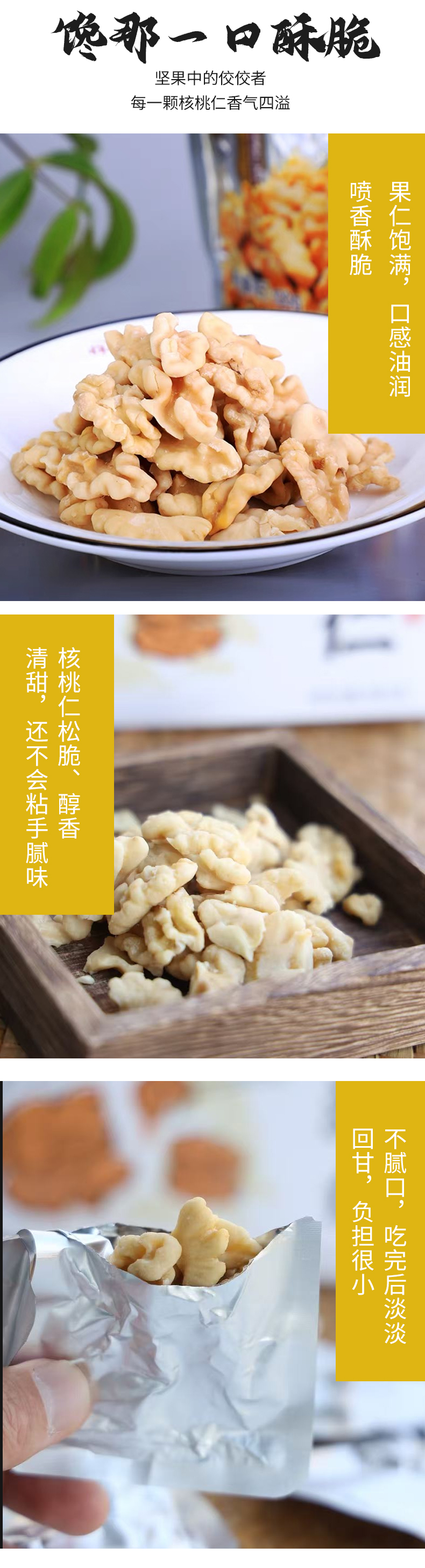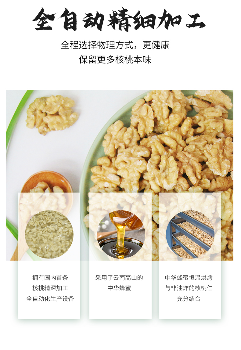 采用云南高山的中华蜂蜜浸泡核桃仁,通过非油炸的烘烤,让蜂蜜紧紧裹住核桃仁,轻咬一口果仁,口感油润,喷香酥脆,让人欲罢不能