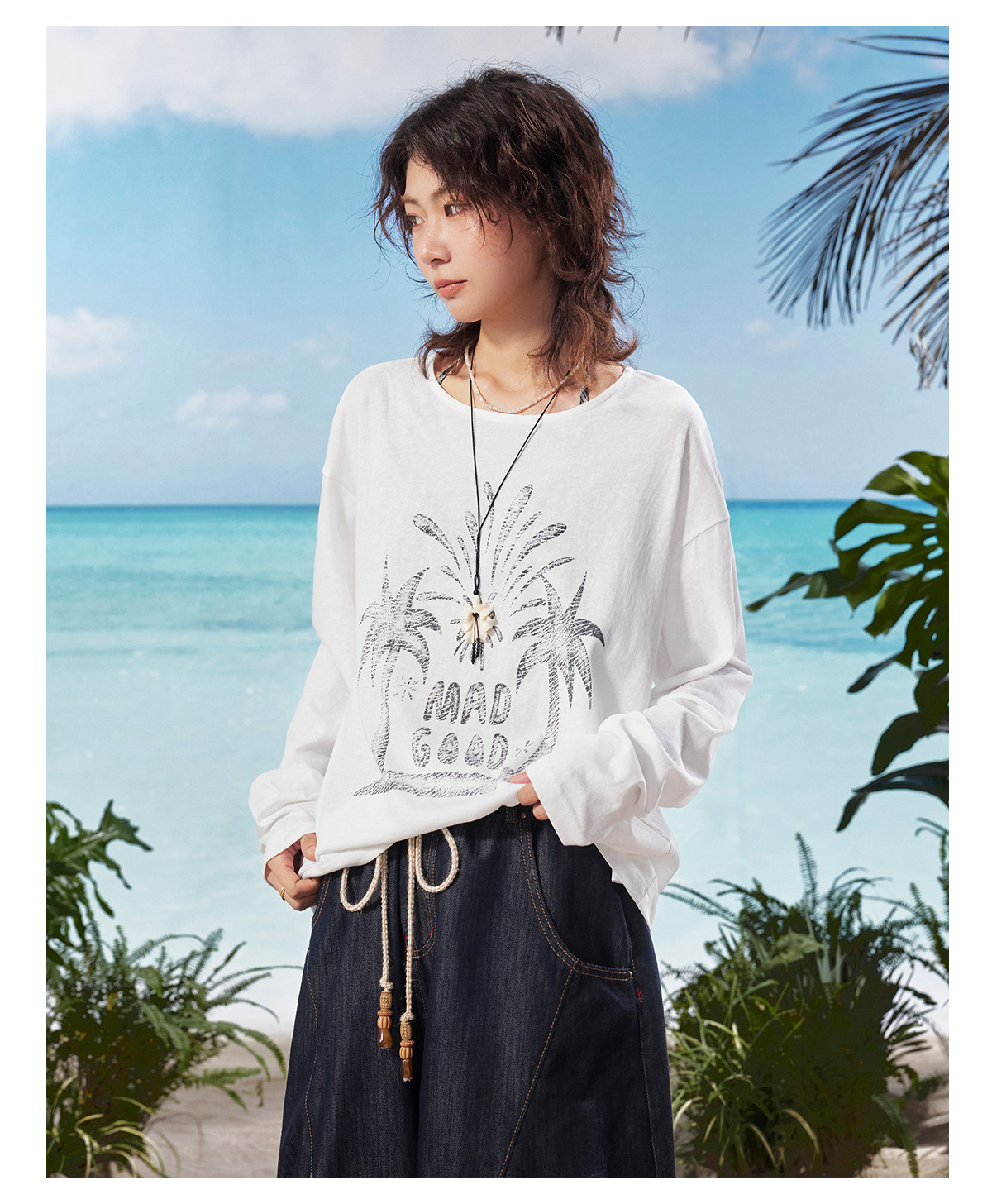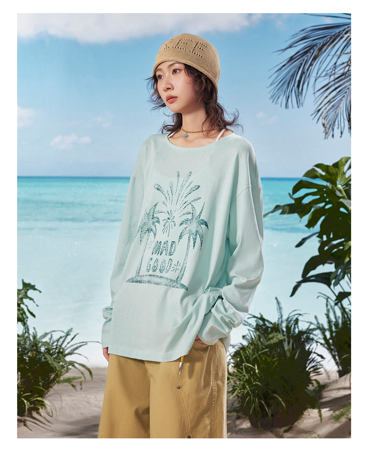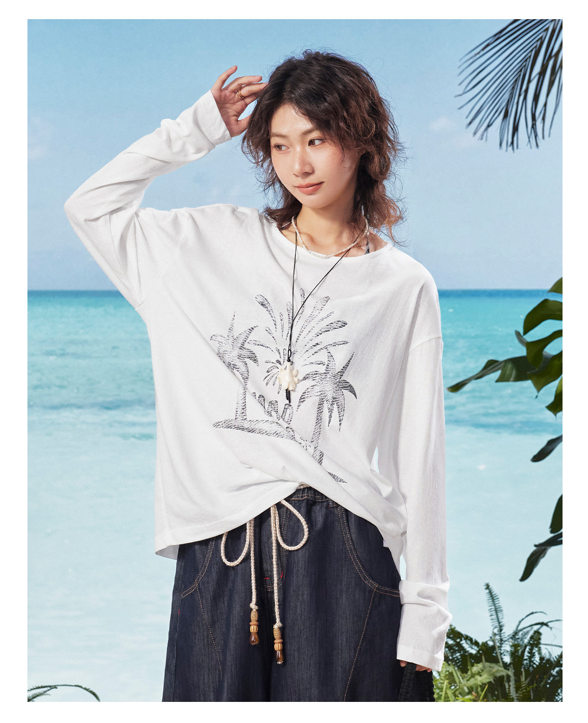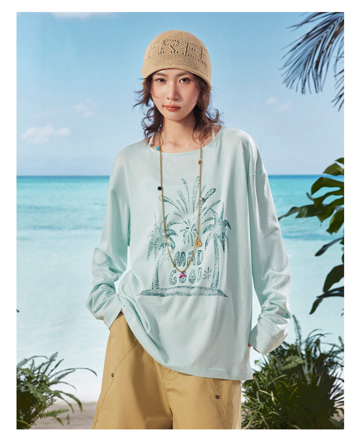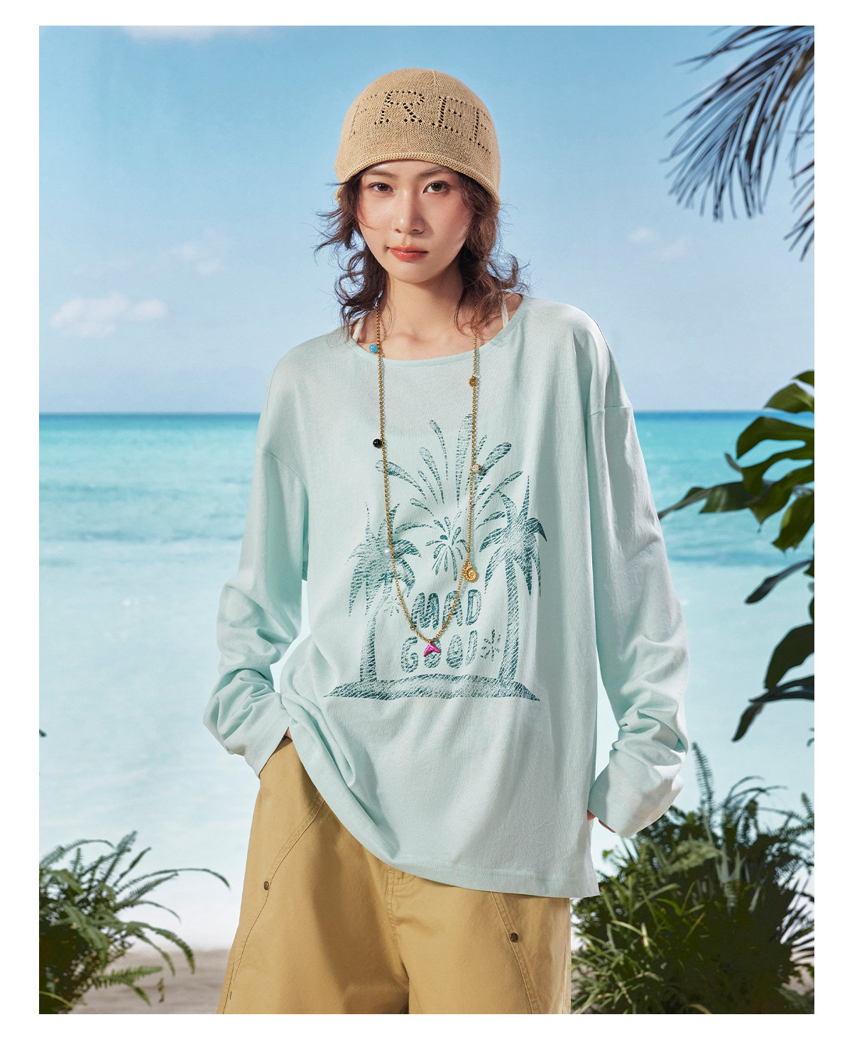 马得工地/MDGDTX222150/拓印椰树雪花棉长袖T恤罩衫