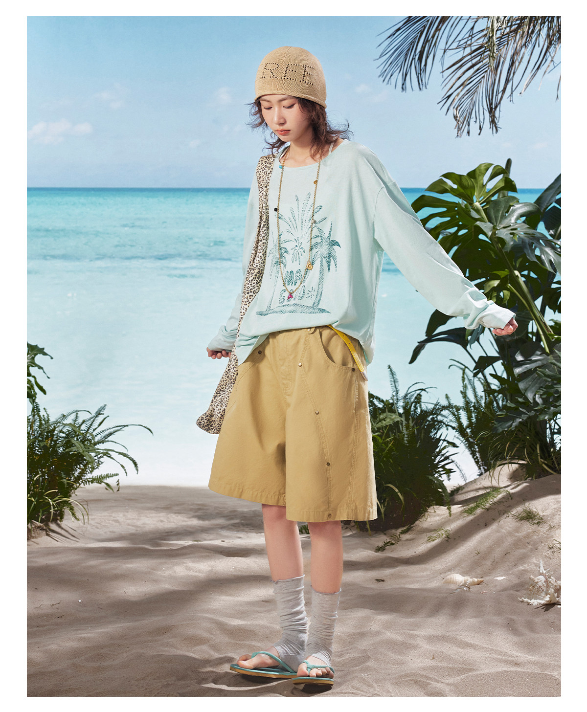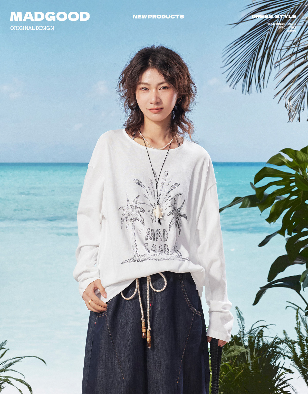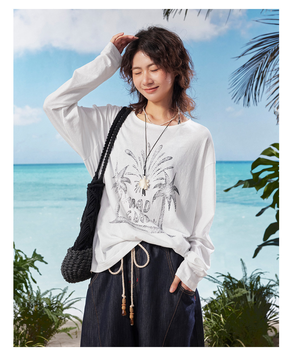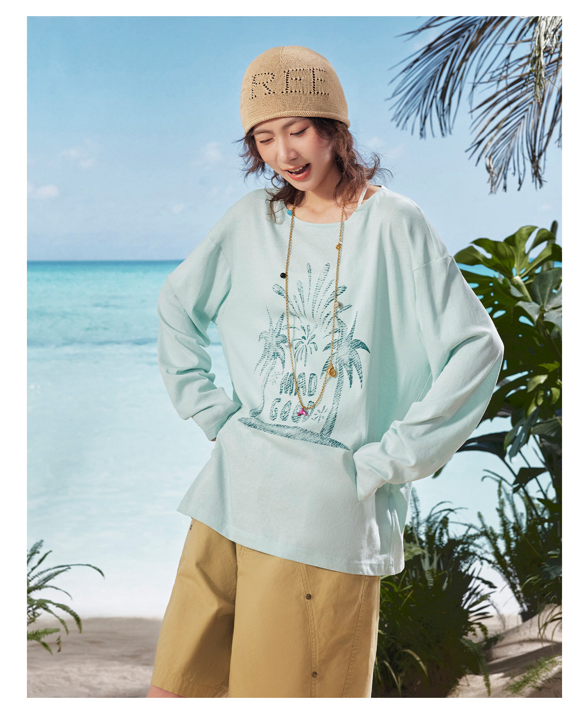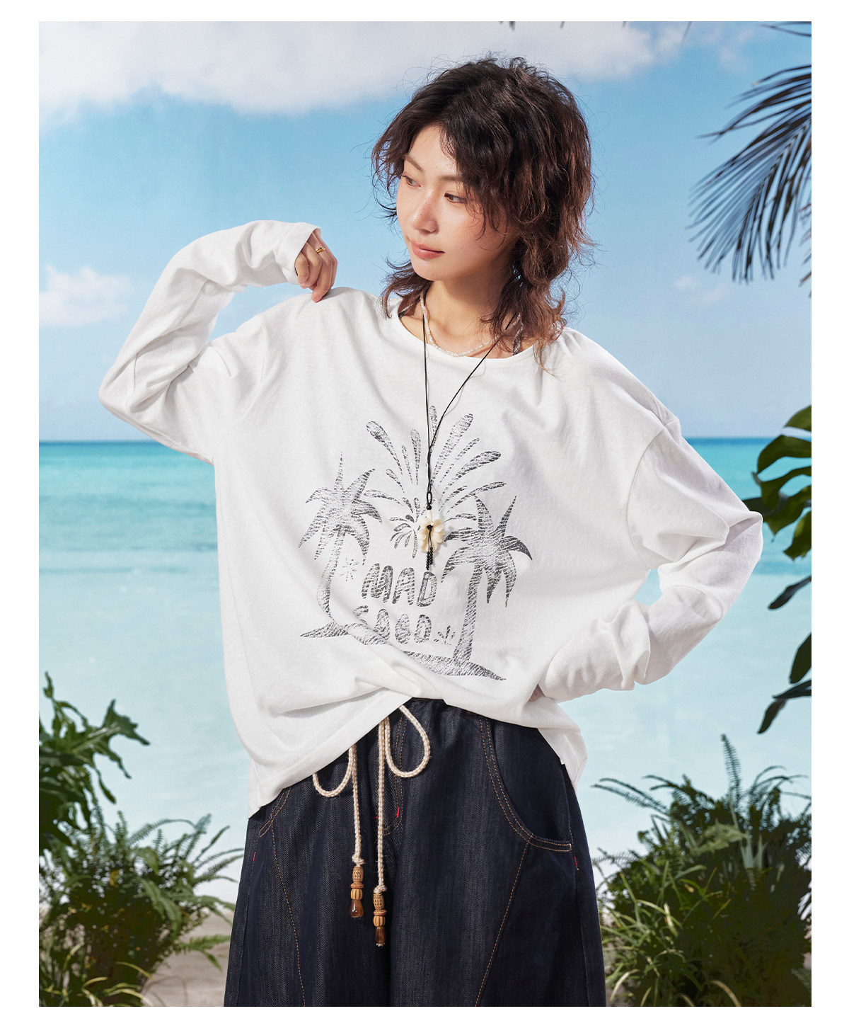 马得工地/MDGDTX222150/拓印椰树雪花棉长袖T恤罩衫