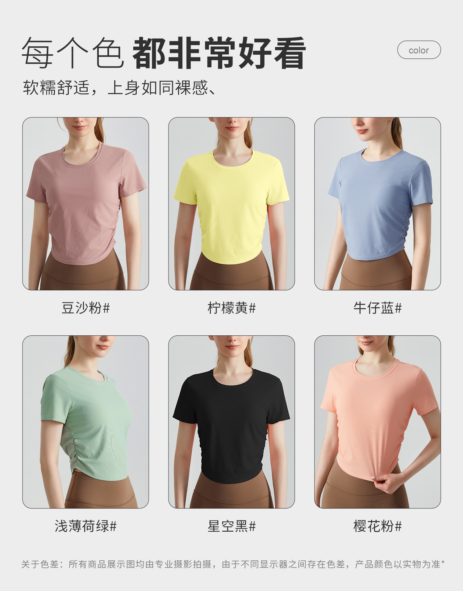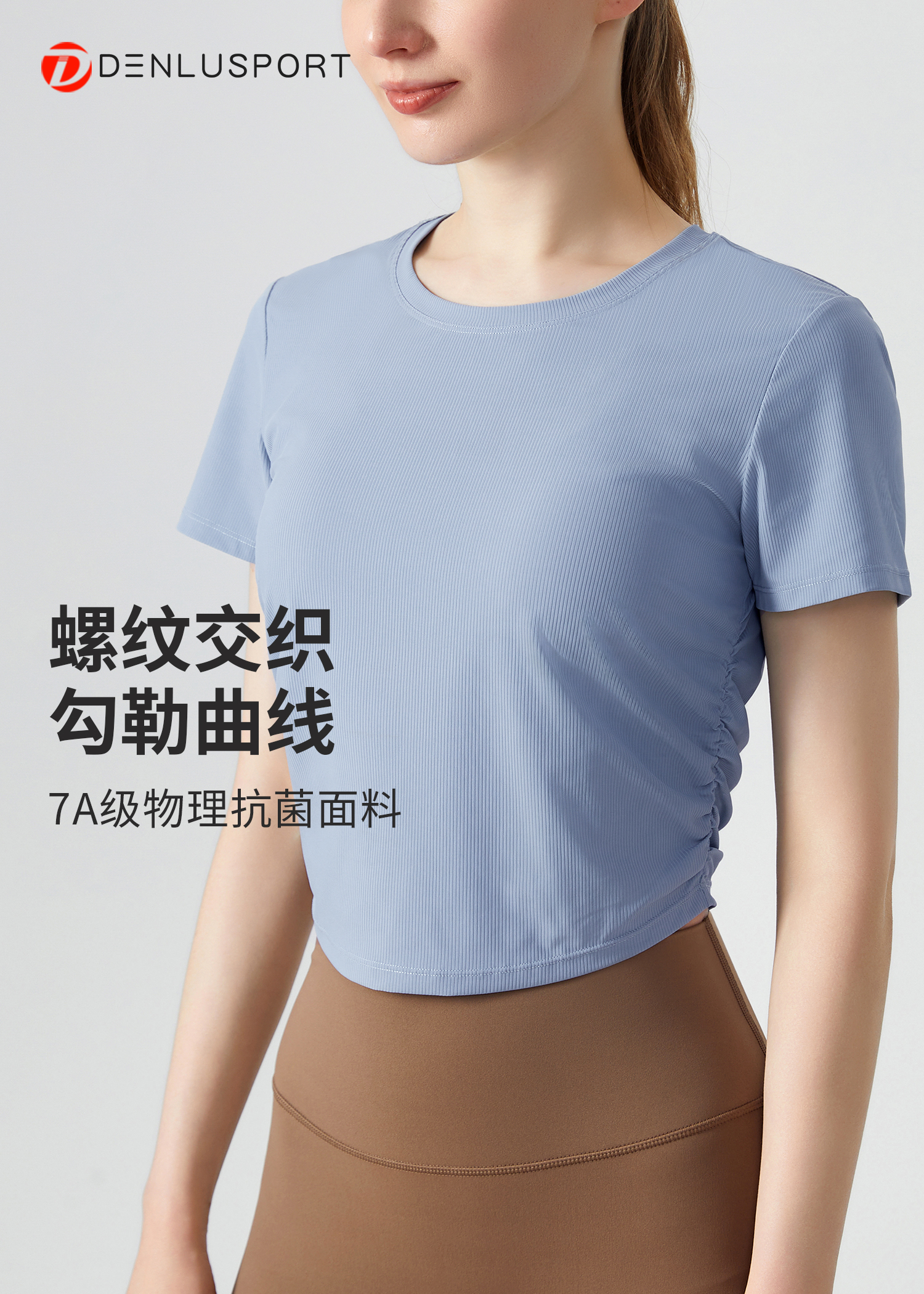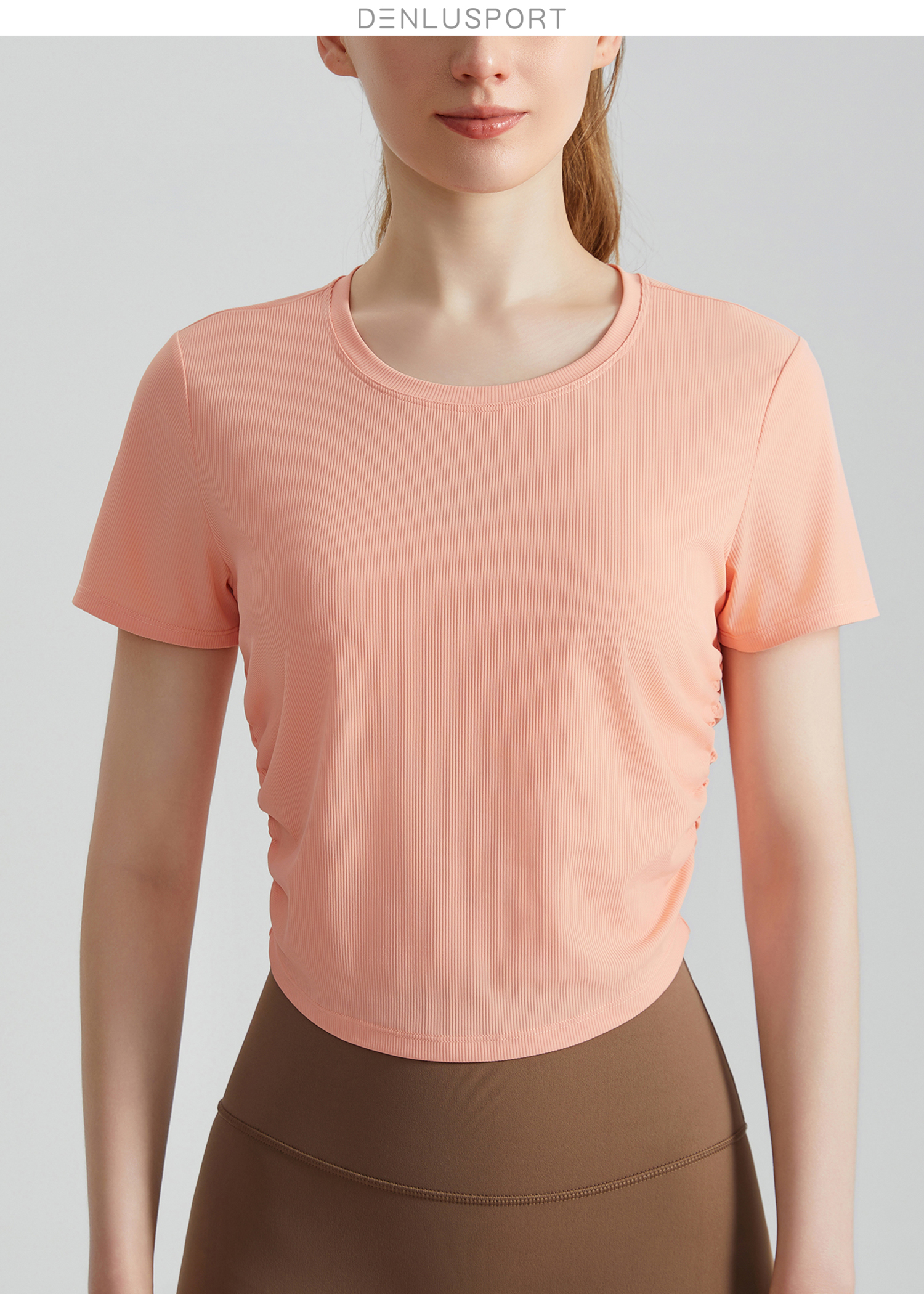 DENLUS 速干运动上衣褶皱收腰修身显瘦圆领薄款透气瑜伽短袖健身T恤 DY66180