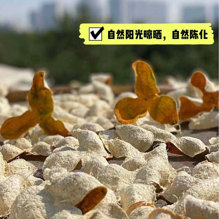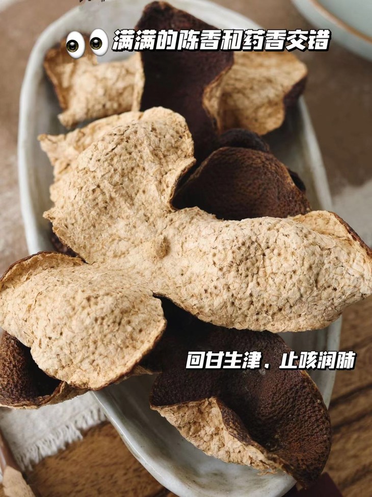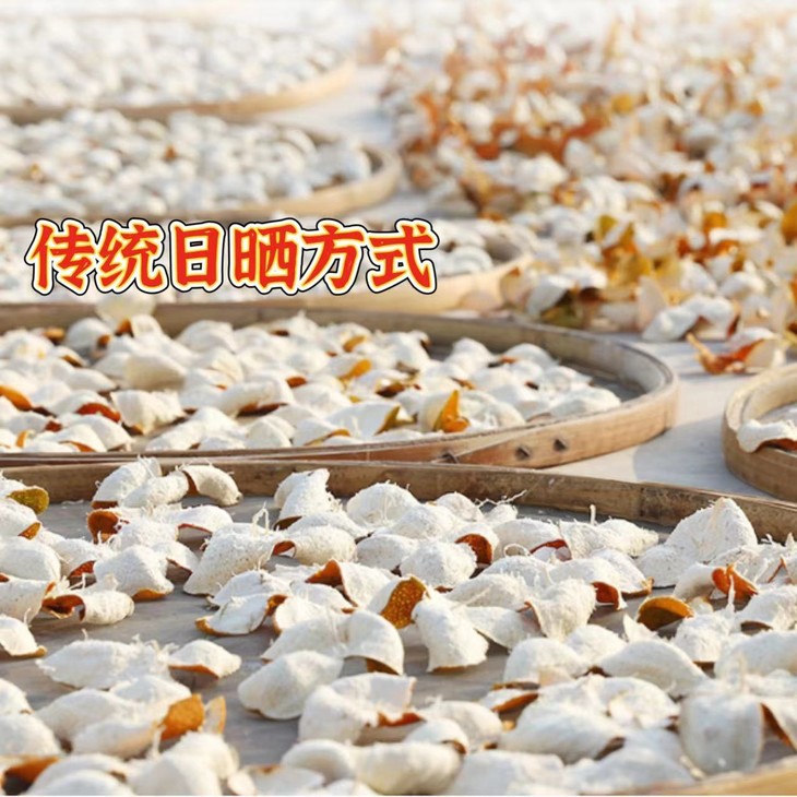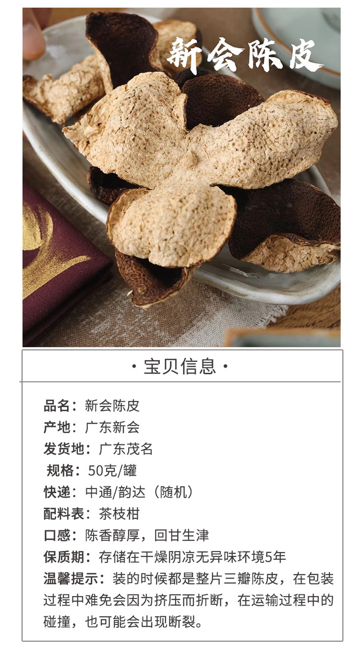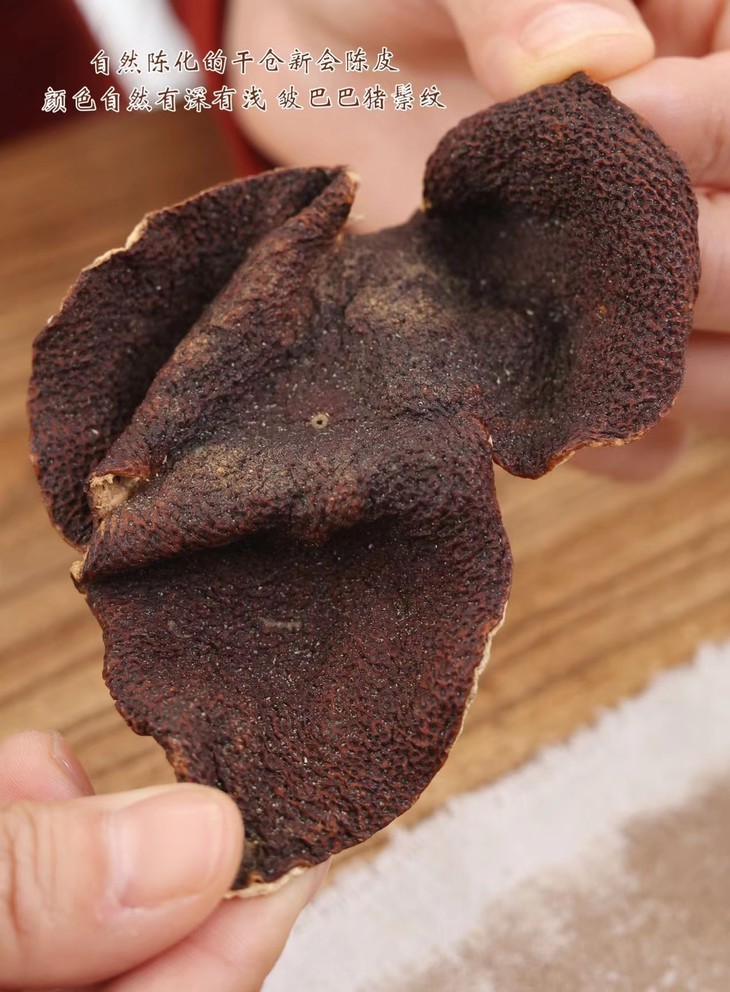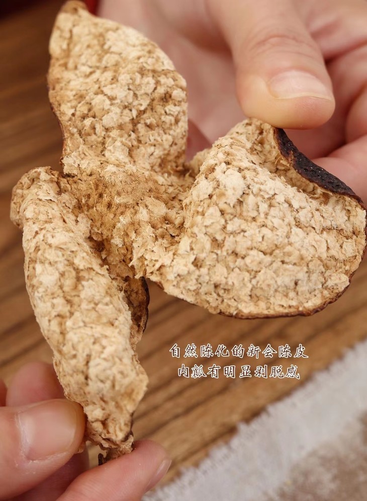 一两陈皮一两金的【新会陈皮】用传统的“两刀三瓣”手艺将柑皮切开剥离果肉,自然阳光晾晒,自然陈化,不添加任何人工物质,最大程度保证陈皮的香气,其味甘、香、醇