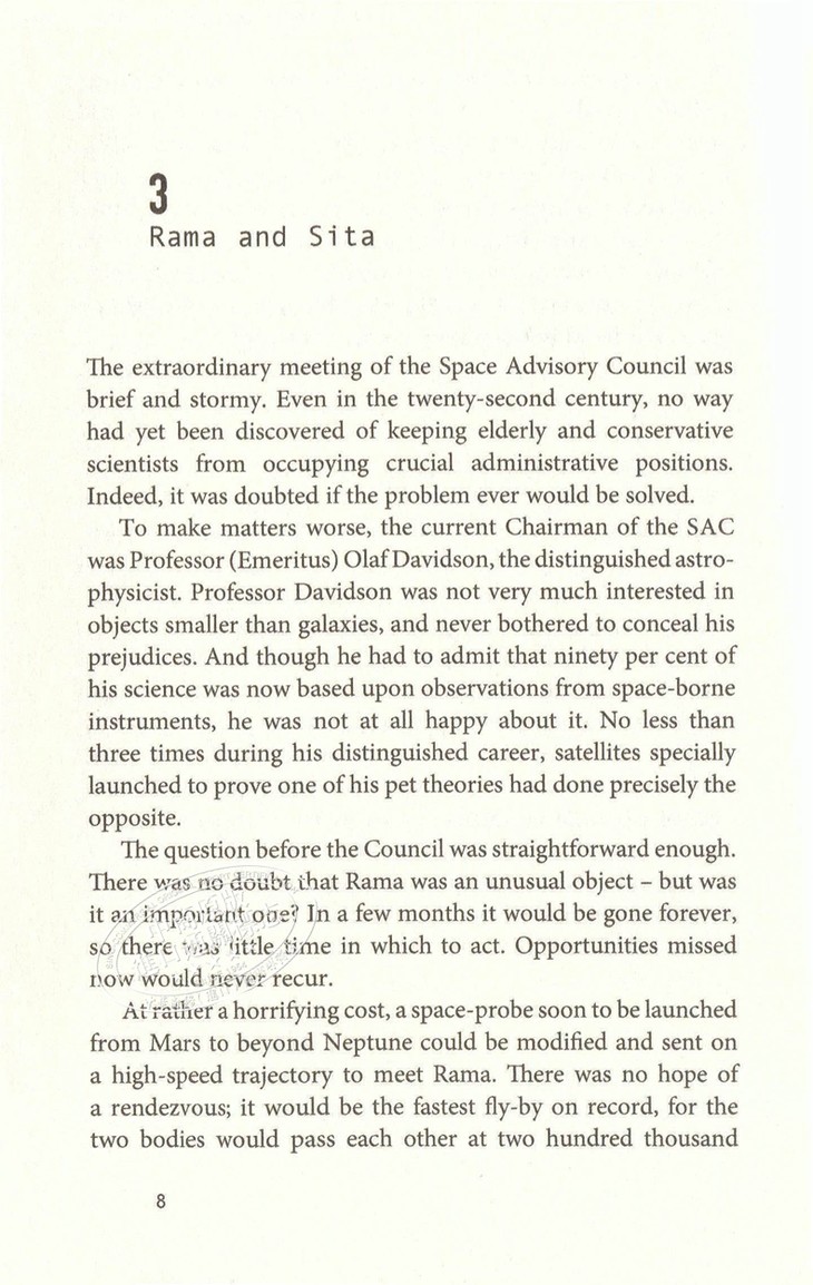 For a few days, the news media made a fuss over the visitor, but they were badly handicapped by the sparsity of information. Only two facts were known about Rama: its unusual orbit and its approximate size. Even this last was merely an educated guess, based upon the strength of the radar echo. Through the telescope, Rama still appeared as a faint, fifteenth-magnitude star-much too small to show a visible disc. But as it plunged in toward the heart of the solar system, it would grow brighter and larger month by month; before it vanished forever, the orbiting observatories would be able to gather more precise information about its shape and size. There was plenty of time, and perhaps during the next few years some spaceship on its ordinary business might be routed close enough to get good photographs. An actual rendezvous was most unlikely; the energy cost would be far too great to permit physical contact with an object cutting across the orbits of the planets at more than a hundred thousand kilometers an hour.