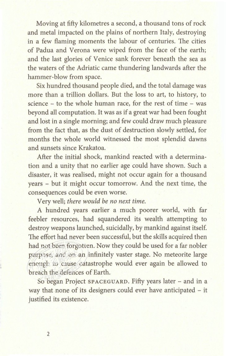 In those days there was nothing that men could do to protect themselves against the last random shots in the cosmic bombardment that had once scarred the face of the Moon. The meteorites of 1908 and 1947 had struck uninhabited wilderness; but by the end of the twenty-first century there was no region left on Earth that could be safely used for celestial target practice. The human race had spread from pole to pole. And so, inevitably