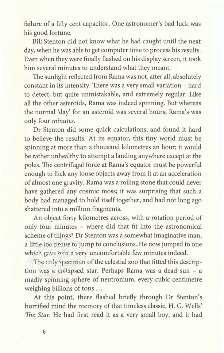 The sunlight reflected from Rama was not, after all, absolutely constant in its intensity. There was a very small variation-hard to detect, but quite unmistakable, and extremely regular. Like all the other asteroids, Raina was indeed spinning. But whereas the normal "day" for an asteroid was several hours, Rama's was only four minutes.