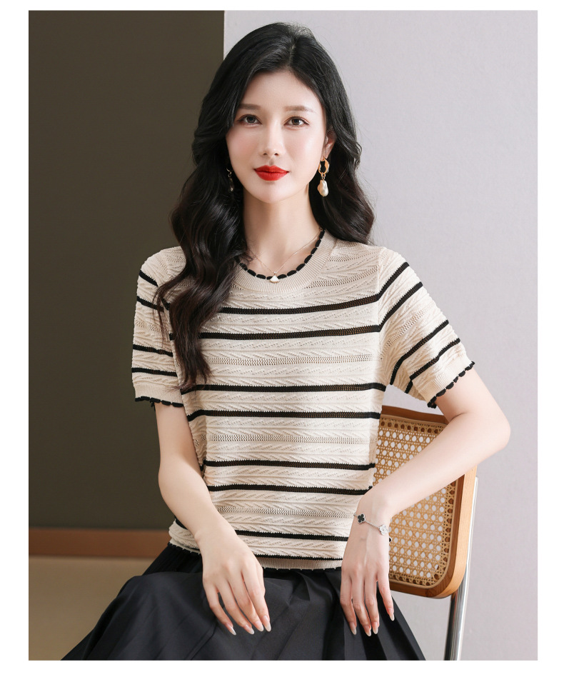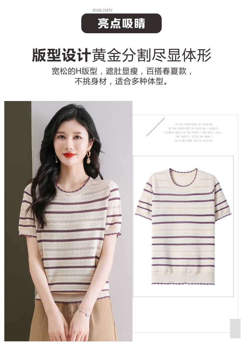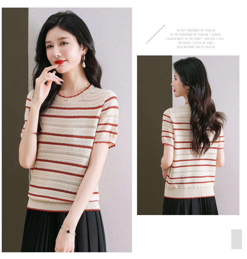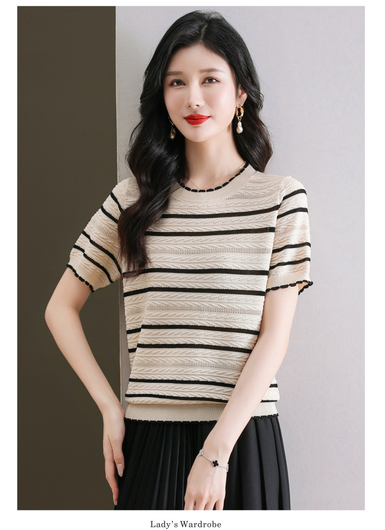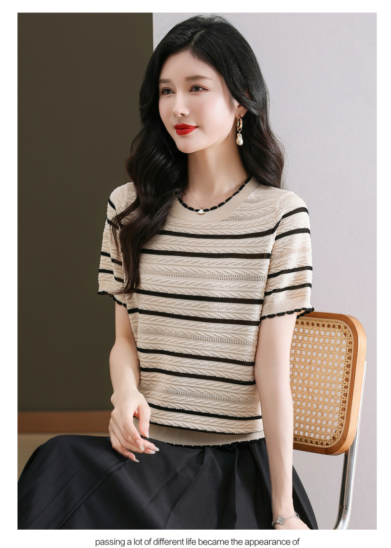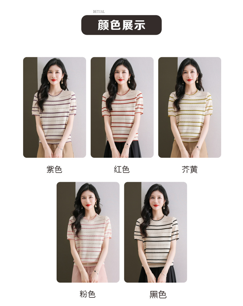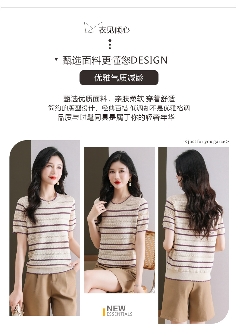 短袖针织减龄圆领,短款配裙子上衣冰丝条纹小衫CC-101-90325