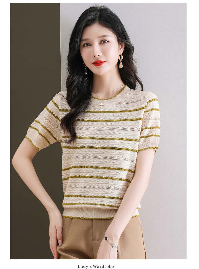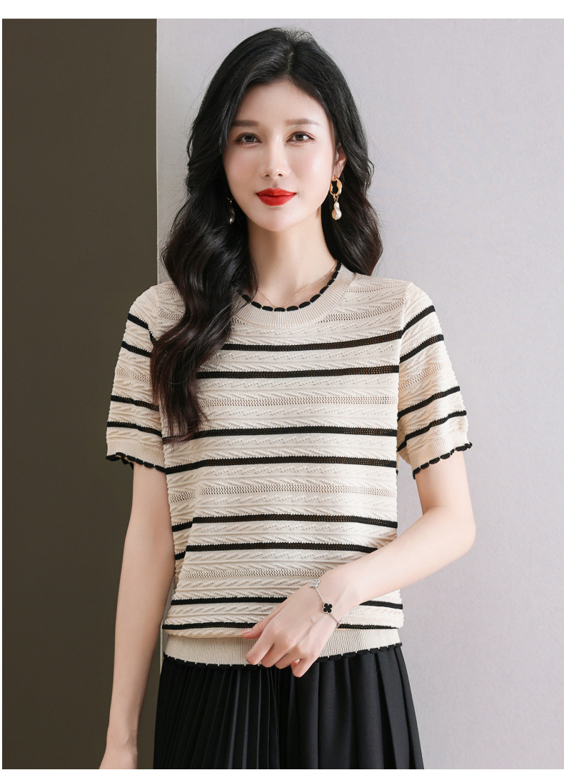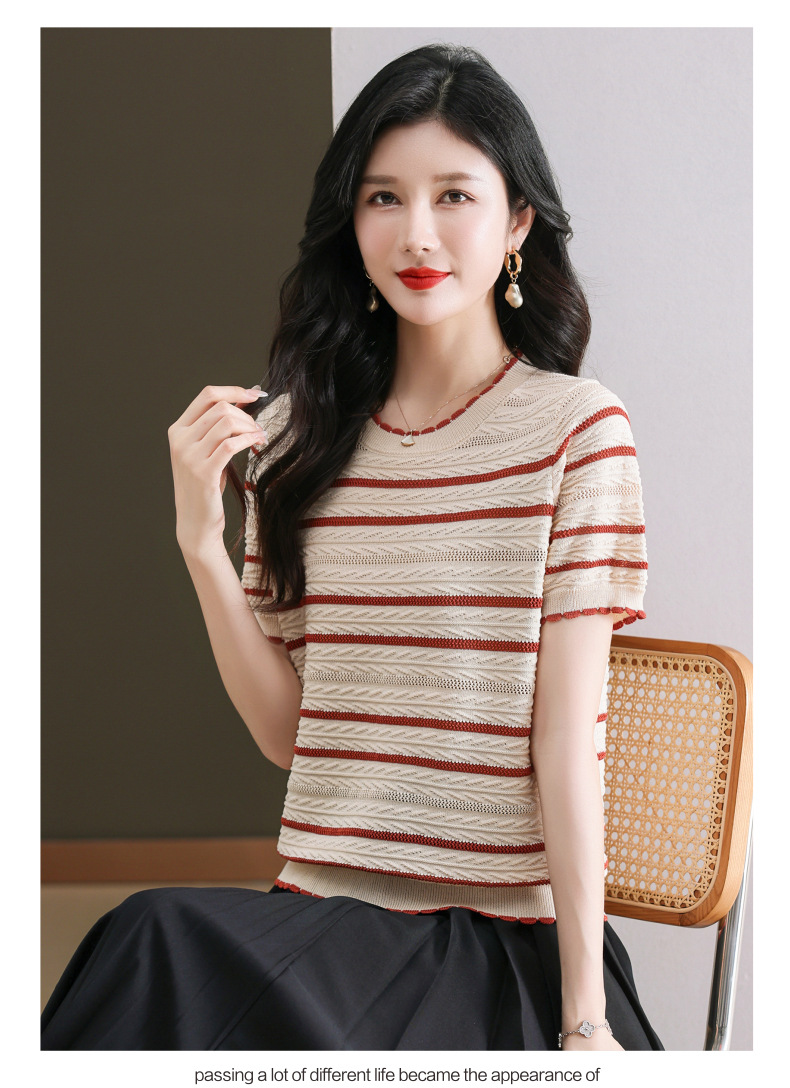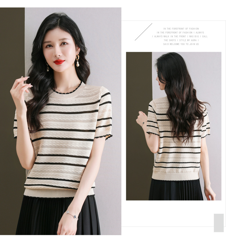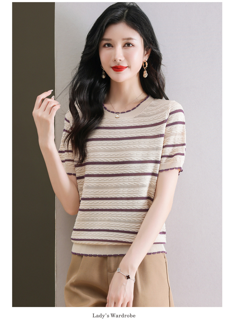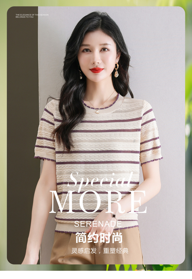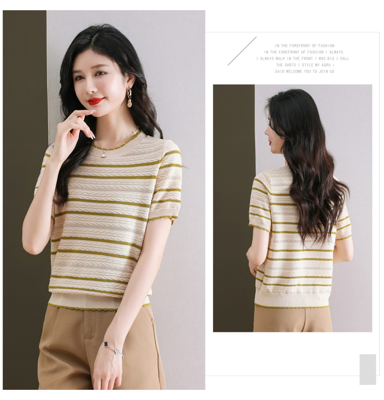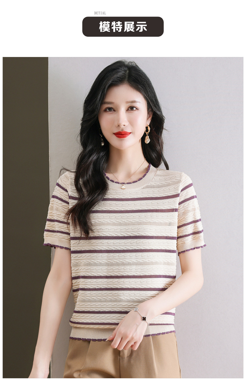 短袖针织减龄圆领,短款配裙子上衣冰丝条纹小衫CC-101-90325