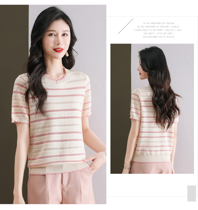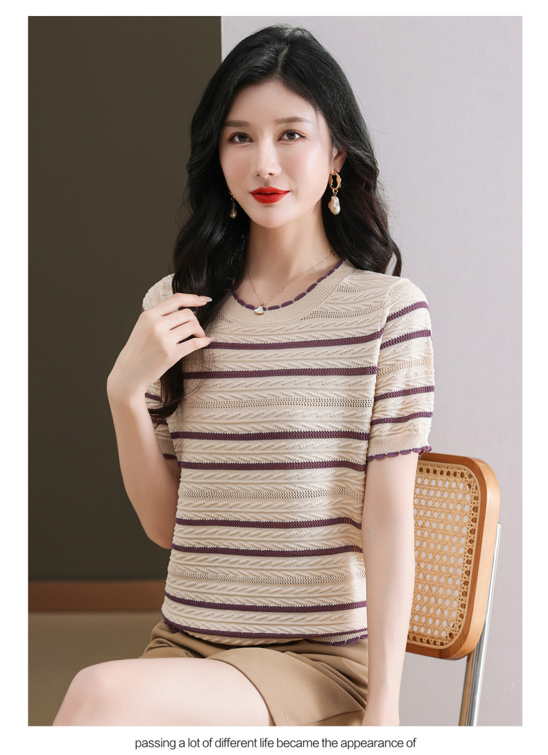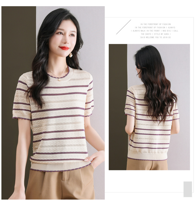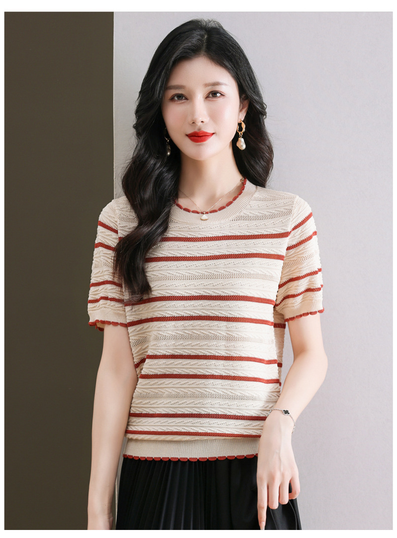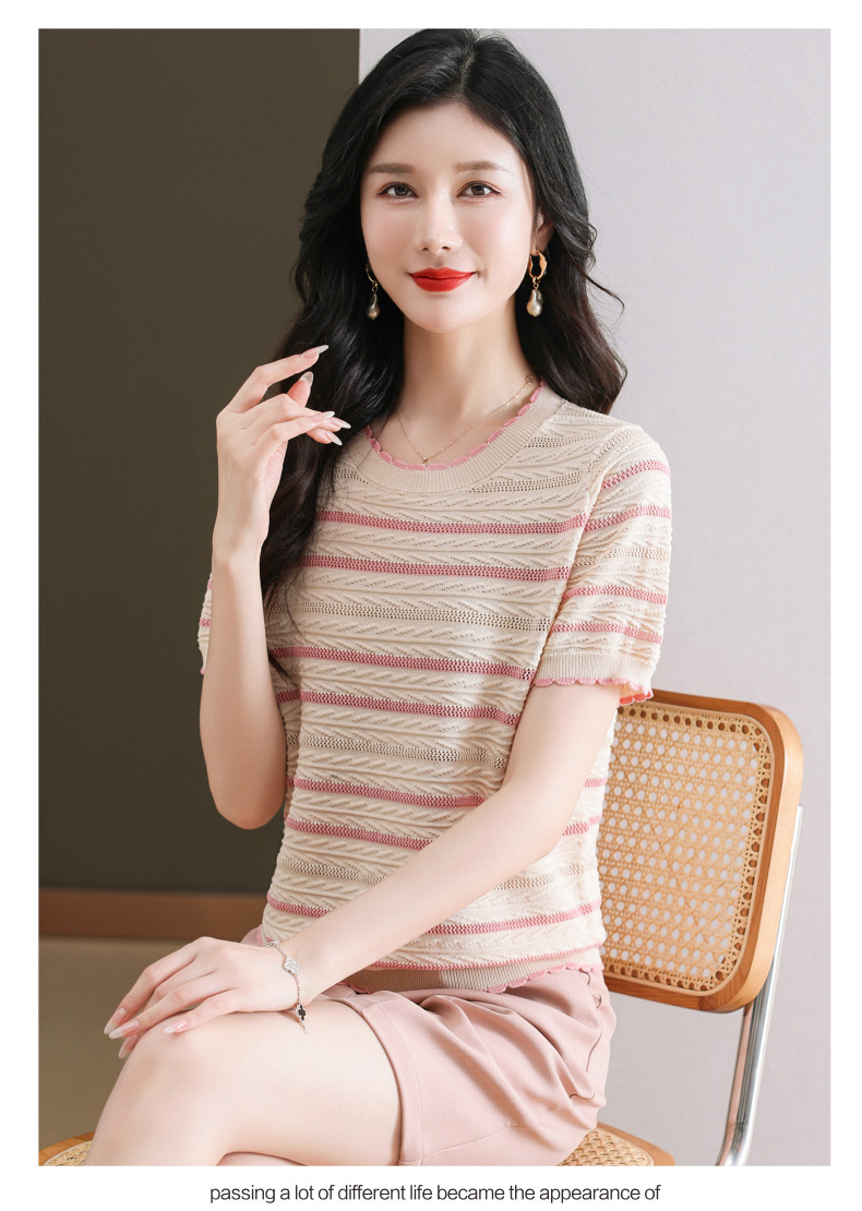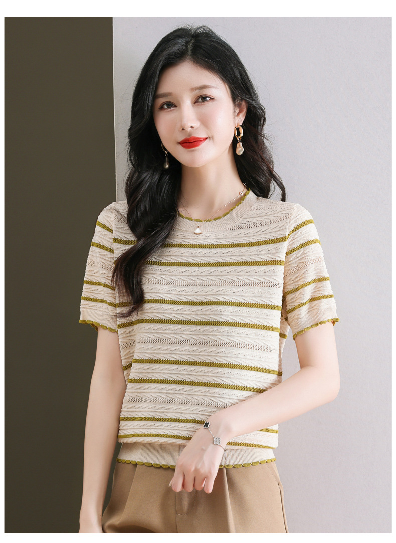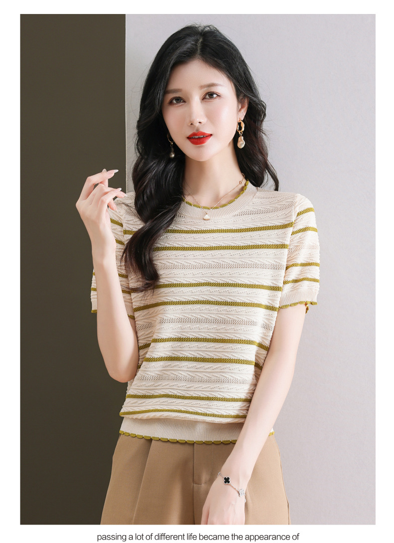 短袖针织减龄圆领,短款配裙子上衣冰丝条纹小衫CC-101-90325