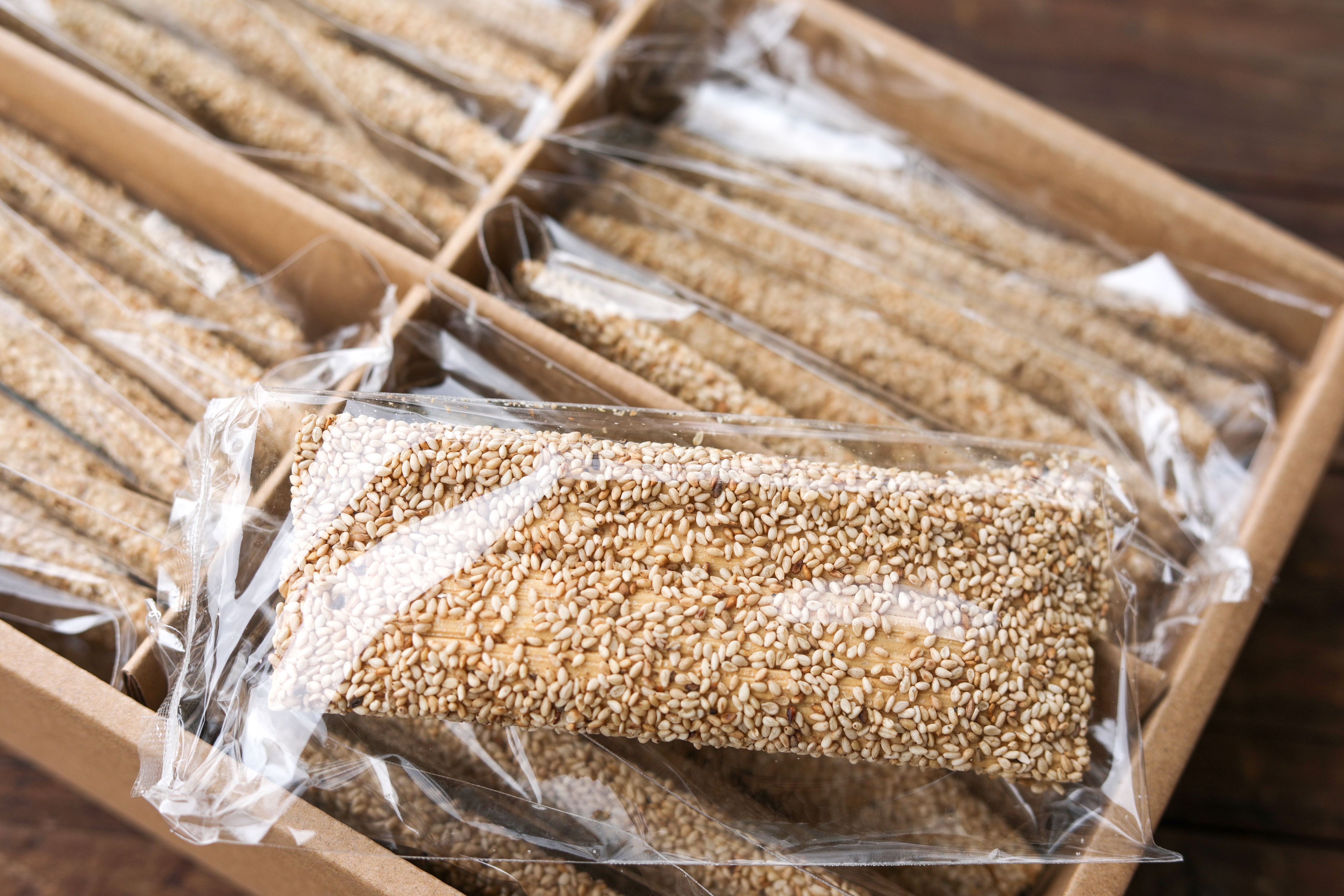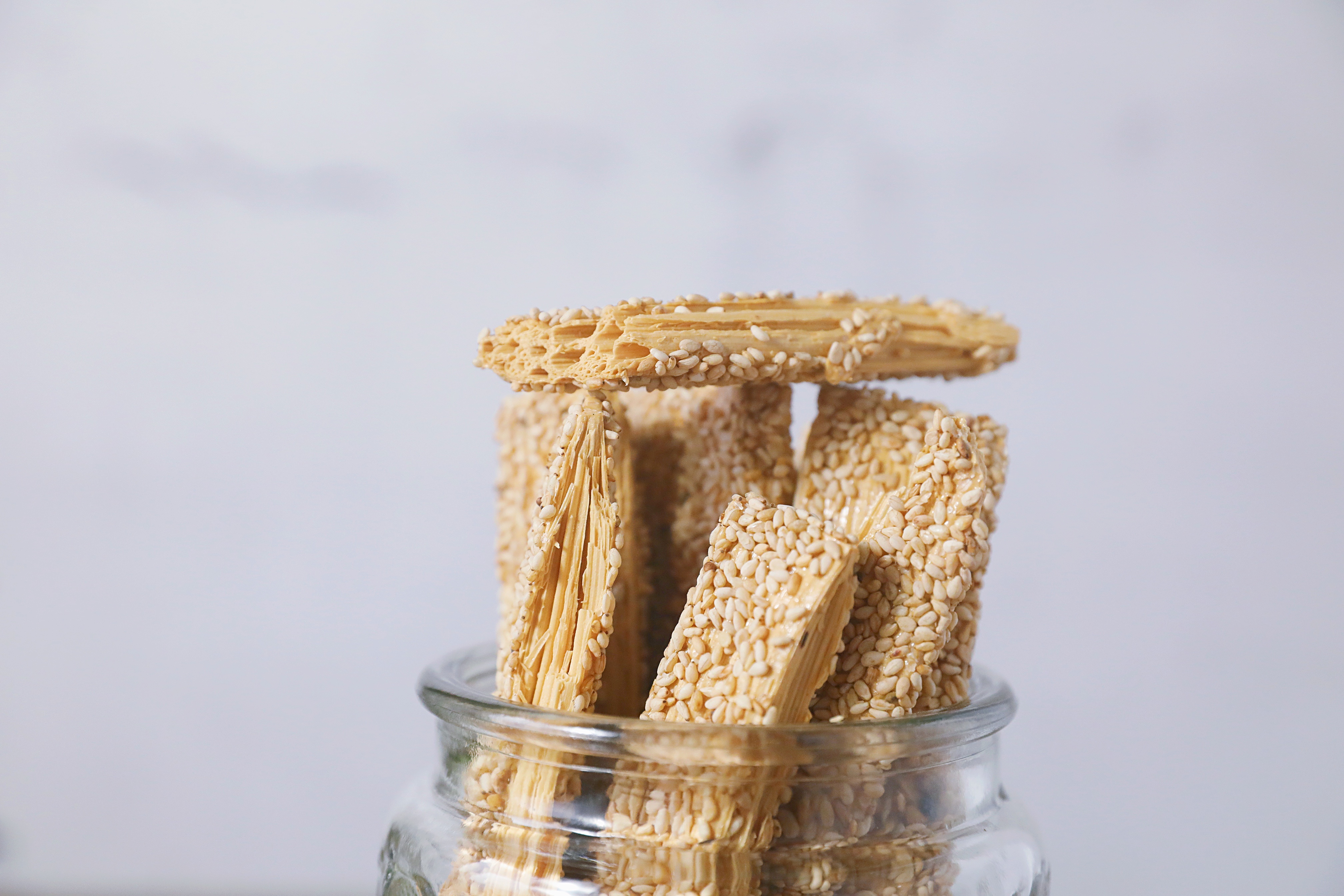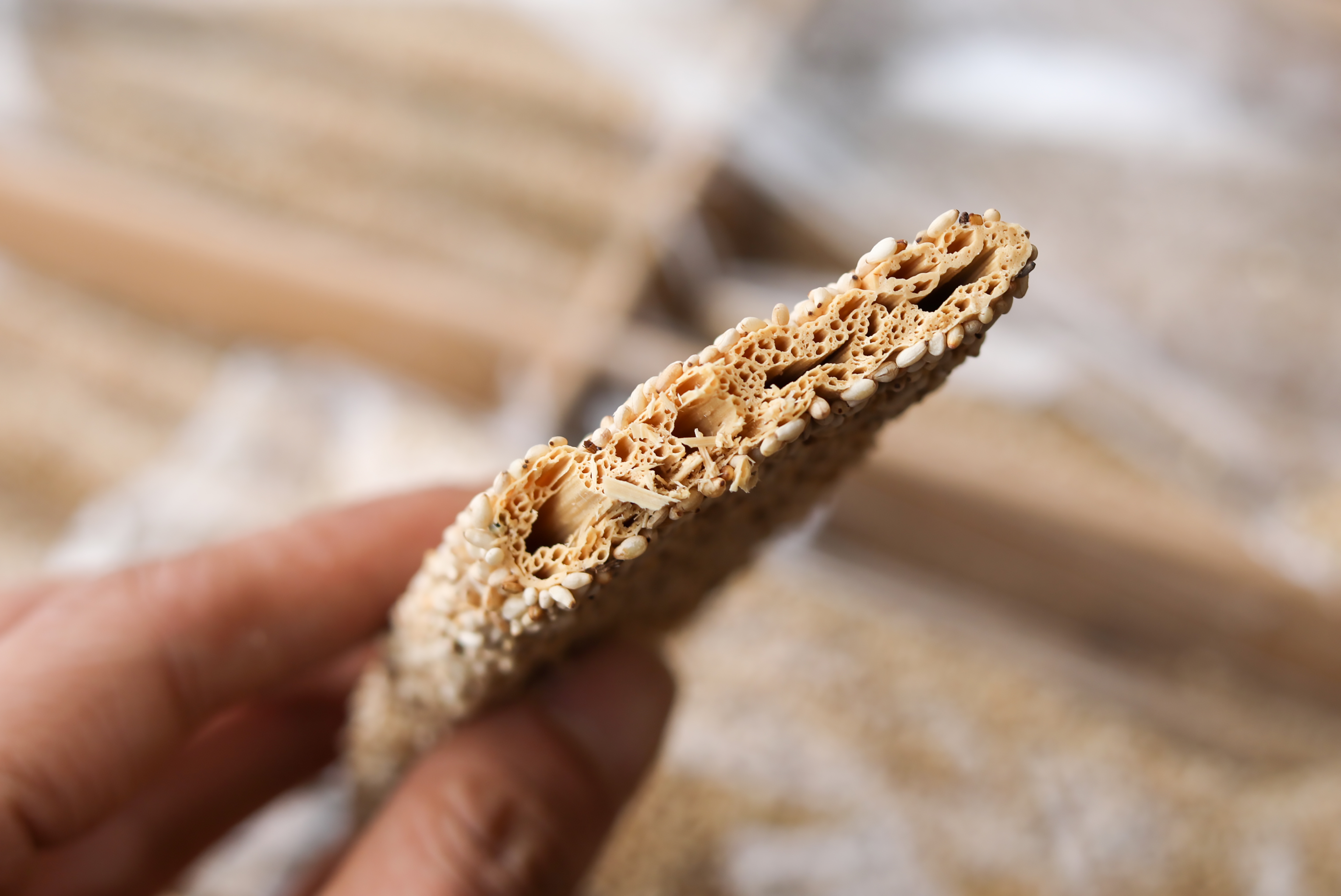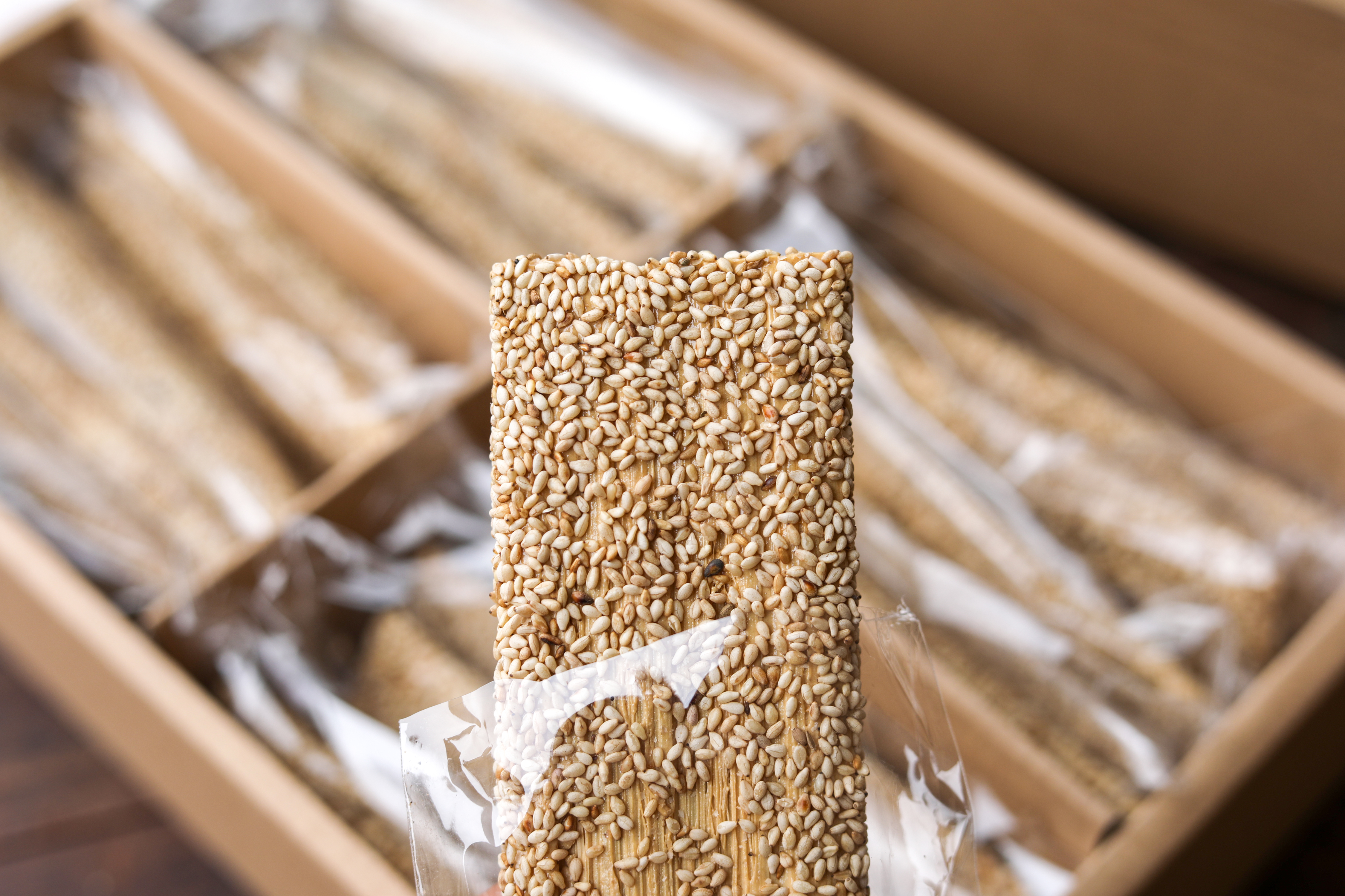 每一块芝麻糖中间都有很多个小孔,两端封口不通气,这些小孔带来的松脆感是—芝麻麦芽糖让人着迷的秘密!来感受一下它的酥脆度。