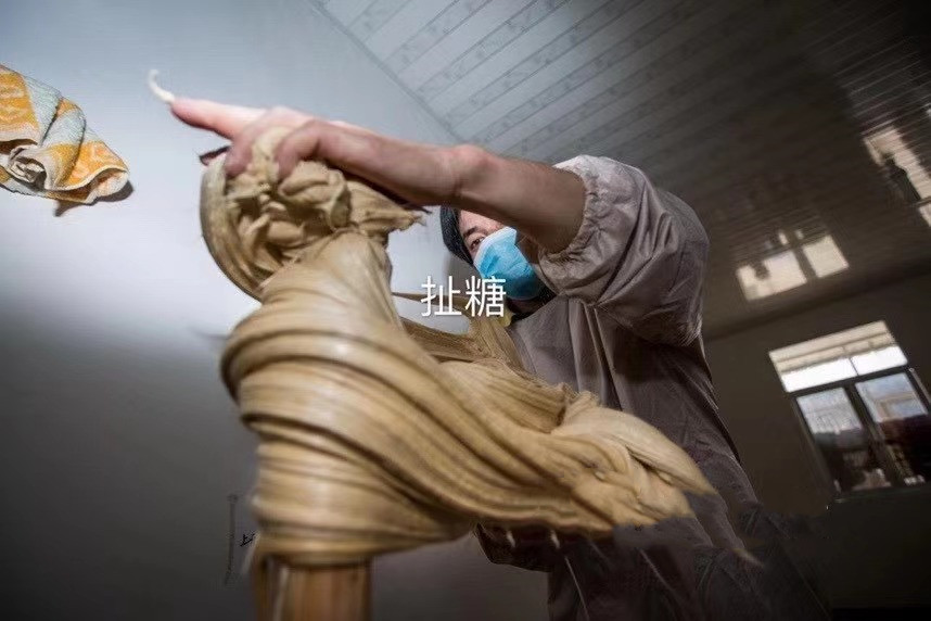 三个小时后,糖稀终于炒好了,接下来就是最后一道工序——“拔糖”。在高温高湿的屋子里,来回拉拽,一直到其呈现出韧性适中的条状,然后迅速的跑出屋子将拔好的糖拉成细条,稍微冷却后切成段。等到所有麦芽糖都被切割成型以后,再拿回到屋里沾点雾气,将表面弄湿以后,沾上芝麻就完成了!