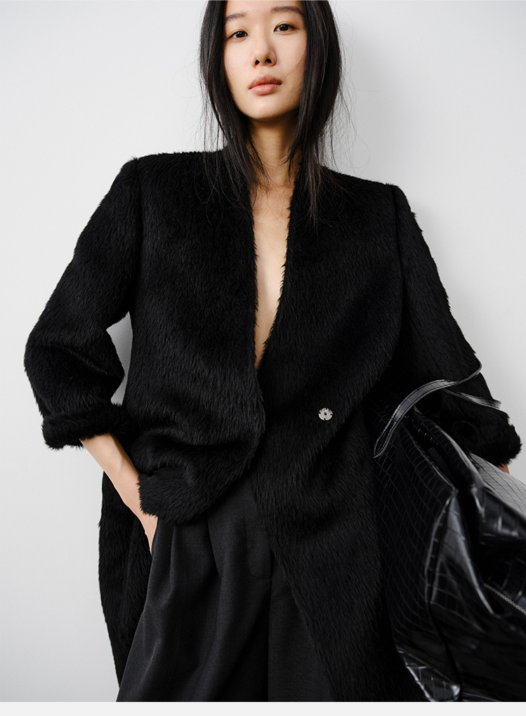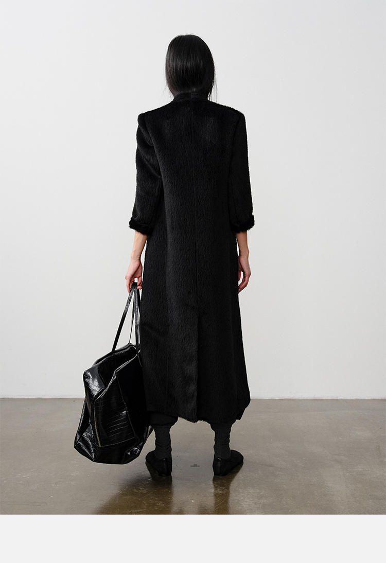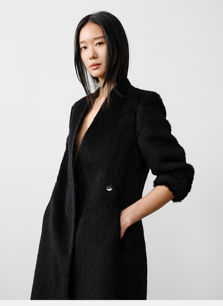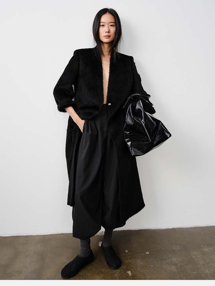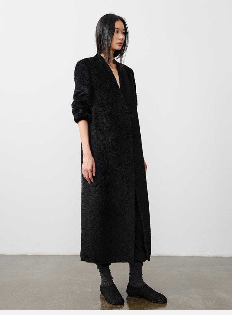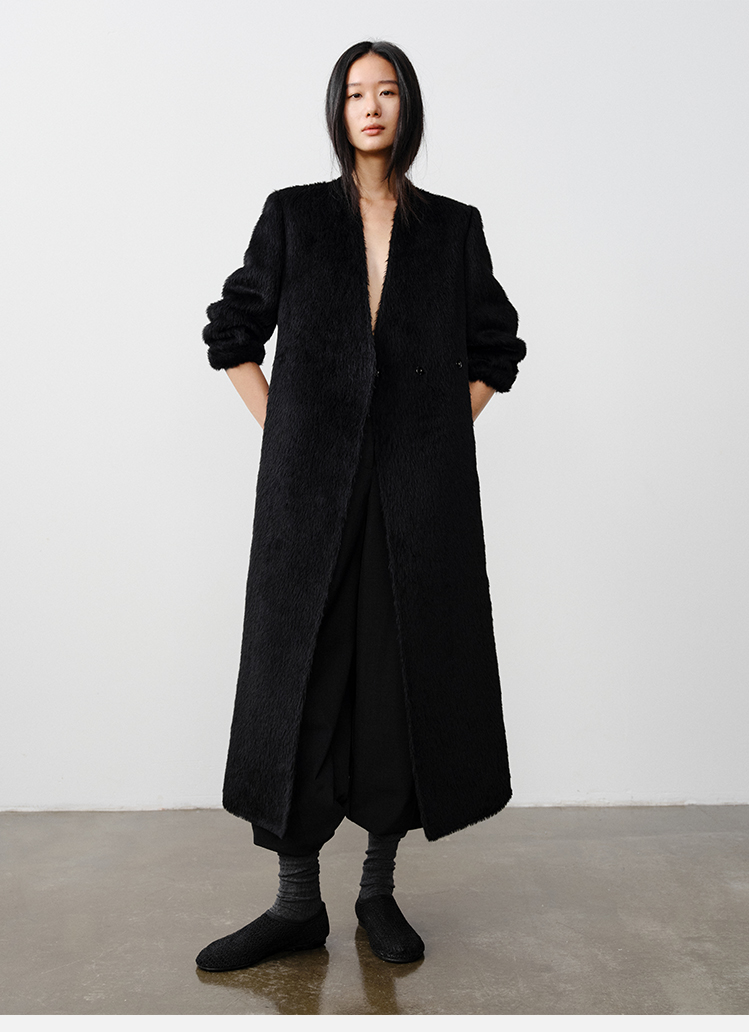 HIDEMI 双面alpaca长毛苏力羊驼毛V领无领式不对称长款西装大衣