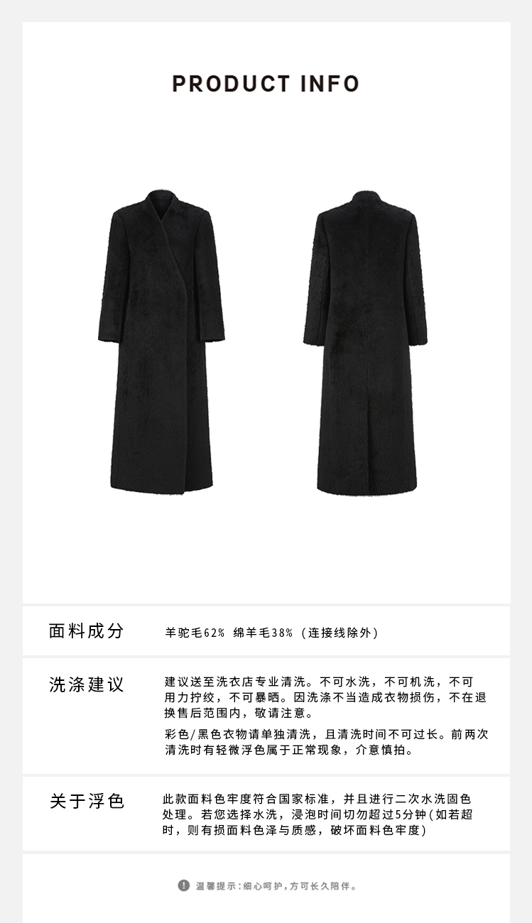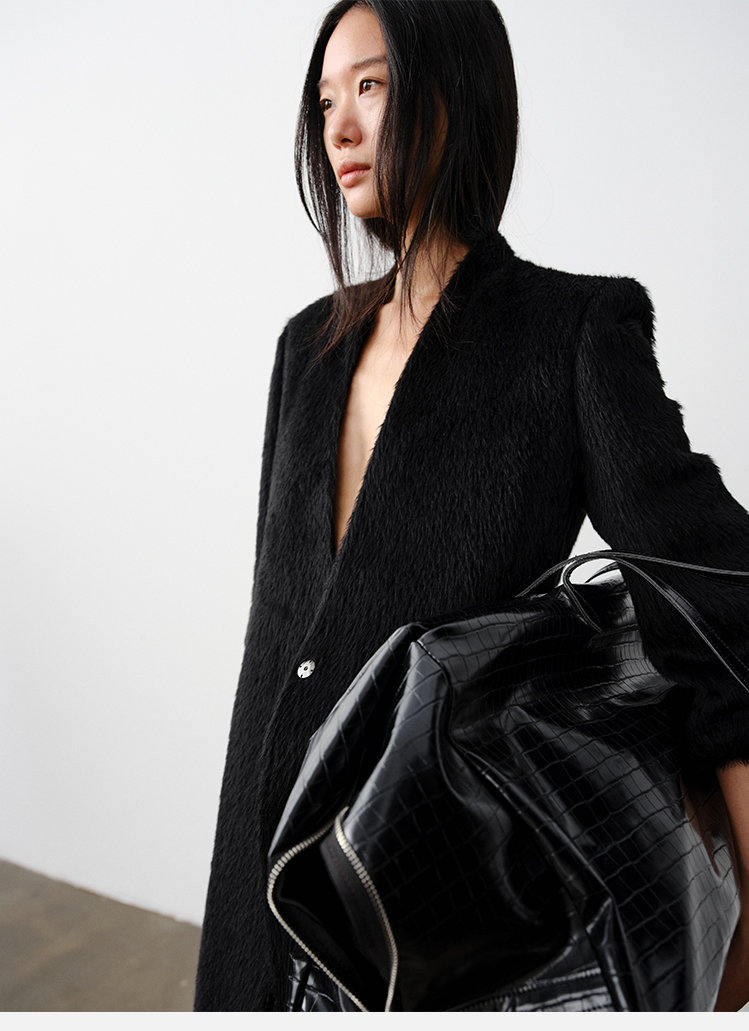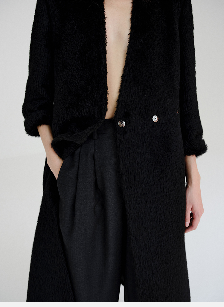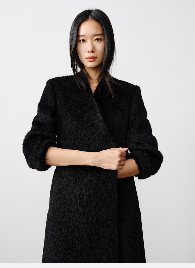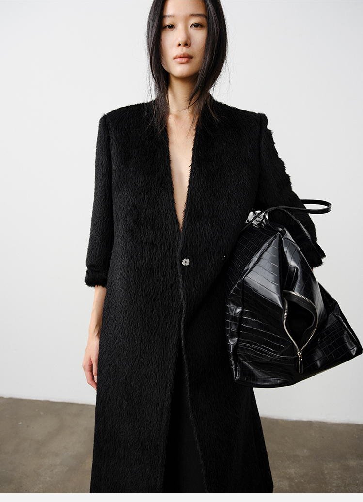 HIDEMI 双面alpaca长毛苏力羊驼毛V领无领式不对称长款西装大衣