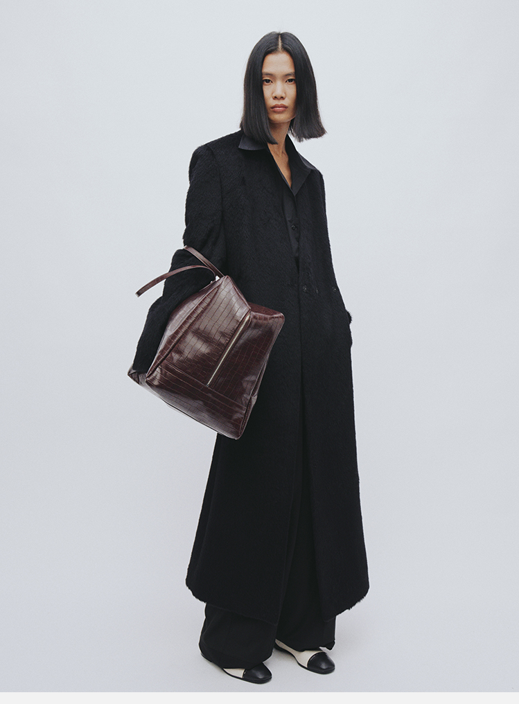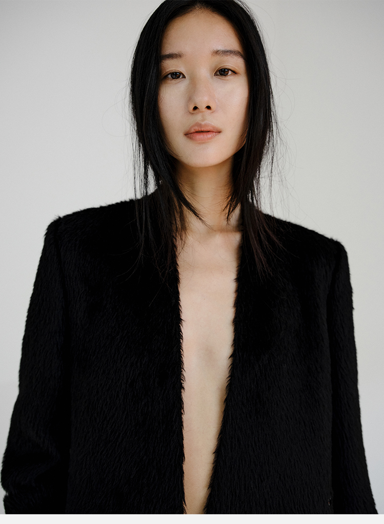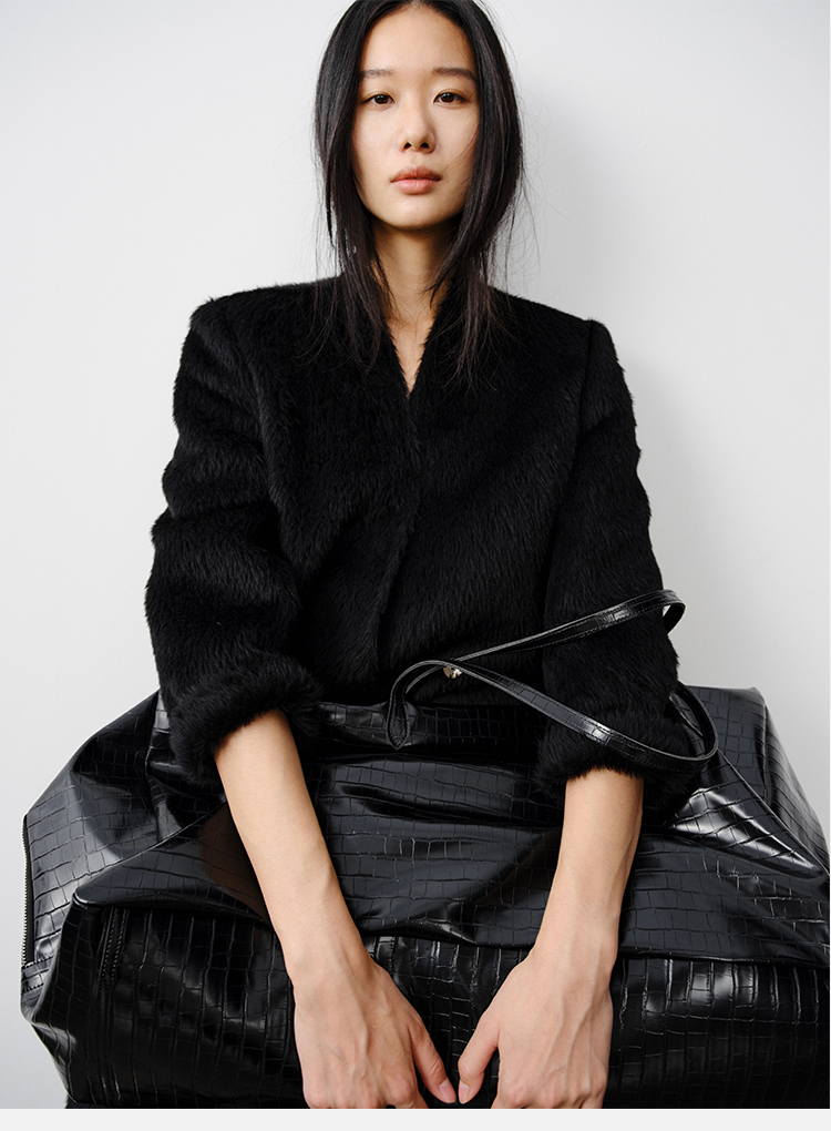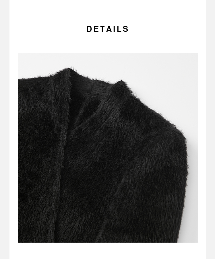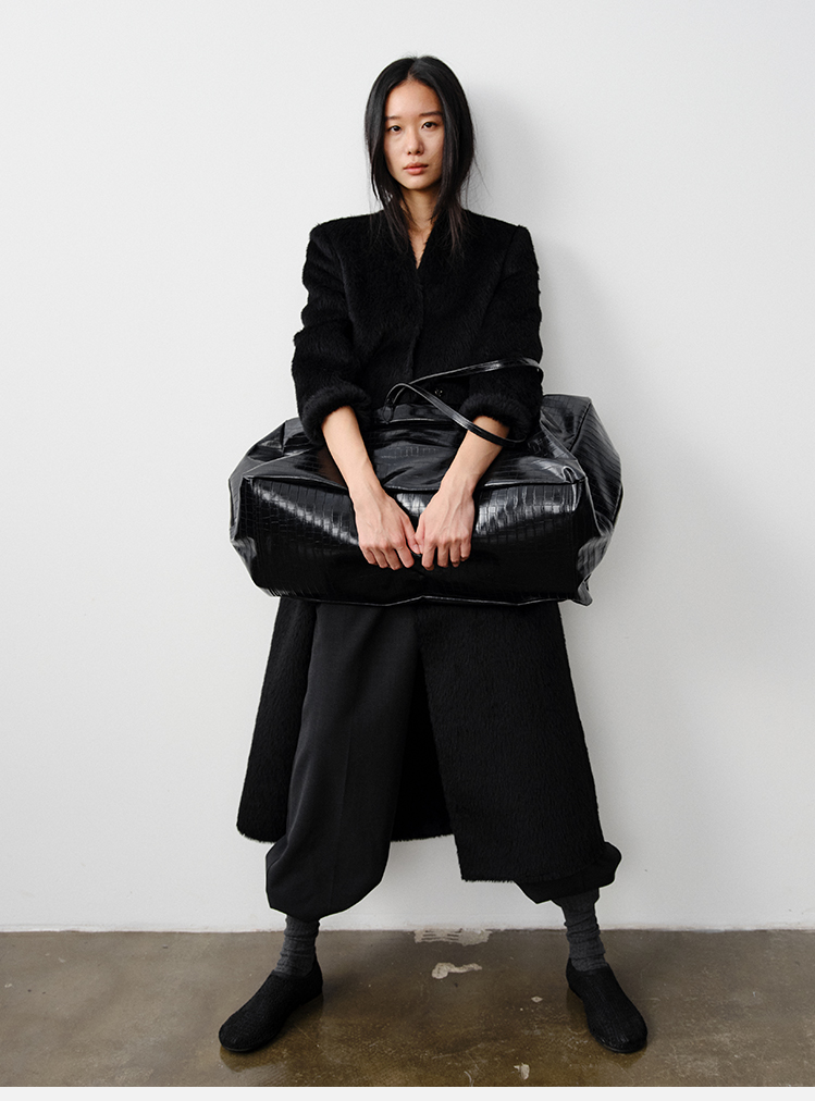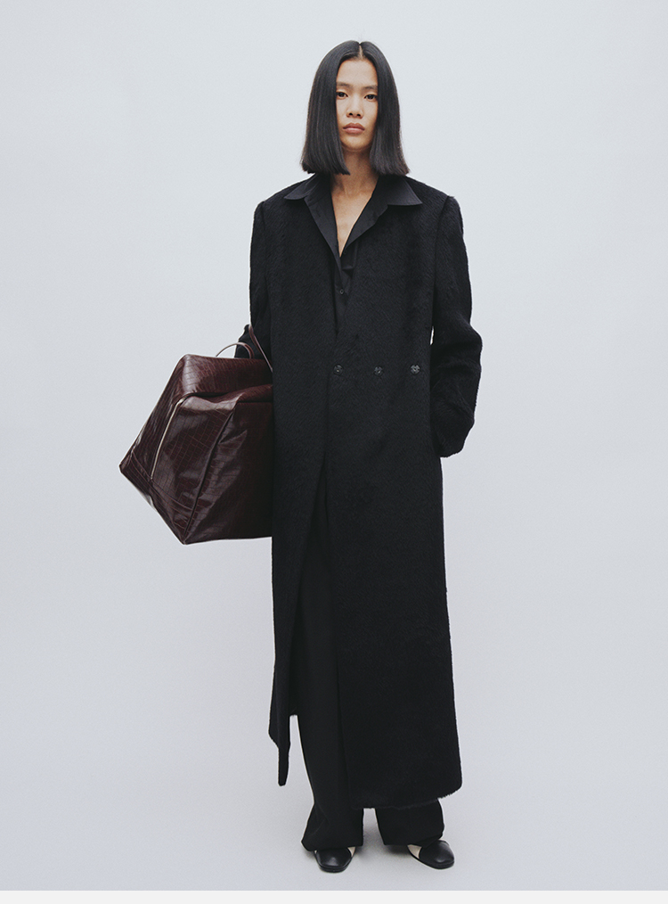HIDEMI 双面alpaca长毛苏力羊驼毛V领无领式不对称长款西装大衣