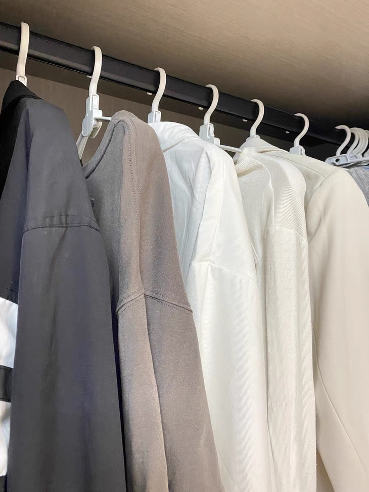 内衣吊带到围巾到冬天大几斤重的棉服 都能靠它挂住🧥 所以不仅是出门在外住的民宿酒店了 家里用来专门收纳大件衣物、小领口衣物的衣柜里已经全是这款衣架的战绩 在塞得满满当当的衣柜里这种衣架真的比常规款更具适配性 只要按动它的收缩按钮能把衣服轻松取下✔ 不用硬取硬塞费力,把旁边捋得好好的衣服蹭乱