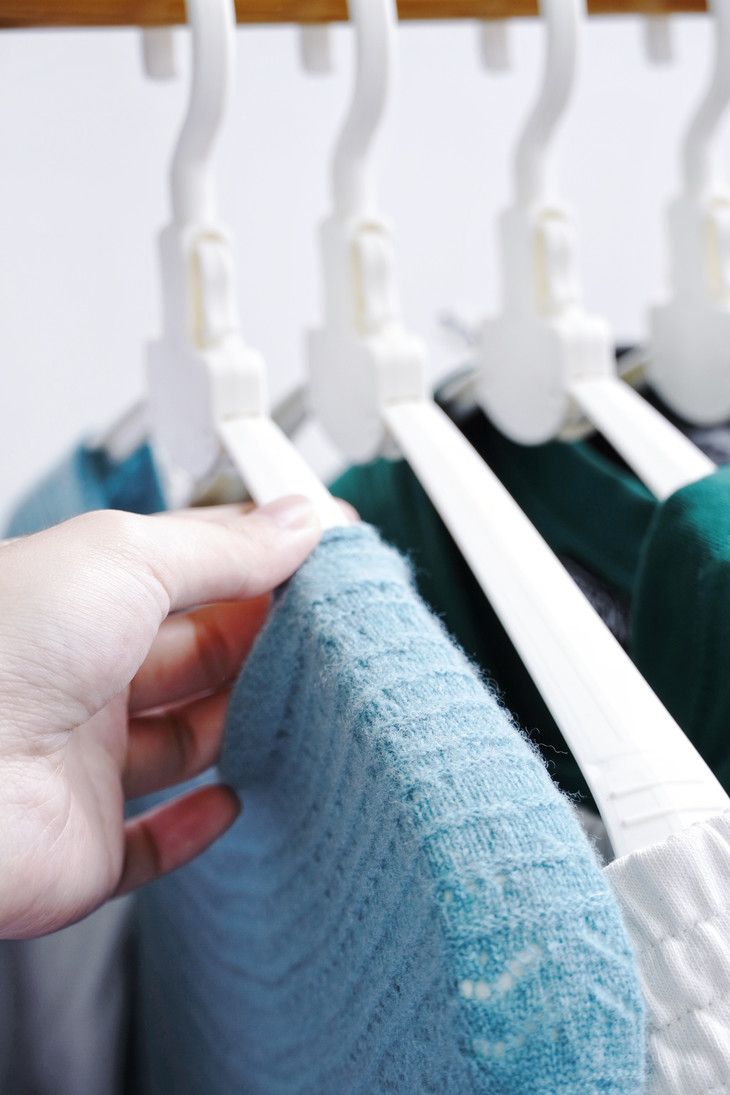 使用常规衣架 不想撑扯到领口就要从衣摆进出,真有点麻烦 正肩的肩袖部分还会被顶尖错位