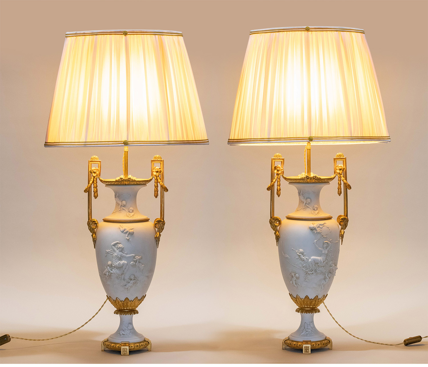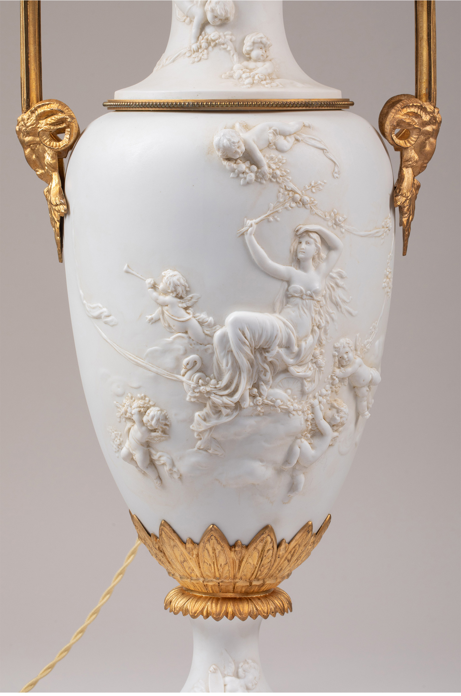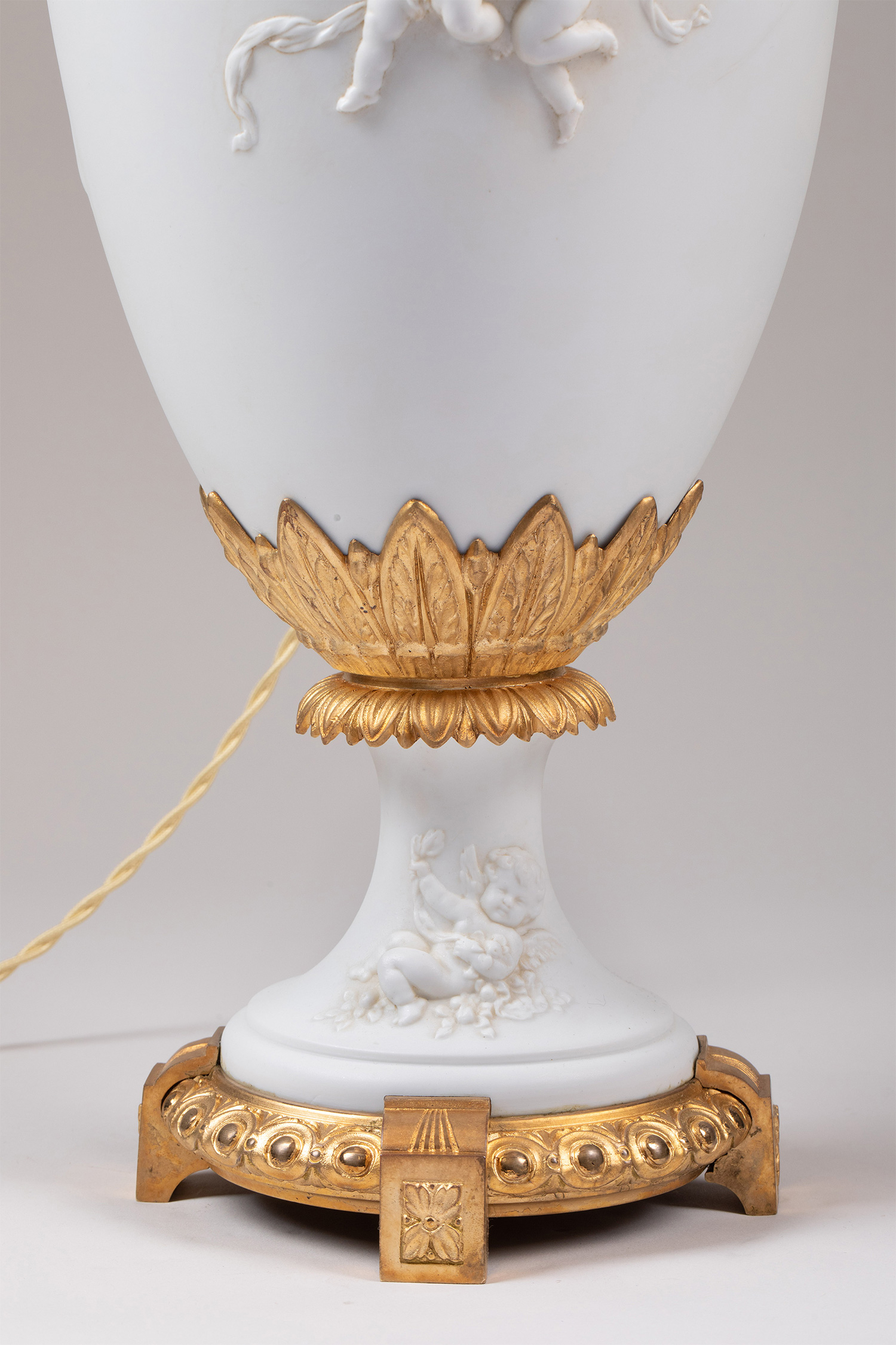 19世纪末法国出品铜鎏金精雕装饰古典女神与天使主题素胎瓷花瓶台灯一对