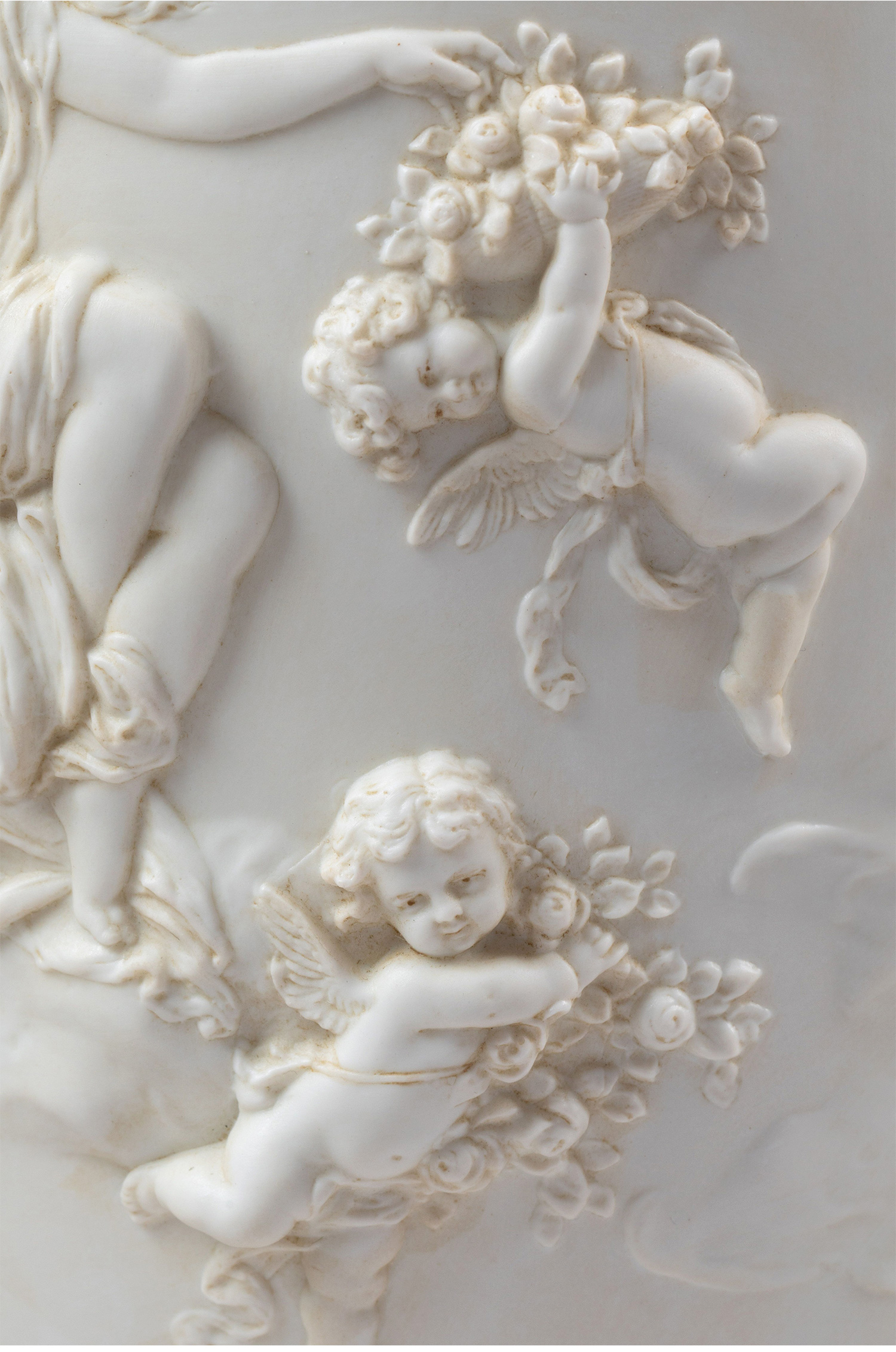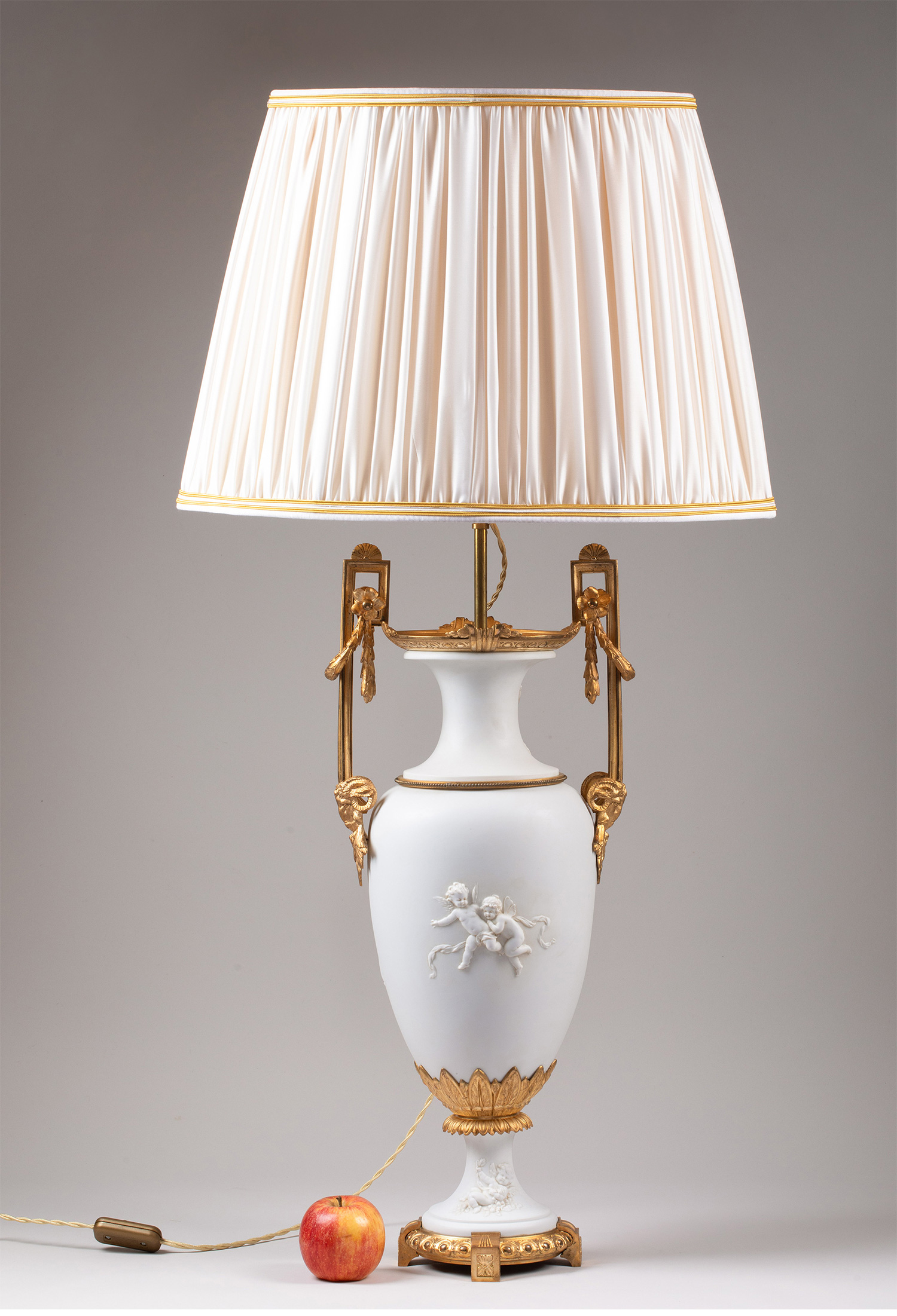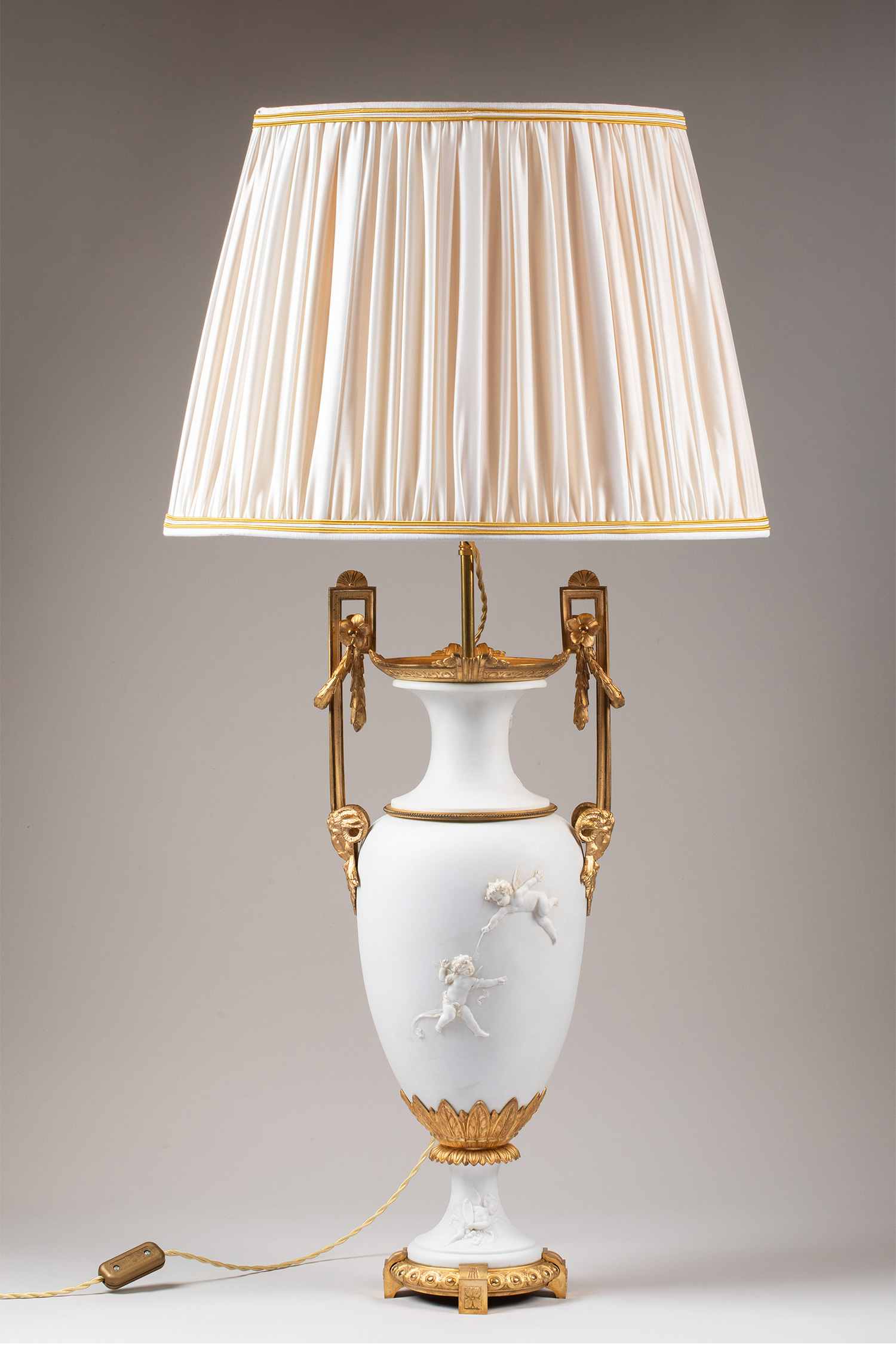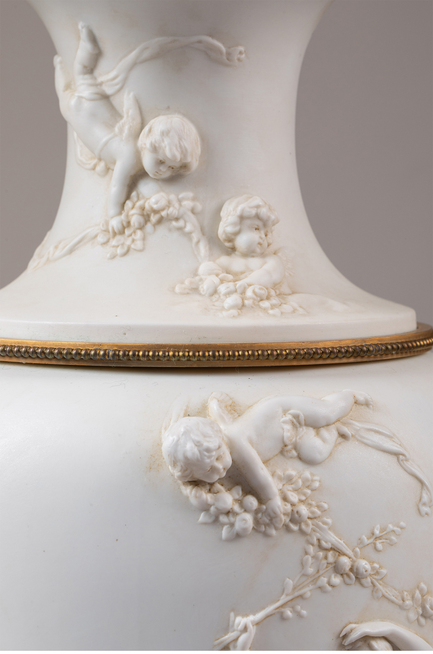 19世纪末法国出品铜鎏金精雕装饰古典女神与天使主题素胎瓷花瓶台灯一对