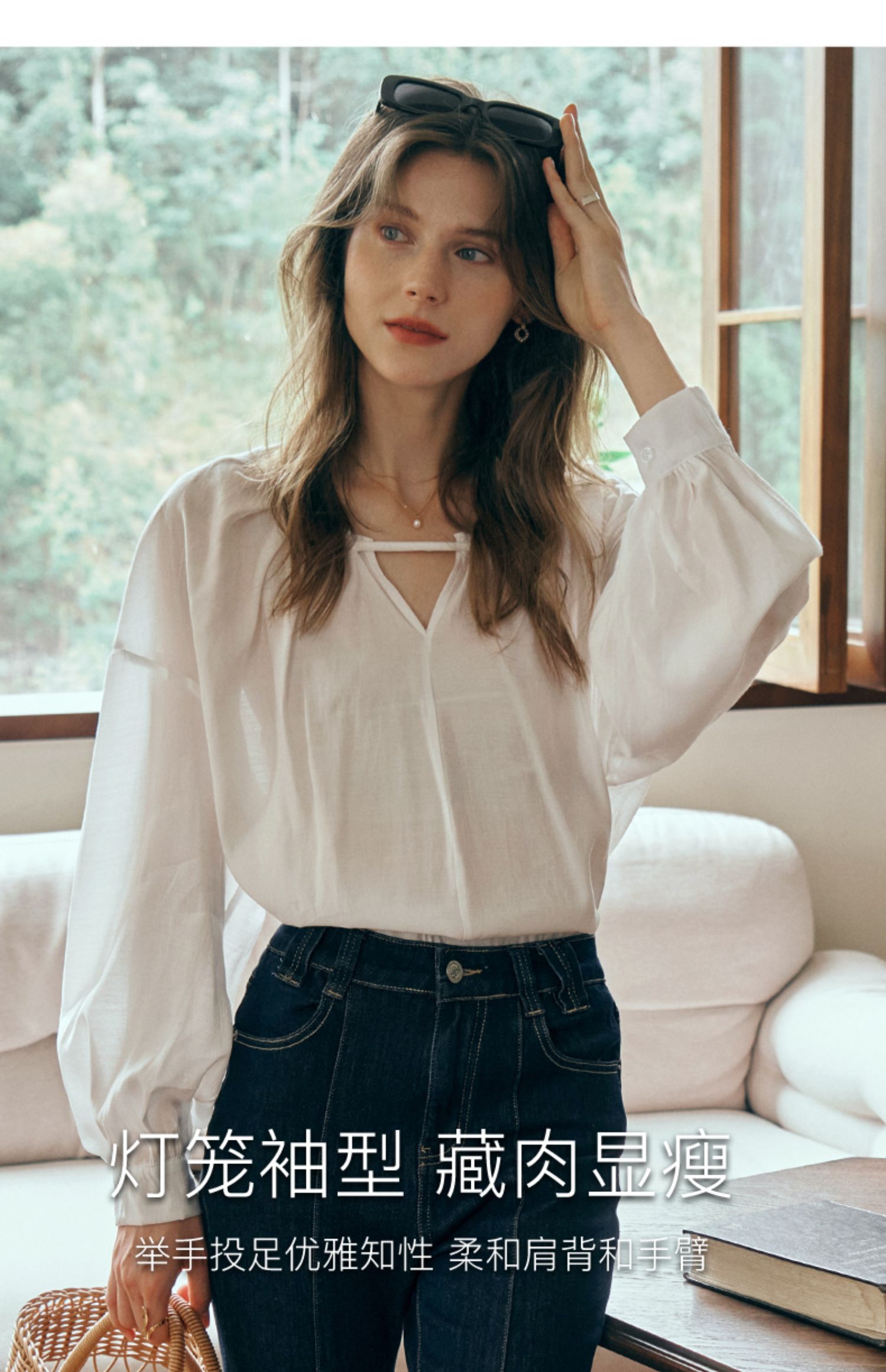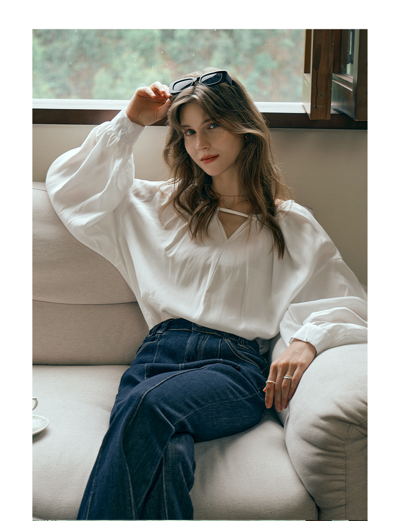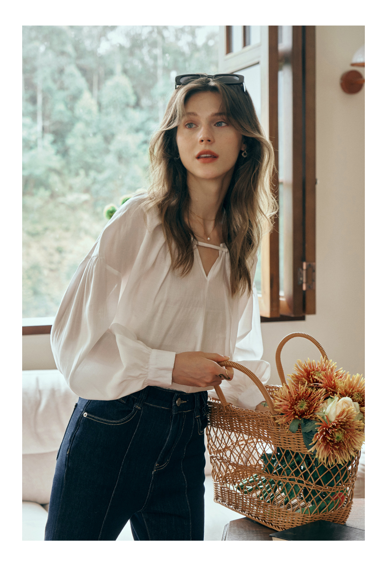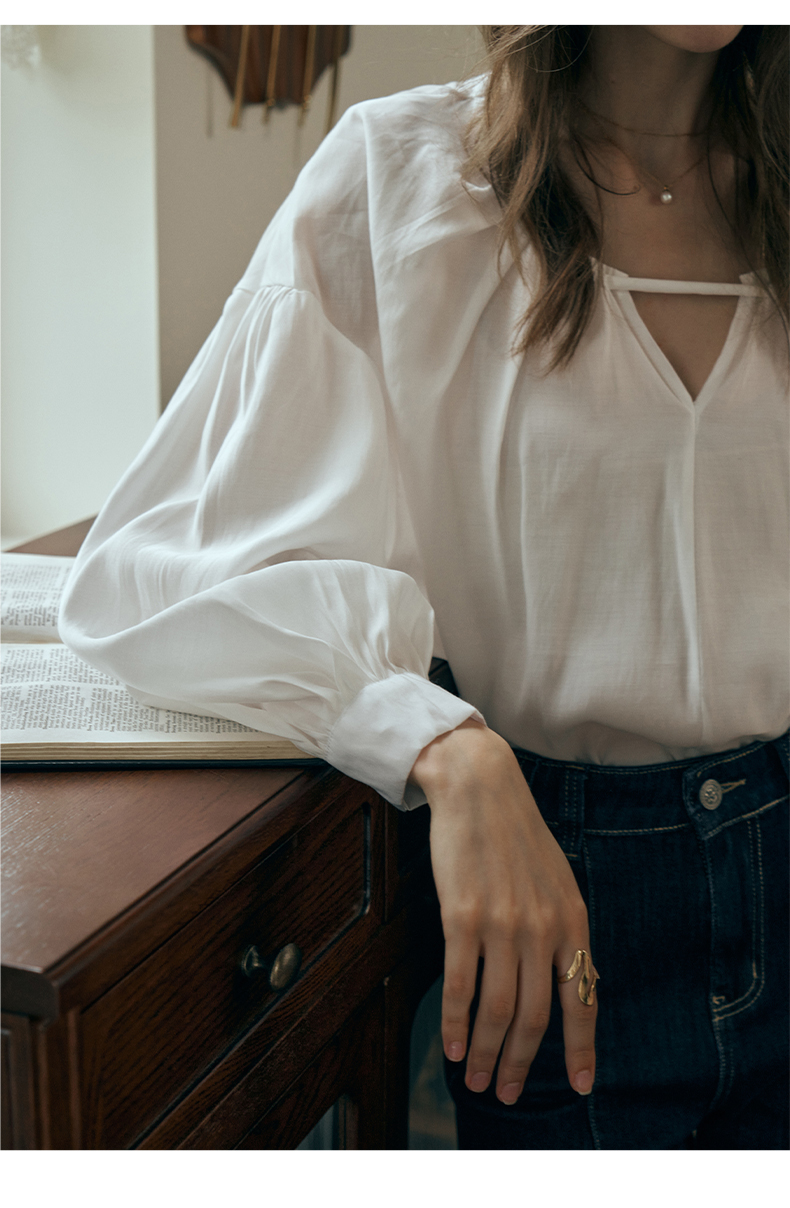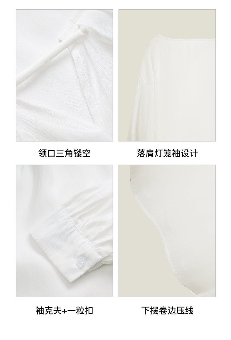 OLrain欧芮儿米白色蕾丝雪纺衫女初秋2023新款法式宽松灯笼袖小衫