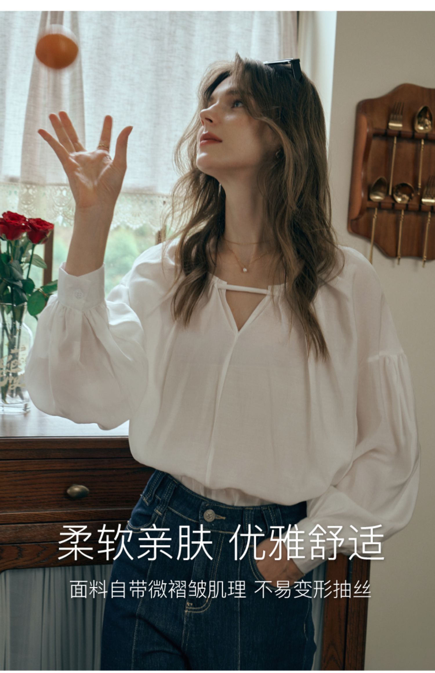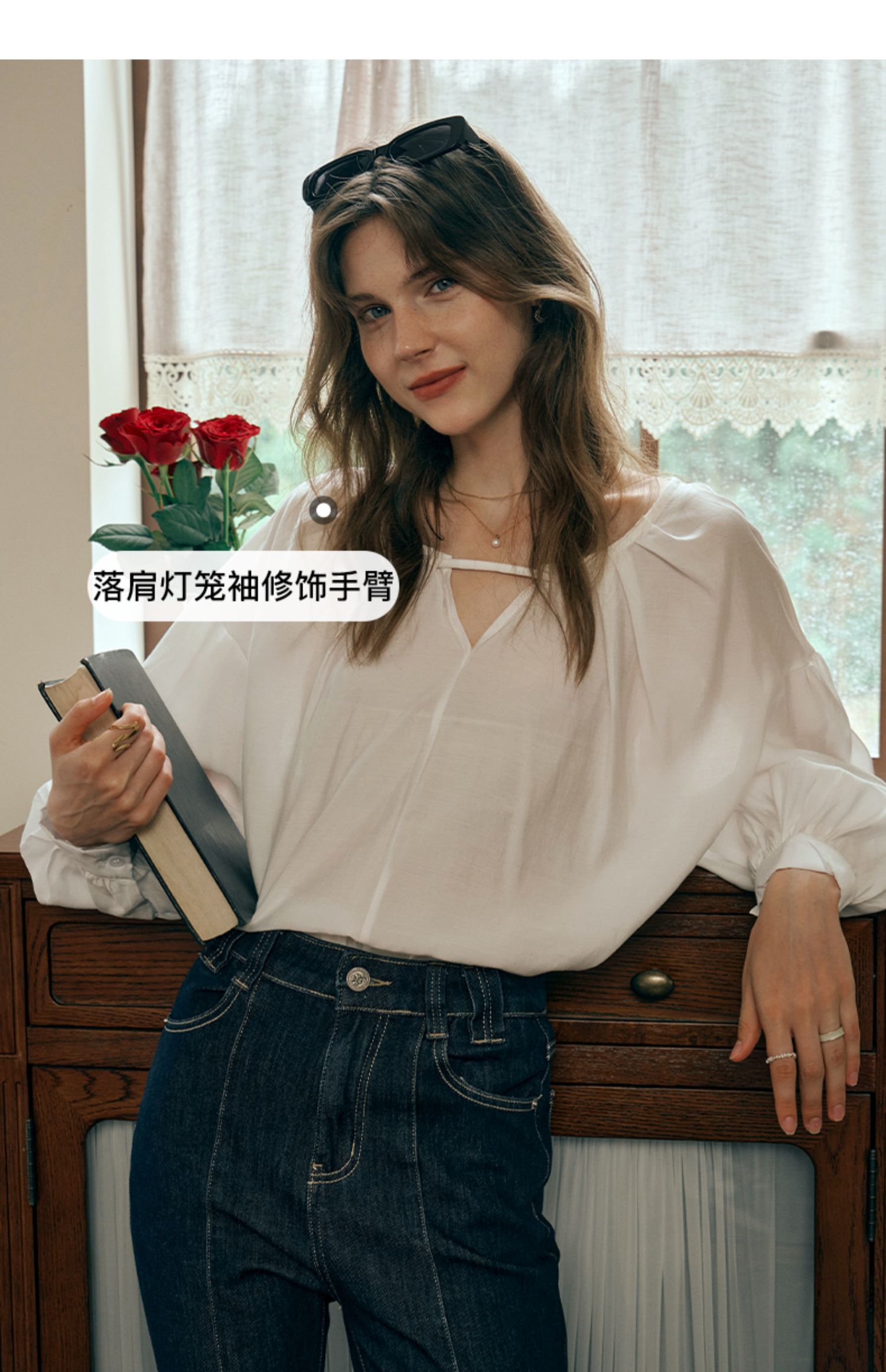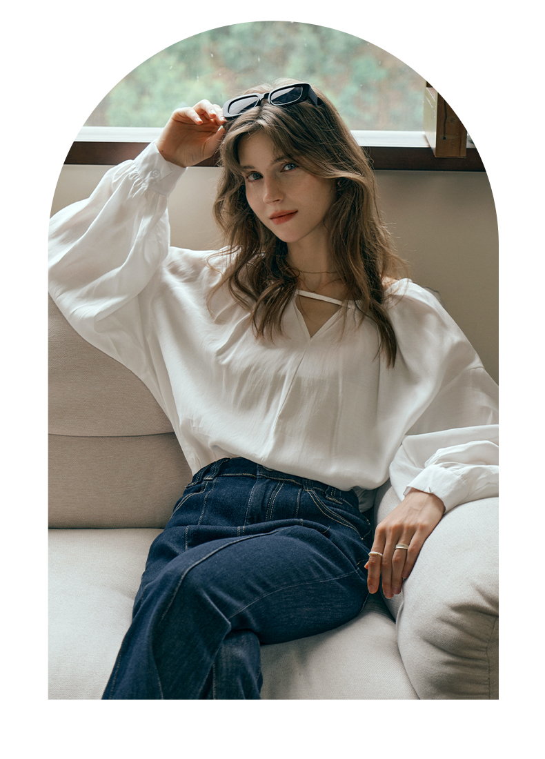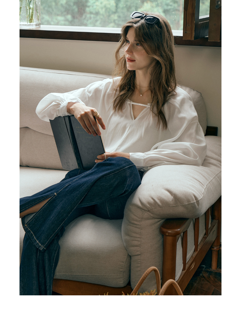 OLrain欧芮儿米白色蕾丝雪纺衫女初秋2023新款法式宽松灯笼袖小衫