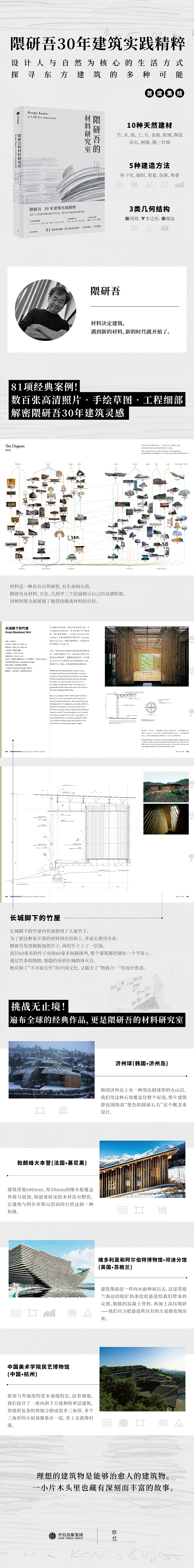在《隈研吾的材料研究室》中,隈研吾公开了自己近二十年的建筑实践精粹。本书按照10种材料将作品分类,囊括81项经典案例,数百张高清照片、手绘草图及细节图纸,深入剖析隈研吾运用材料的技艺和神髓,带领我们深入东方建筑的另一种可能。