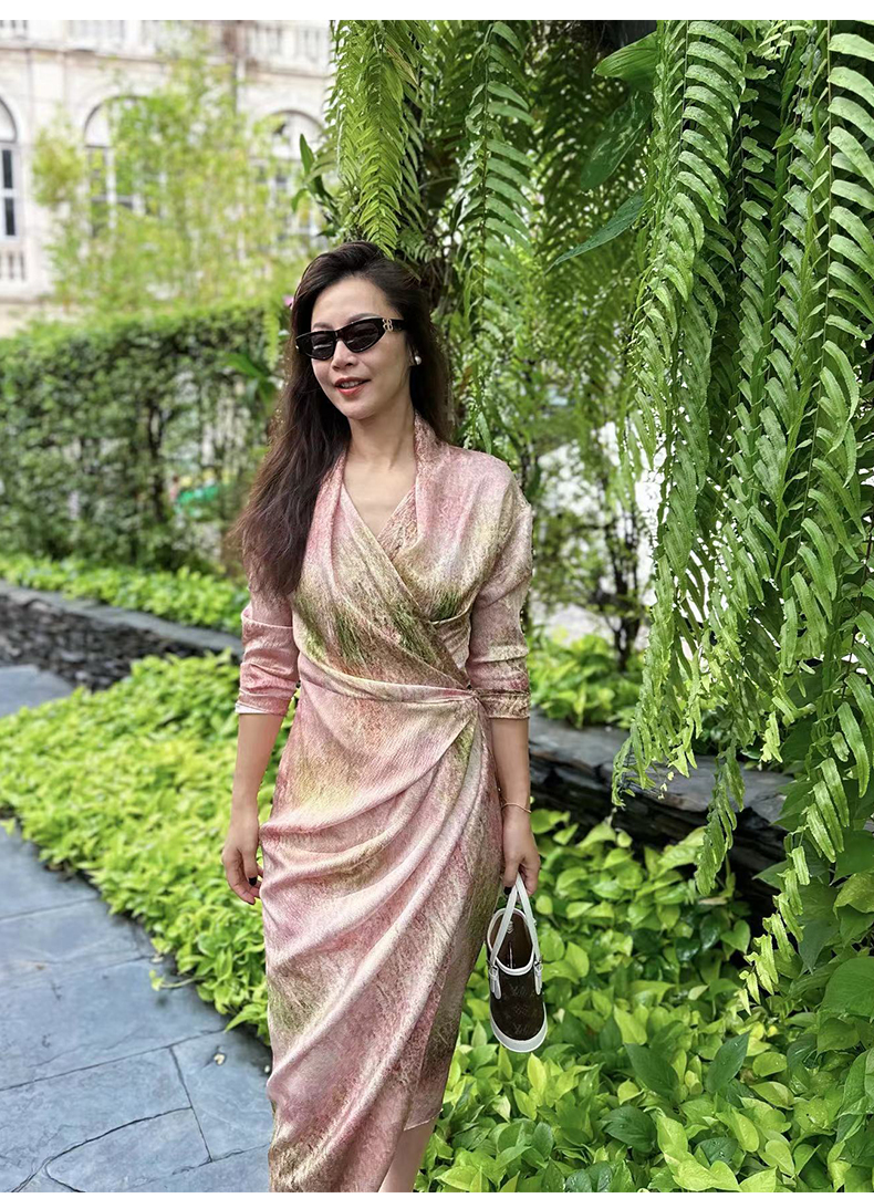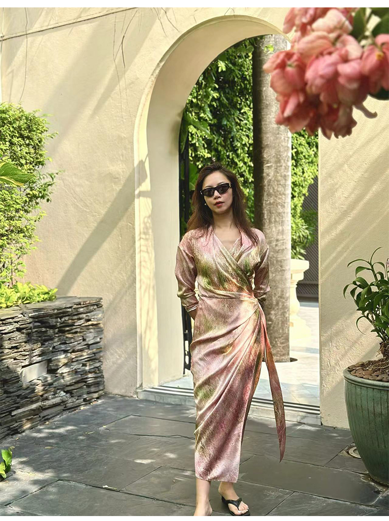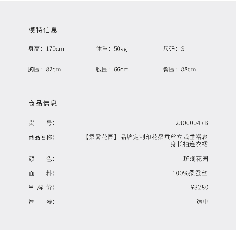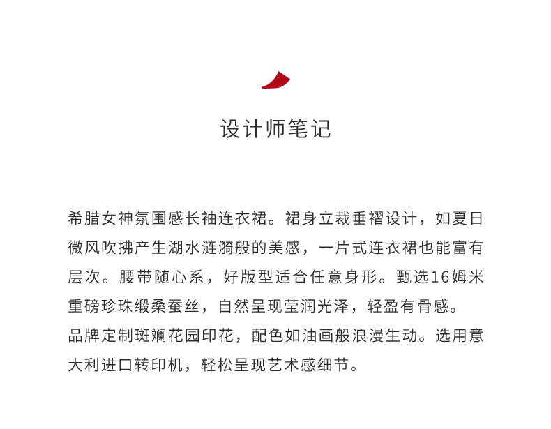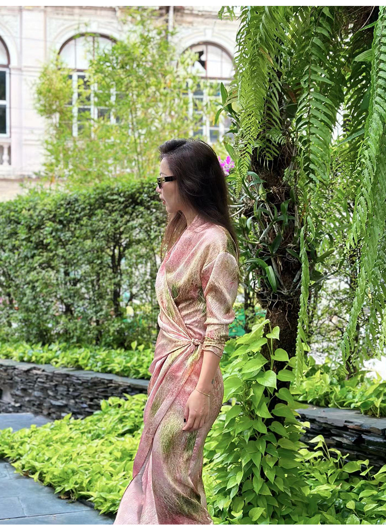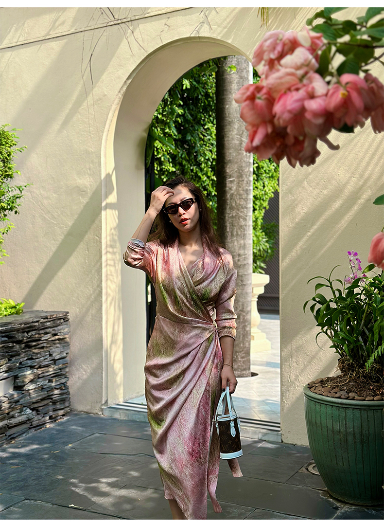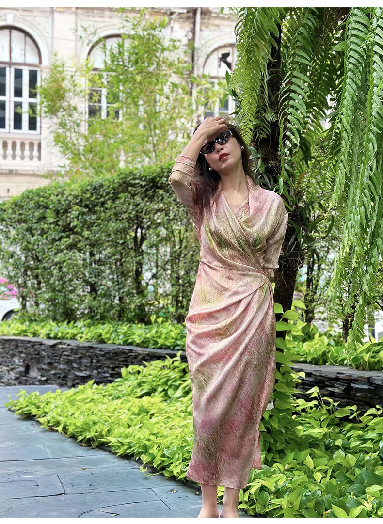 【柔雾花园】品牌定制印花桑蚕丝立裁垂褶裹身长袖连衣裙/23000047B