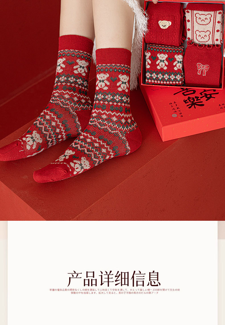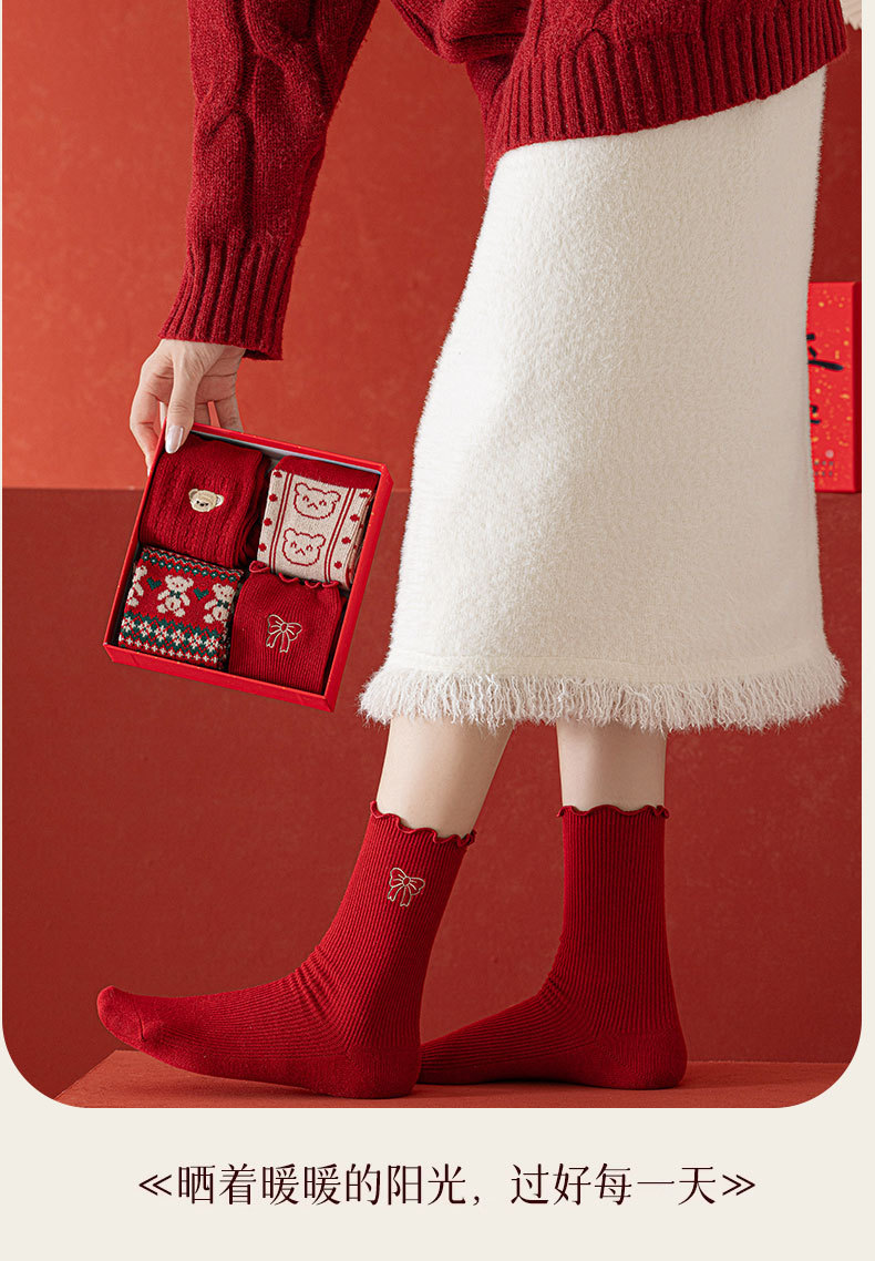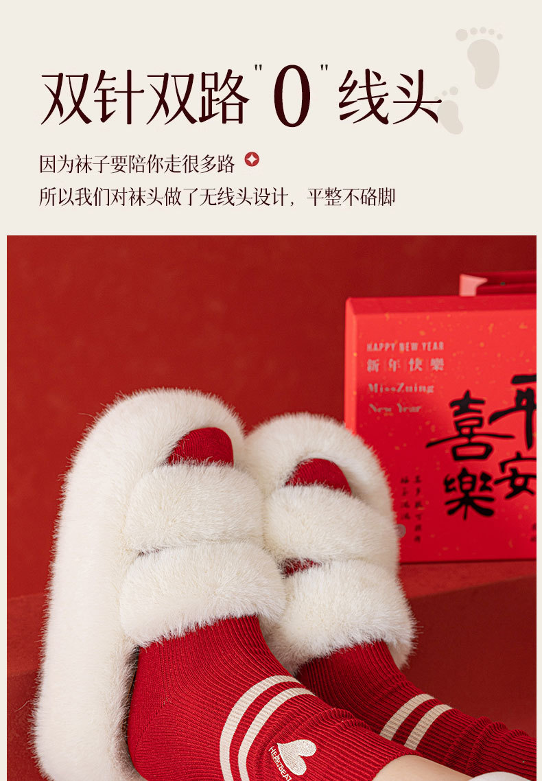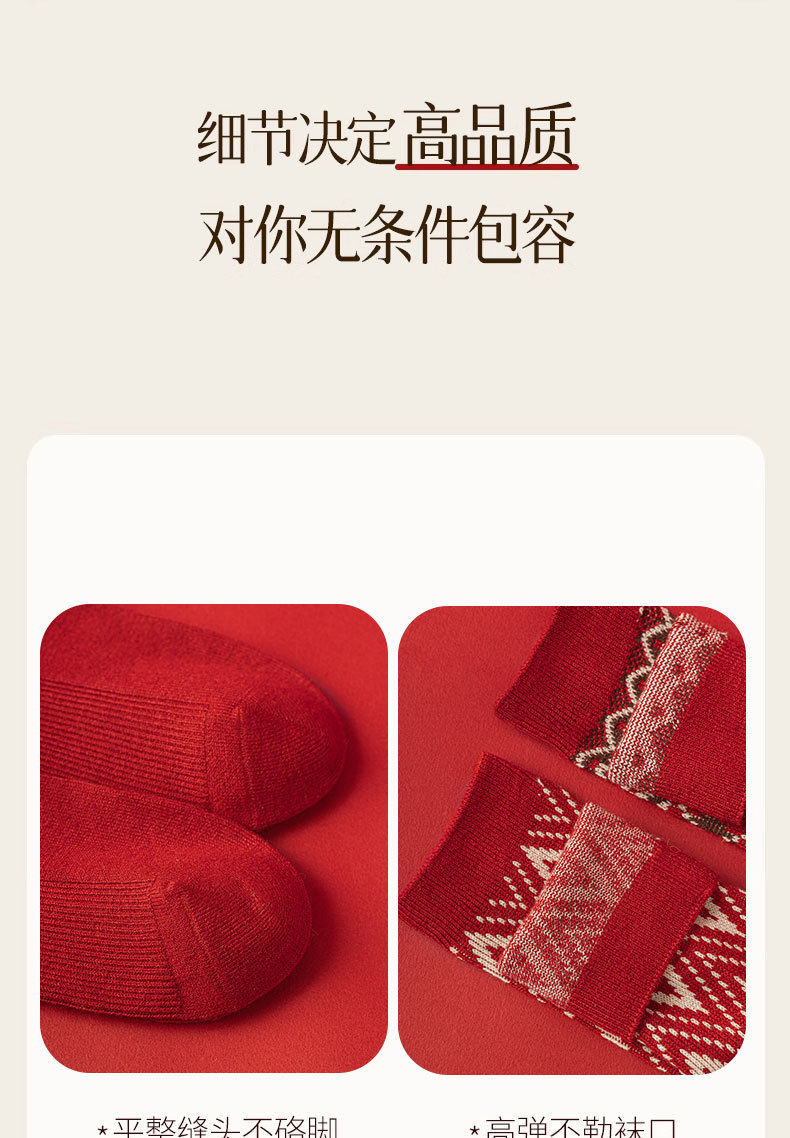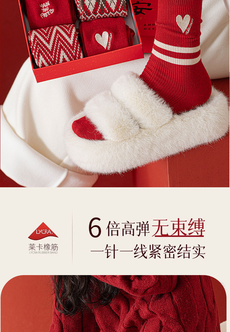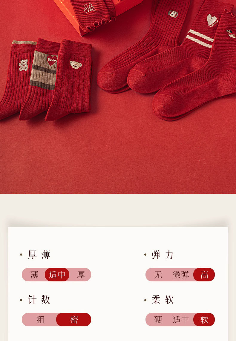 【礼盒装马年本命年红袜子】女款秋冬季纯棉袜 双针双路大红色新年礼物