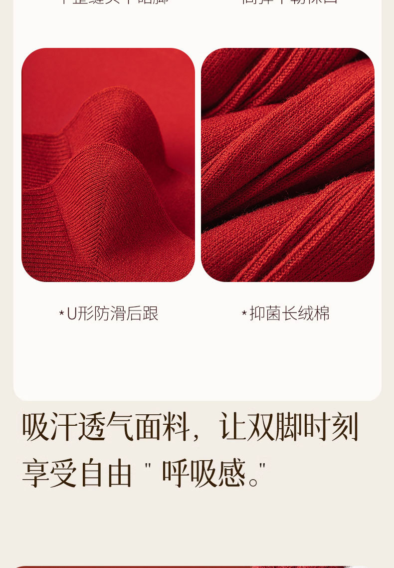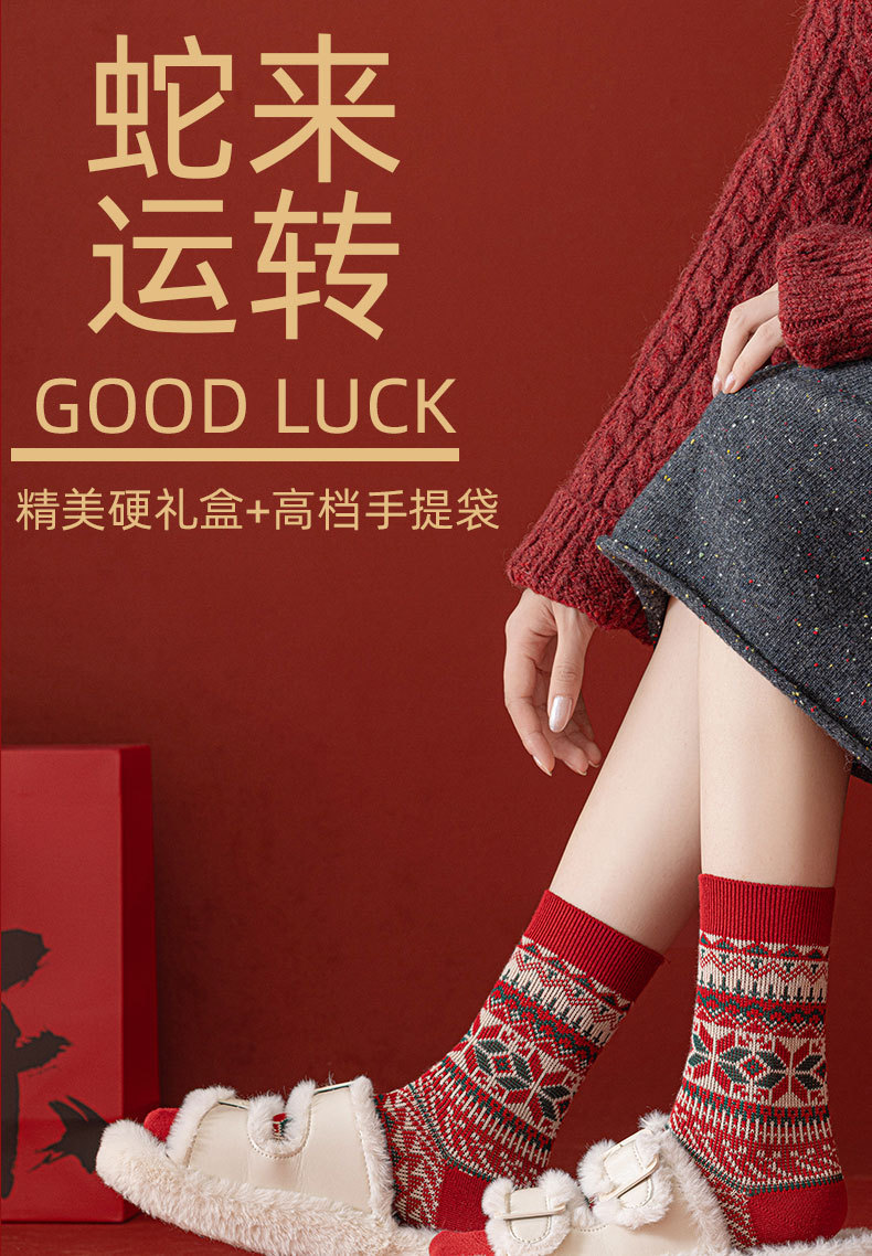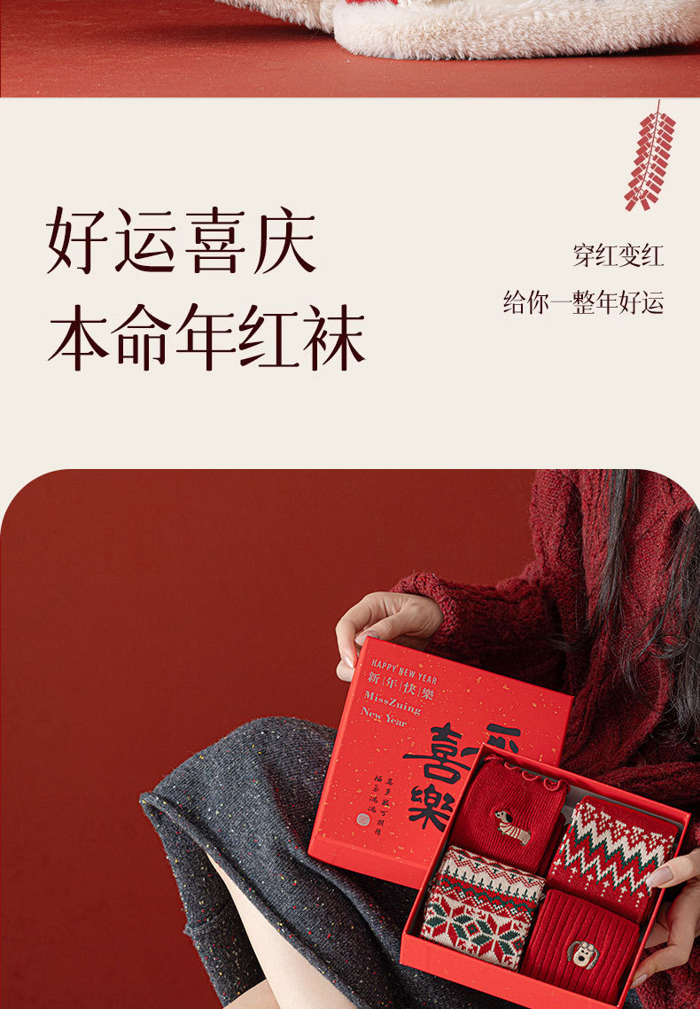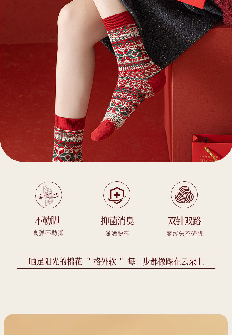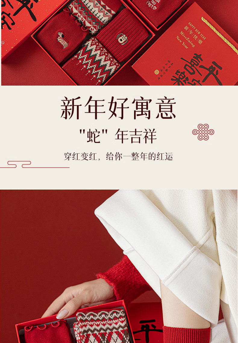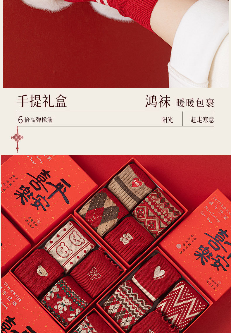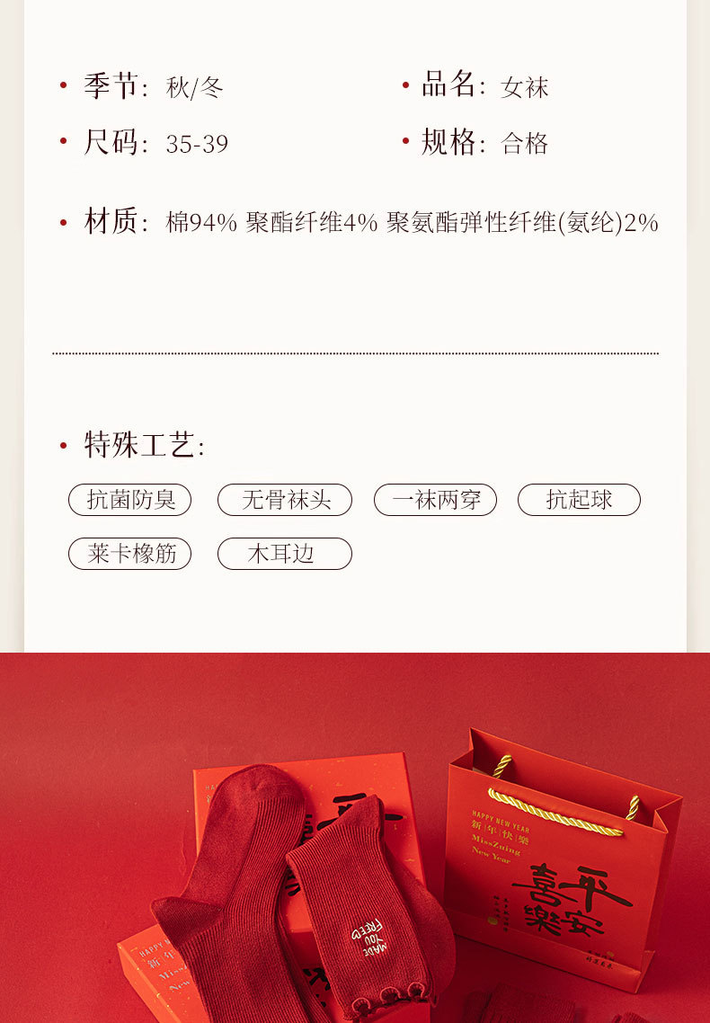 【礼盒装马年本命年红袜子】女款秋冬季纯棉袜 双针双路大红色新年礼物