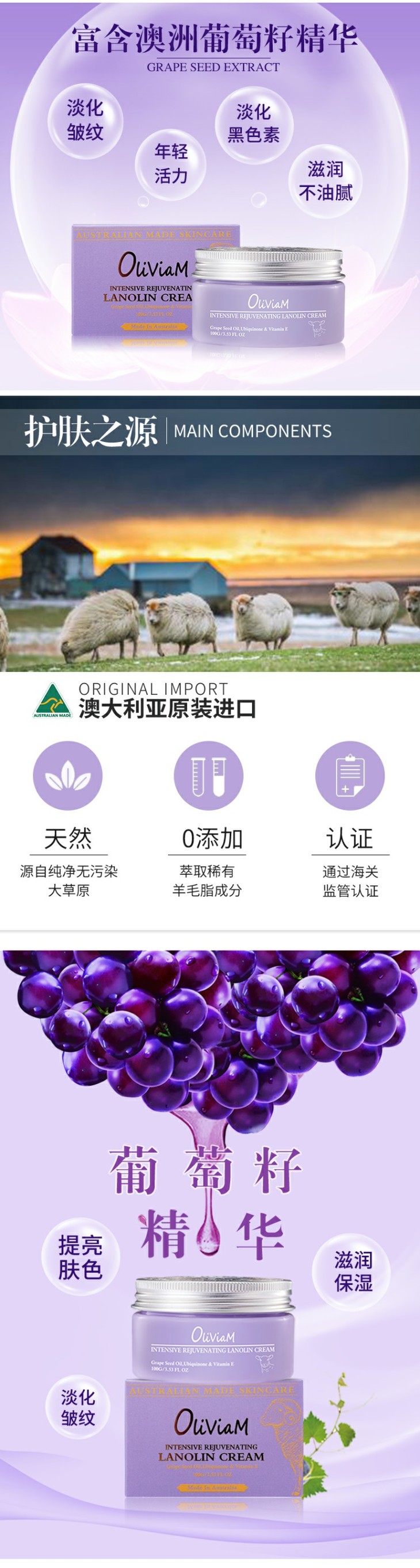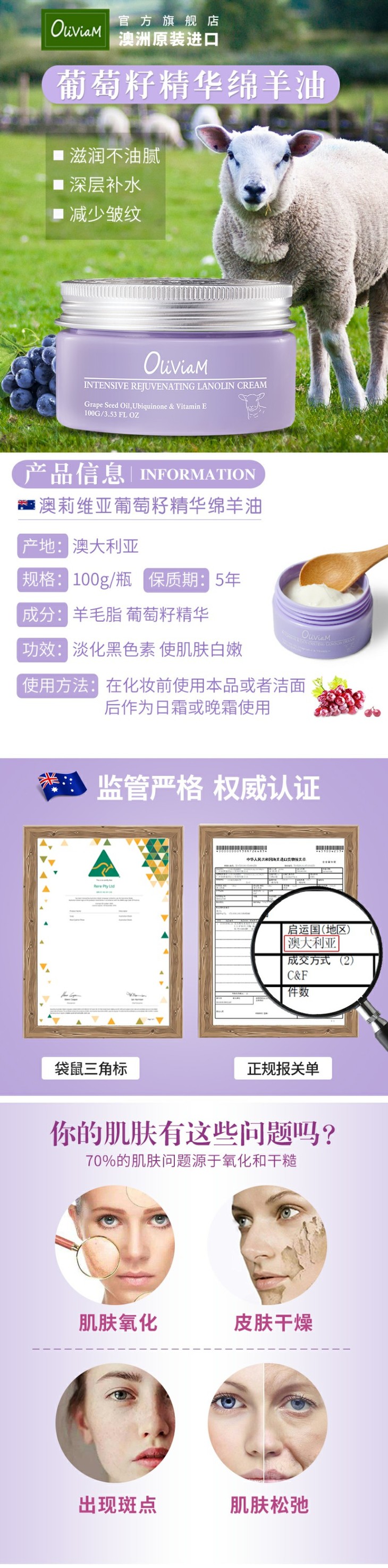 【一般贸易】澳洲Oliviam葡萄籽精华保湿绵羊油面霜100g/瓶