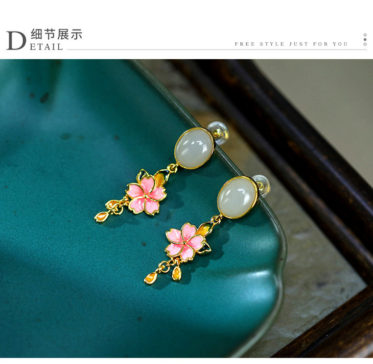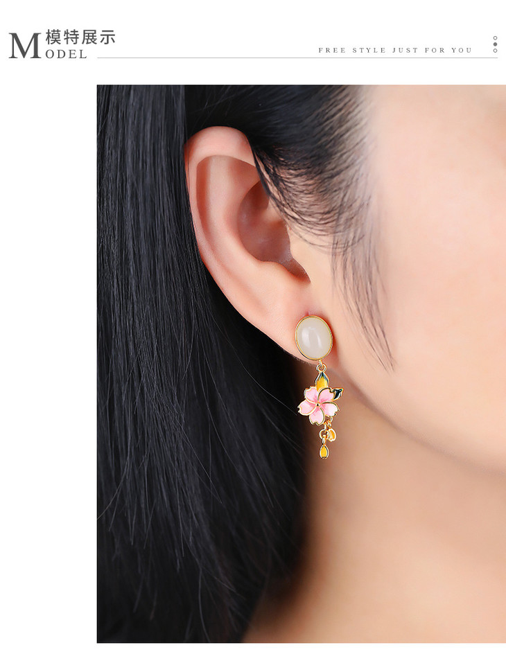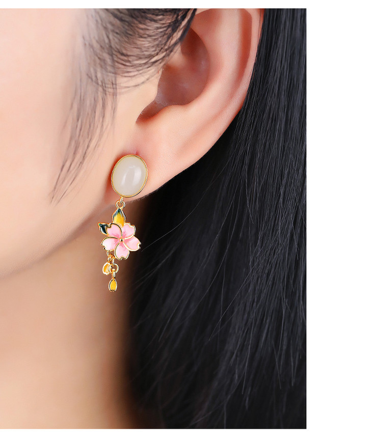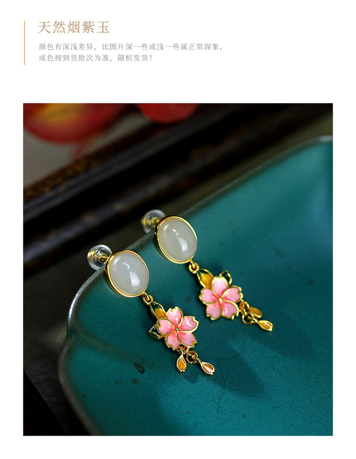 S925纯银镶和田烟紫玉珐琅彩粉色花朵耳饰耳钉HBL