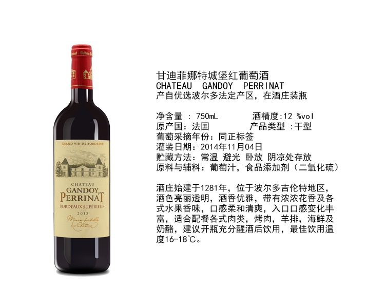 甘迪菲娜特城堡红葡萄酒 Chateau Gandoy Perrinat 750ml【2015】