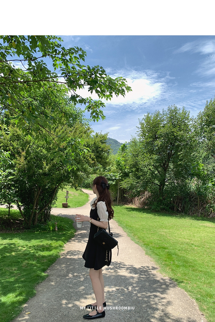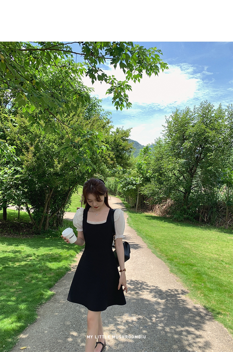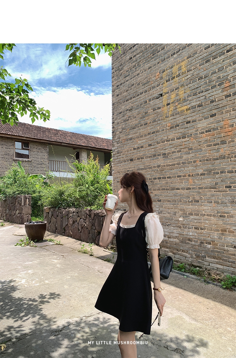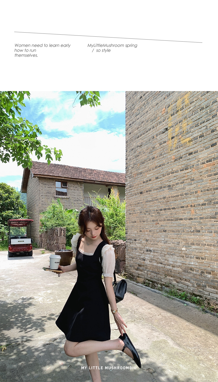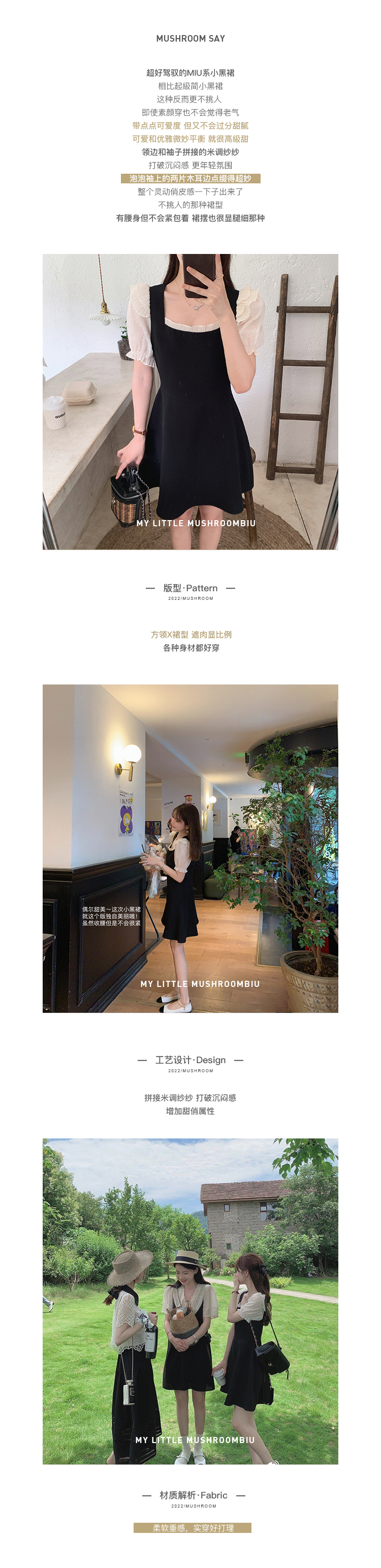 XS/M码金蘑菇菇【le serein少女心小黑裙】少女感泡泡袖拼接收腰连衣裙