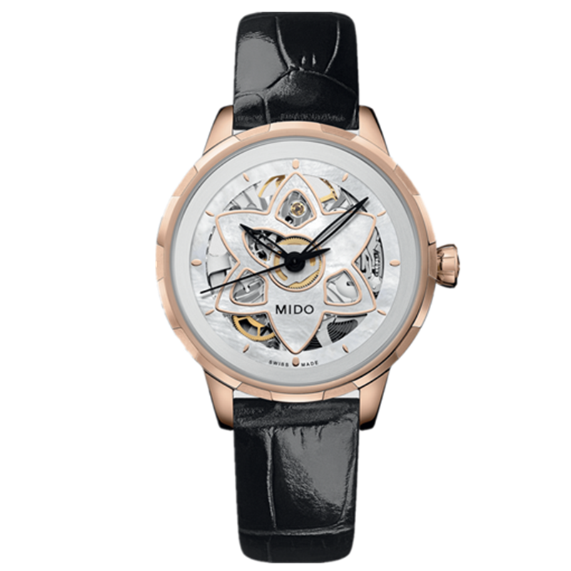 镜面 材质 | 蓝宝石水晶玻璃 | 表盘 | PVD镀玫瑰金不锈钢表壳 珍珠母贝表盘采用镂空花纹图案 机芯的主夹板经过特别的镂空设计和装饰 透底 |