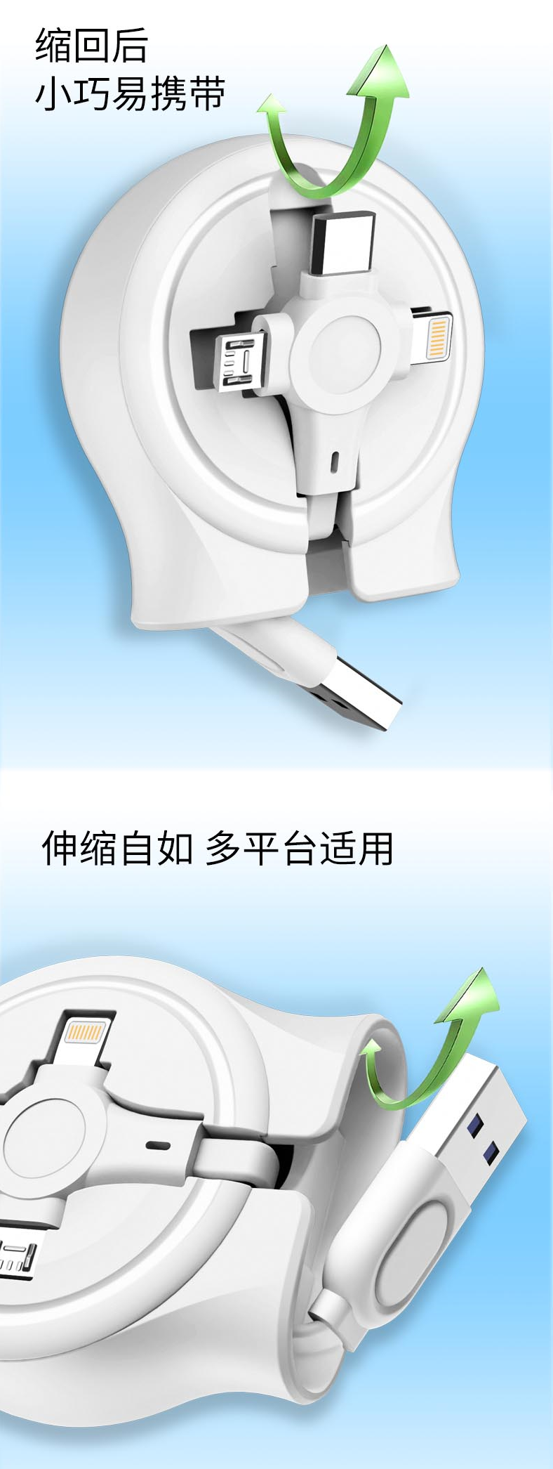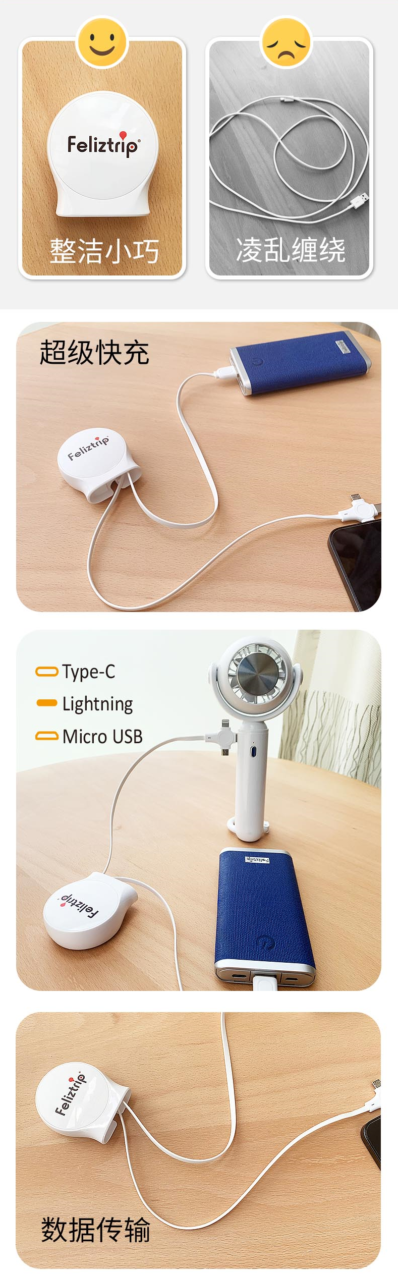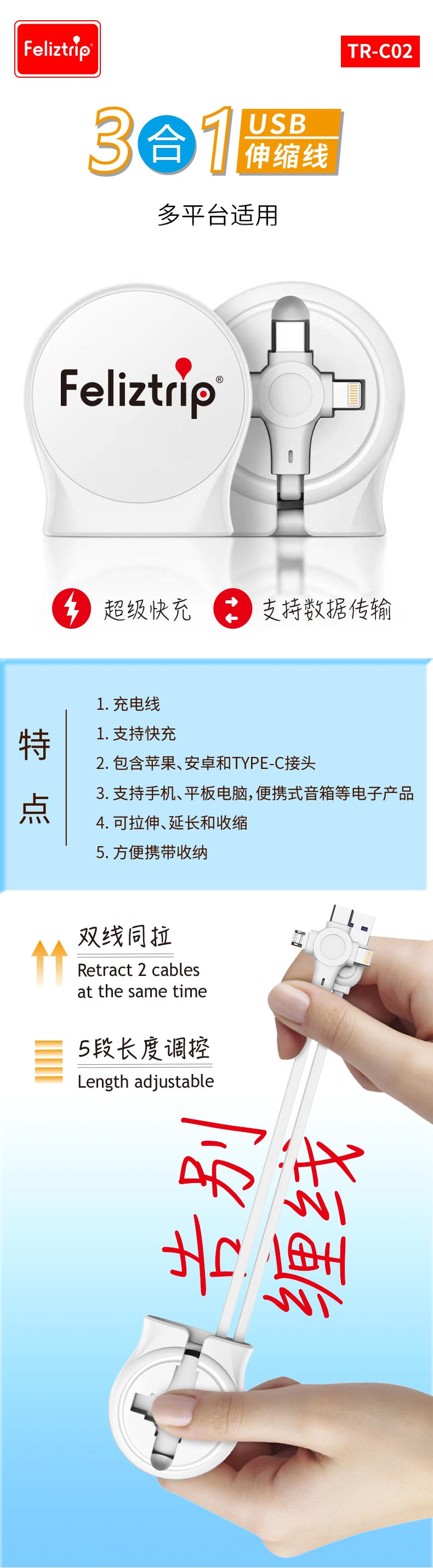 Feliztrip斐利斯 伸缩充电线数据线苹果华为安卓接口三合一带快充1米长度 TR-C02