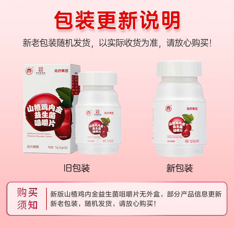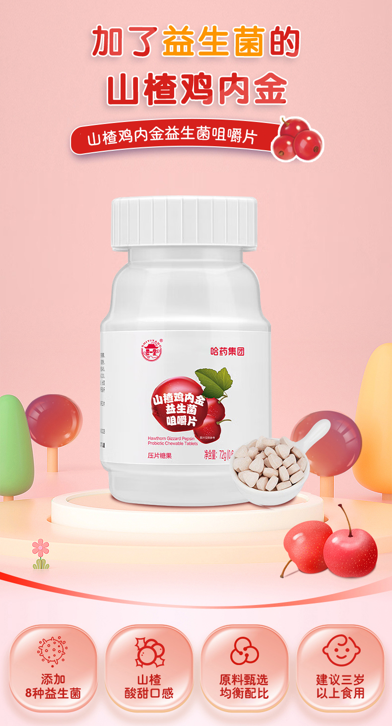 哈药山楂鸡内金益生菌咀嚼片72g(0.6g/片*120片)*3瓶