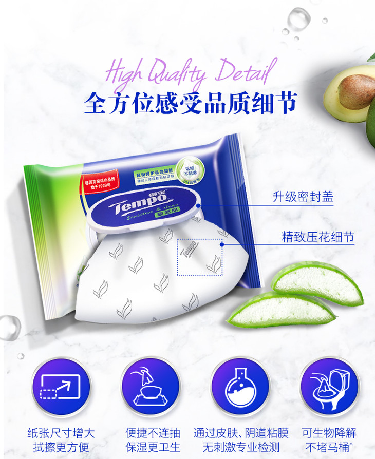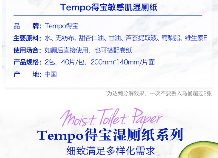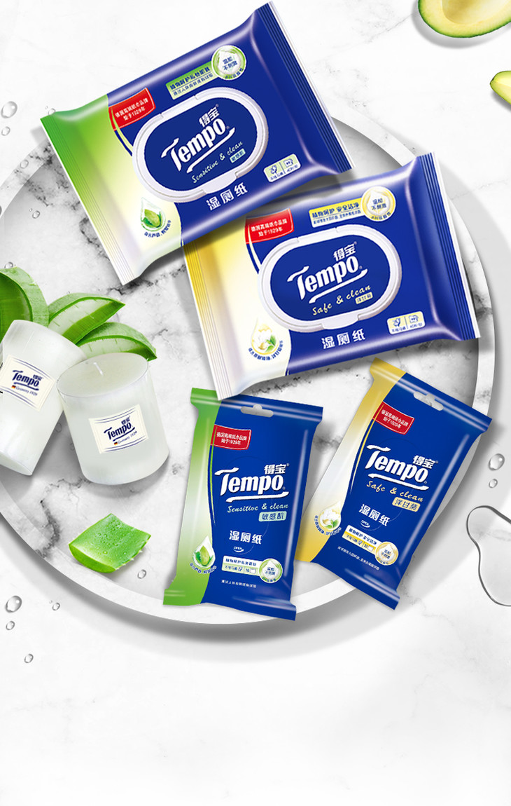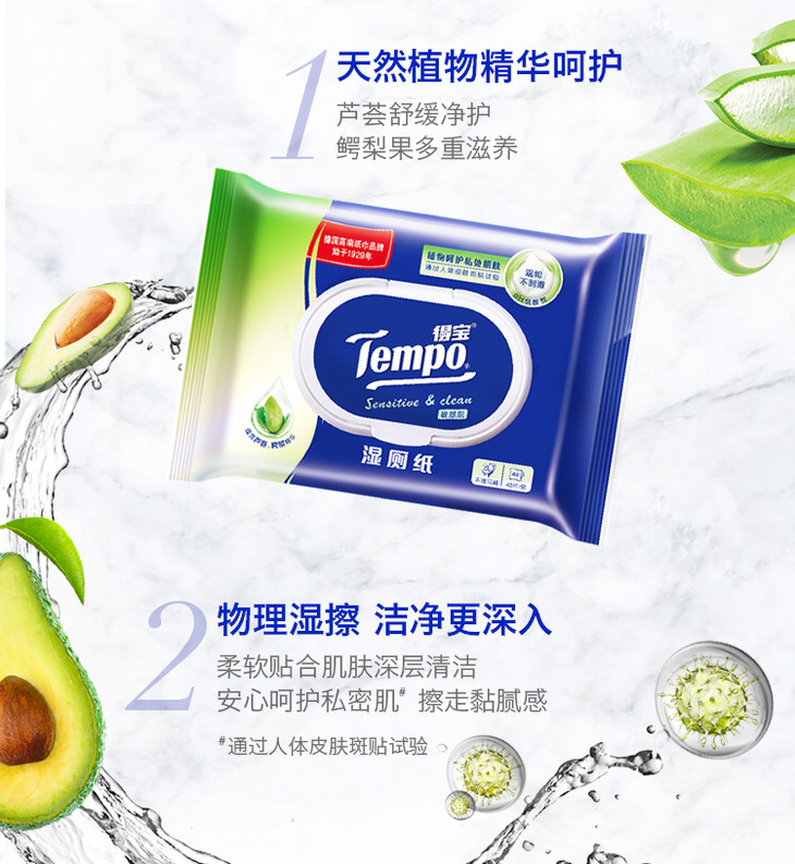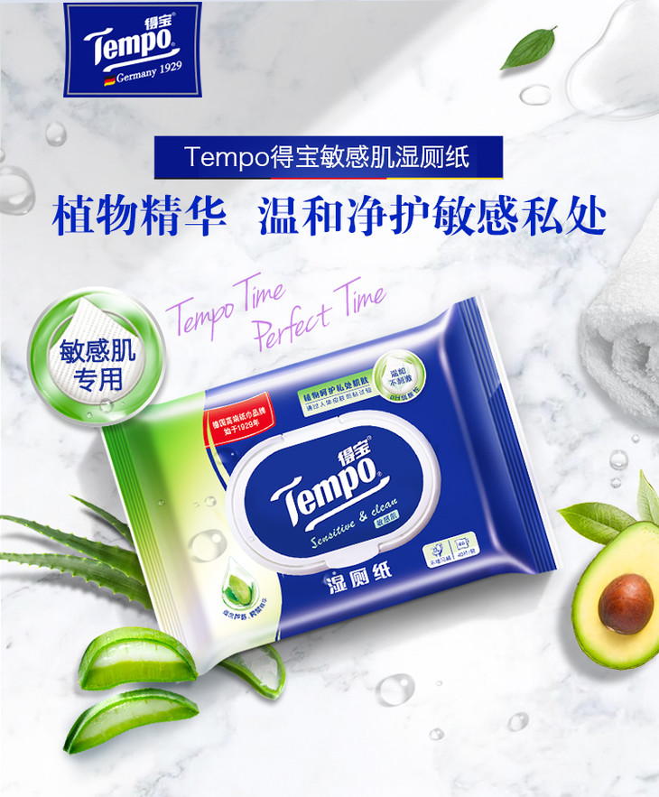 【2包装】Tempo得宝湿厕纸植物呵护敏感肌专用40片/包x2包经期可用卫生清爽抽取式湿巾湿厕纸