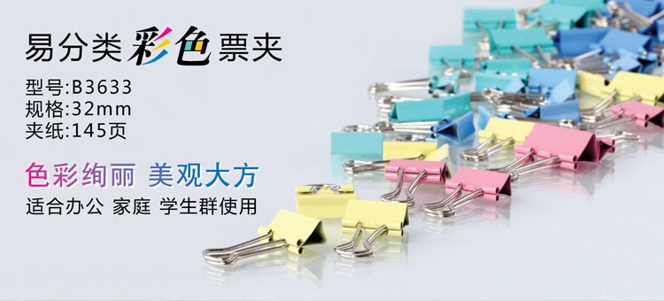 齐心彩色长尾票夹3#/32MM/B3633(24个/筒)