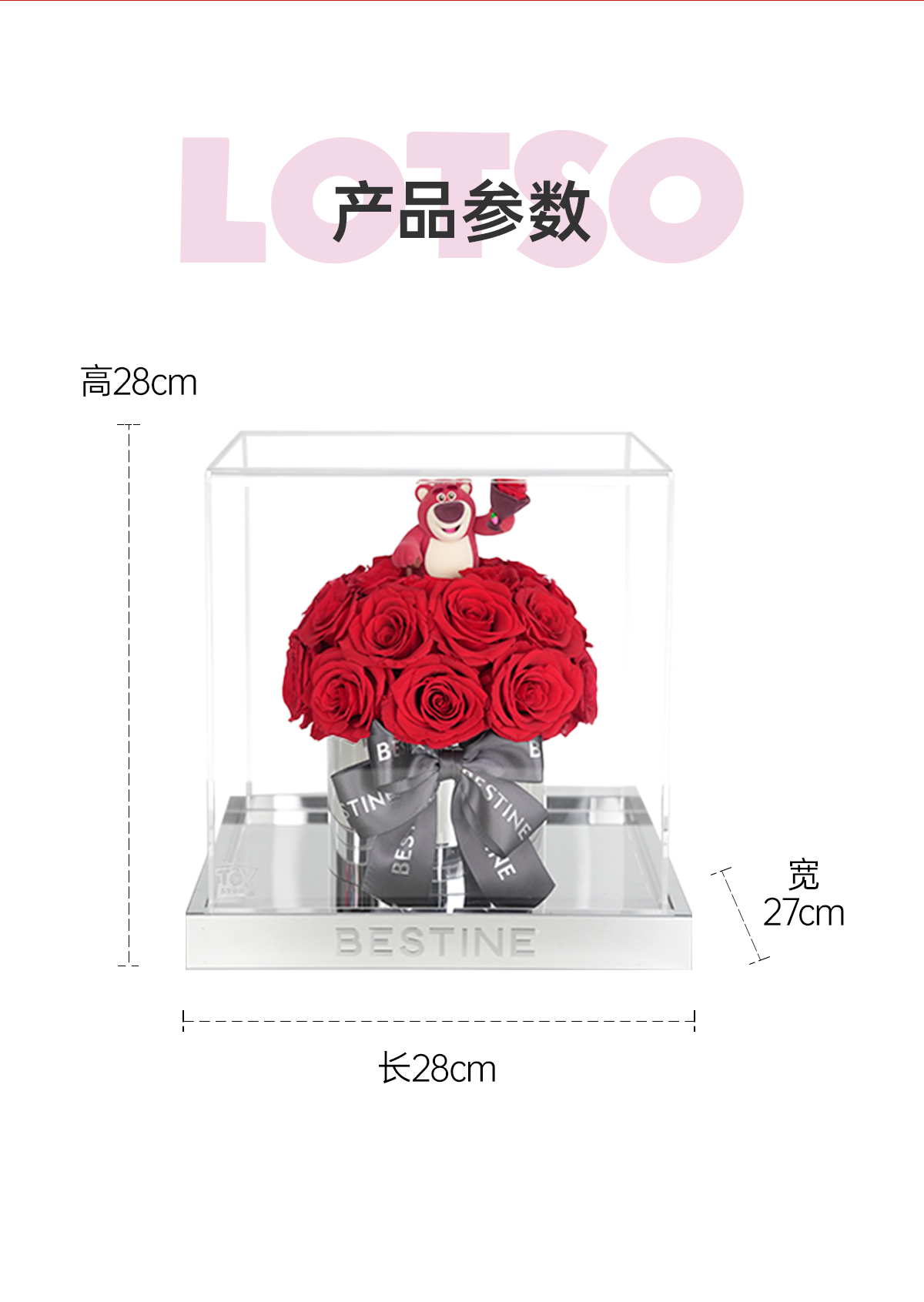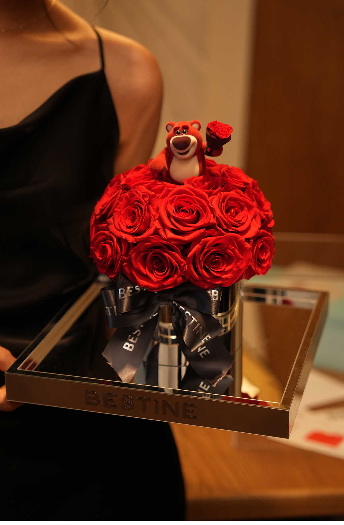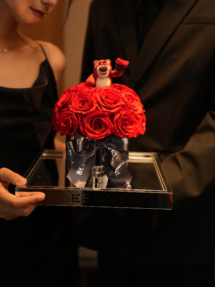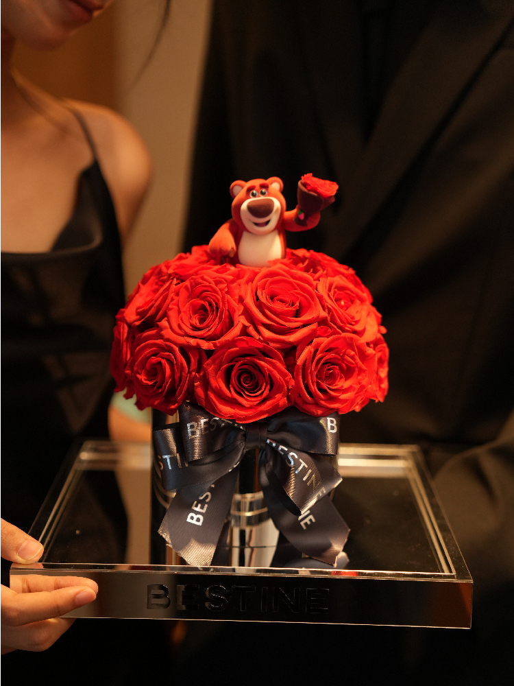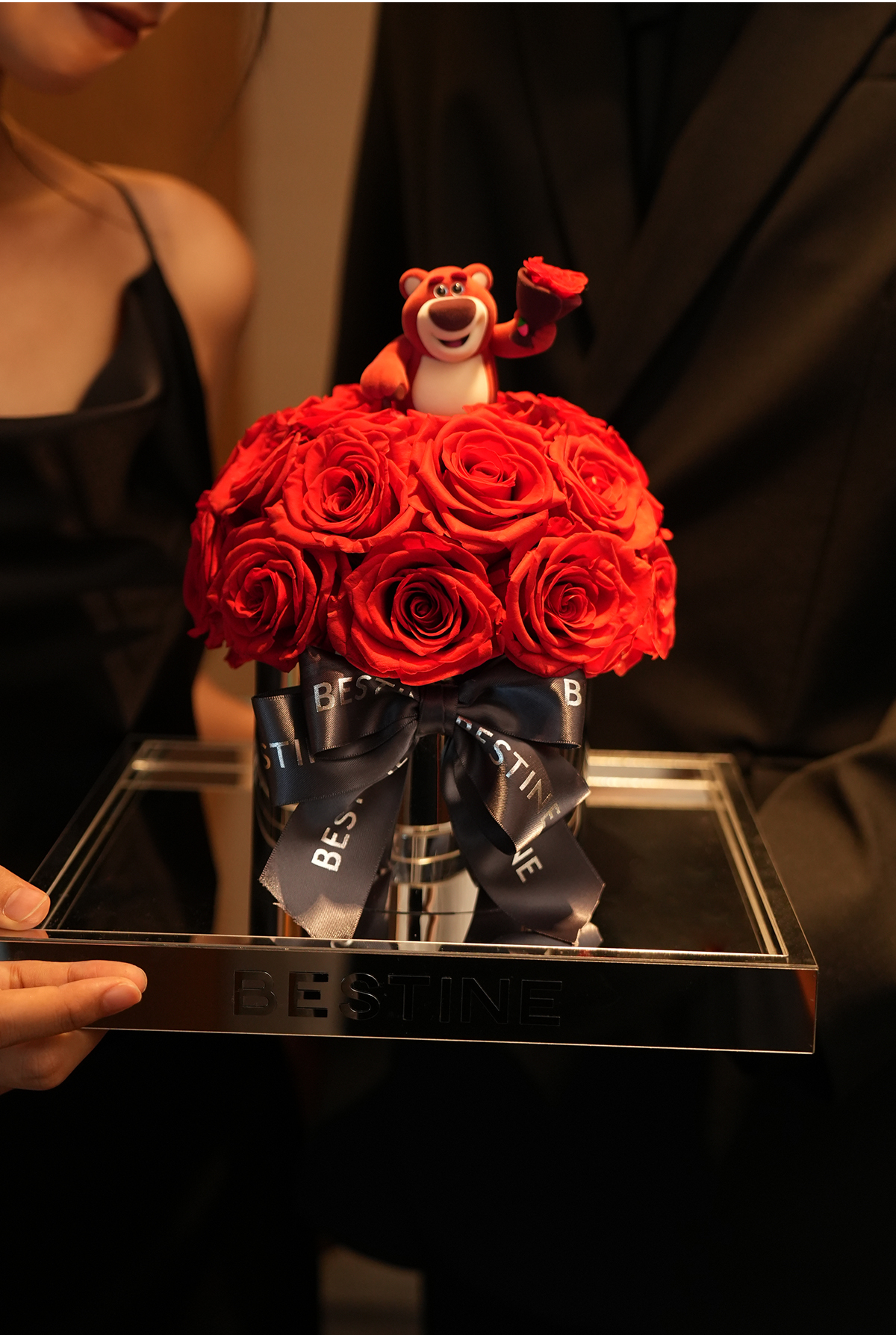 VBEINGS花语 草莓熊 玫瑰花束抱抱桶 草莓熊永生花玫瑰抱抱桶花束摆件礼盒生日
