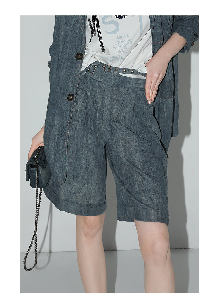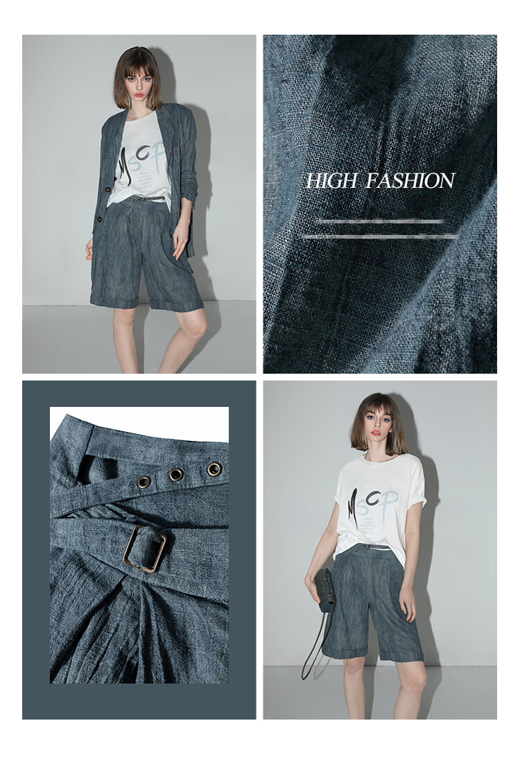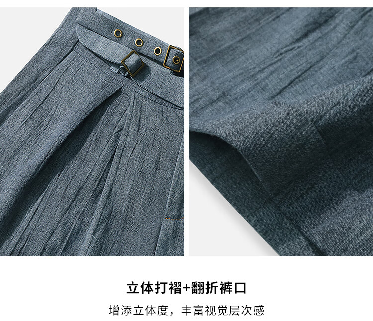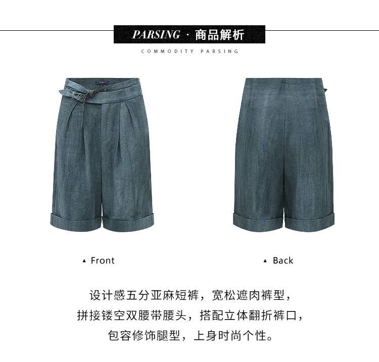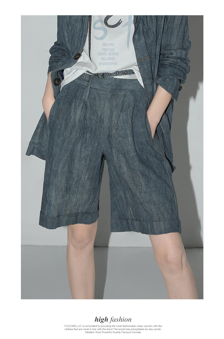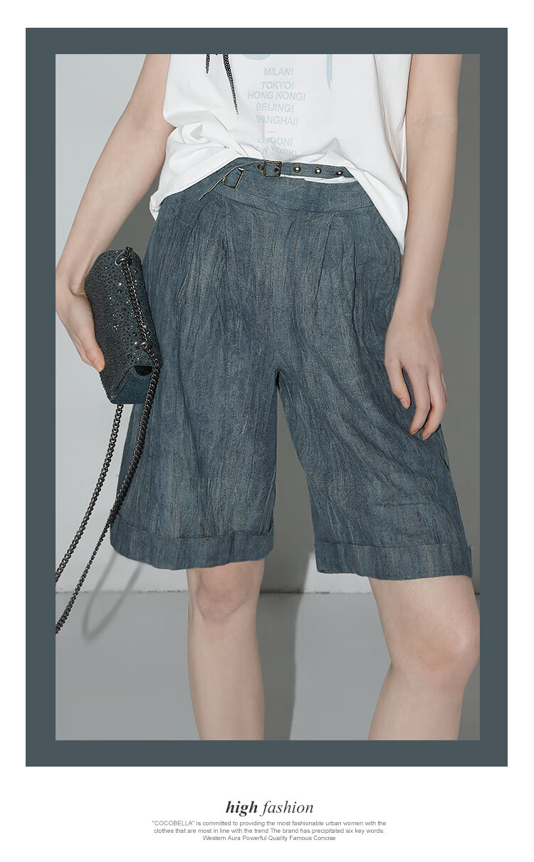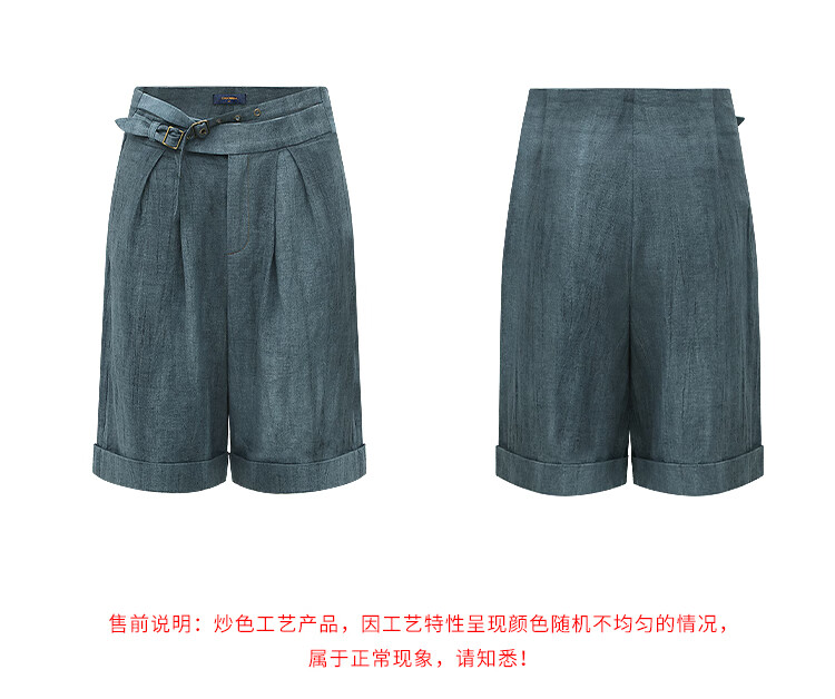 【有赞】COCOBELLA砂洗炒色亚麻短裤设计感双腰带牛仔风打褶裤SO0002