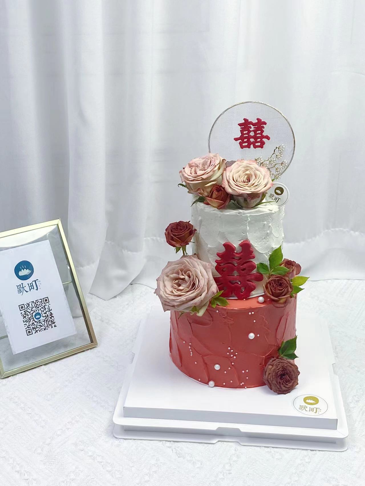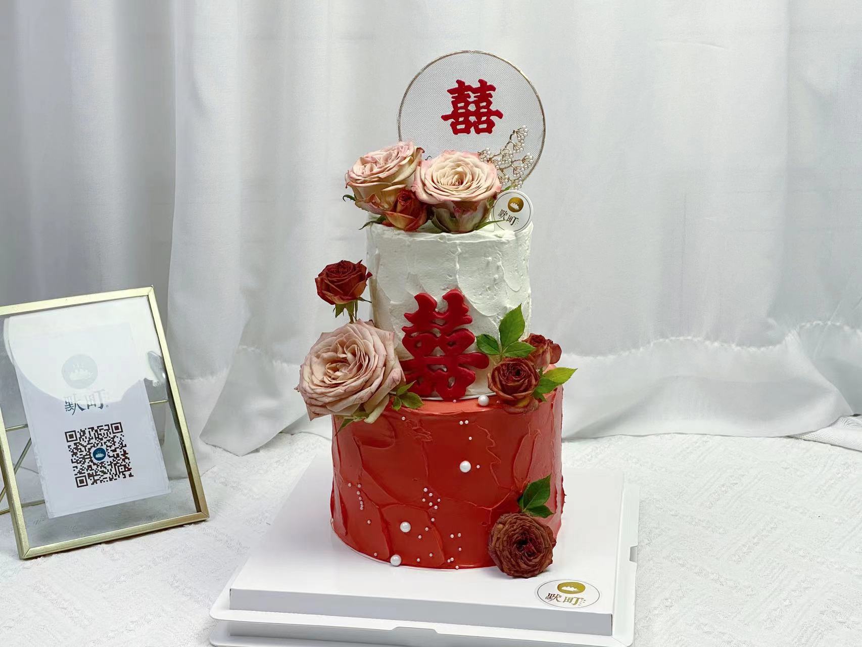 双喜双层复古大红结婚主题蛋糕
