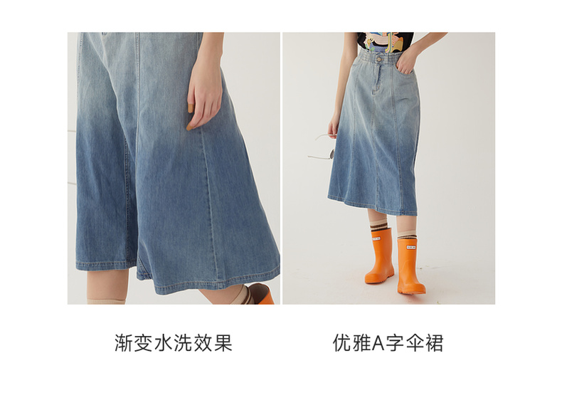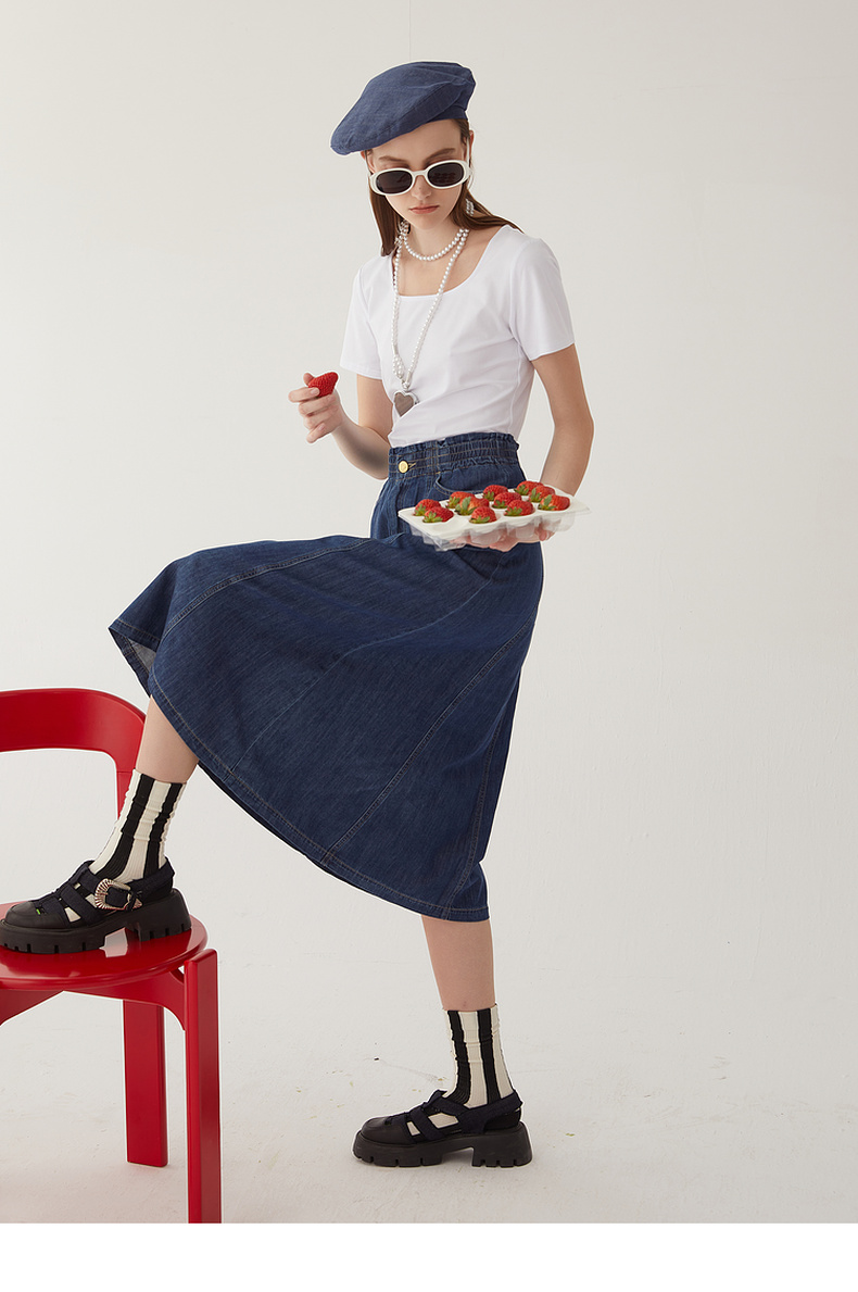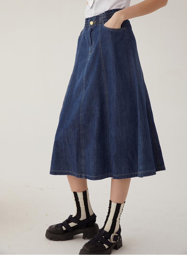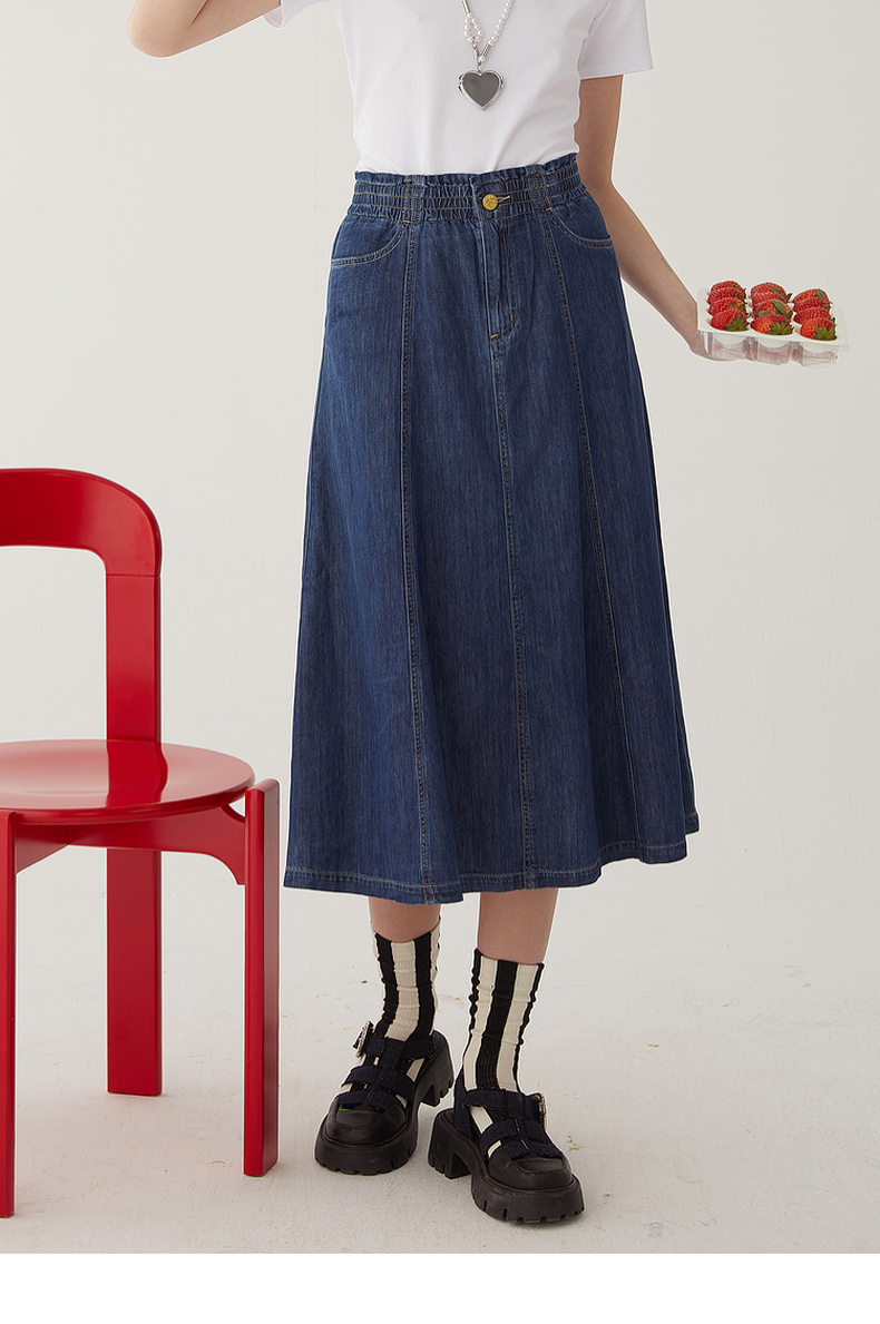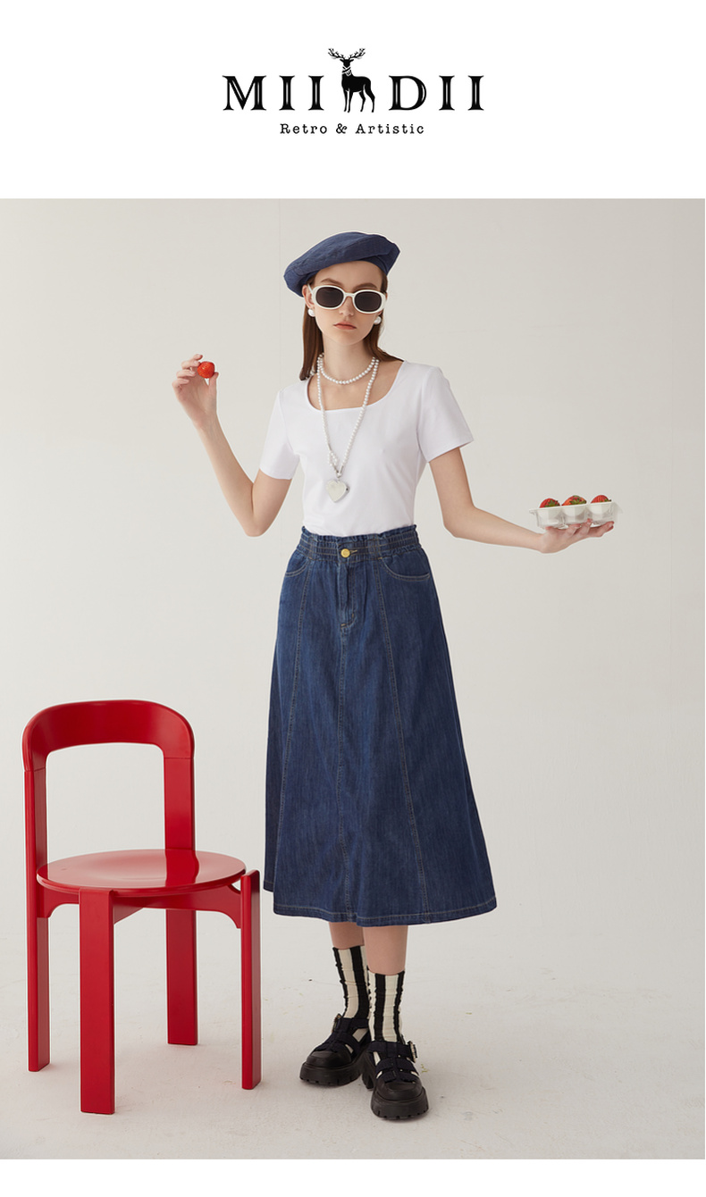 谜底气质牛仔半身裙2024夏季新款复古高腰A型长裙松紧腰246MB7003