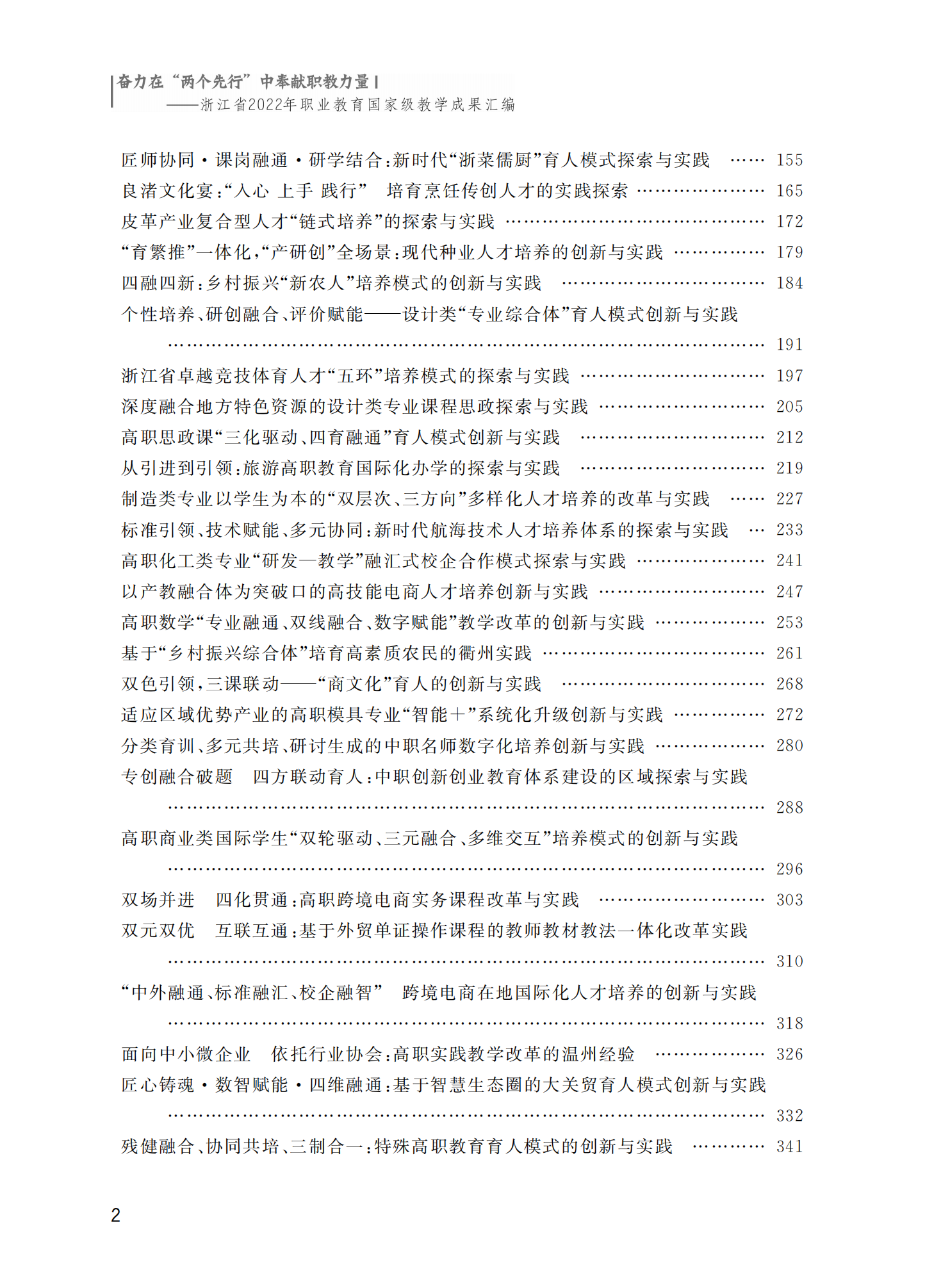 本书由浙江省成人教育与职业教育协会高职教学工作分会组织编写,共收集浙江省2022年职业教育国家级教学成果奖获奖成果46项,其中一等奖10项,二等奖36项,根据浙江省教育厅工作安排,将各高职院校教学成果案例编印成册,供浙江省内各高职院校学习,并宣传推广相关优秀的做法,以期提高浙江省高职院校整体的教学水平。本书收集的每一个成果奖的案例包含成果简介、成果的培育背景、形成过程、成果针对的教学问题、探索形成的模式方法、成果的创新点、推广应用效果、体会感悟这几个大方面的内容。