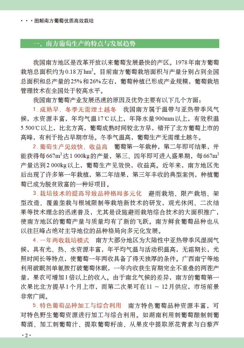 本书针对南方葡萄发展与生产中存在的问题 从葡萄种类与品种选择择、苗木繁育与高接改种、规范化建园、土肥水管理、整形设架与修剪、花果管理、产期调节、病虫害防治、自然灾害防治、葡萄采收与采后管理等方面入手 介绍了南方葡萄优质高效栽培的新技术。对指导生产有较大的现实意义。