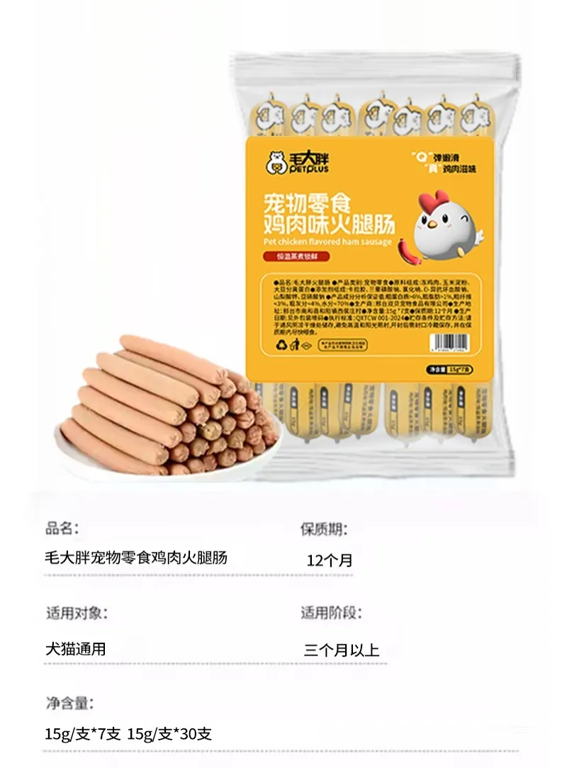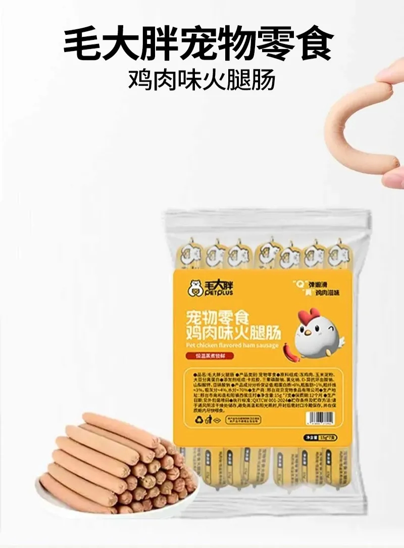 毛大胖宠物火腿肠零食猫狗低盐训练奖励鸡肉味香肠猫犬通用/袋