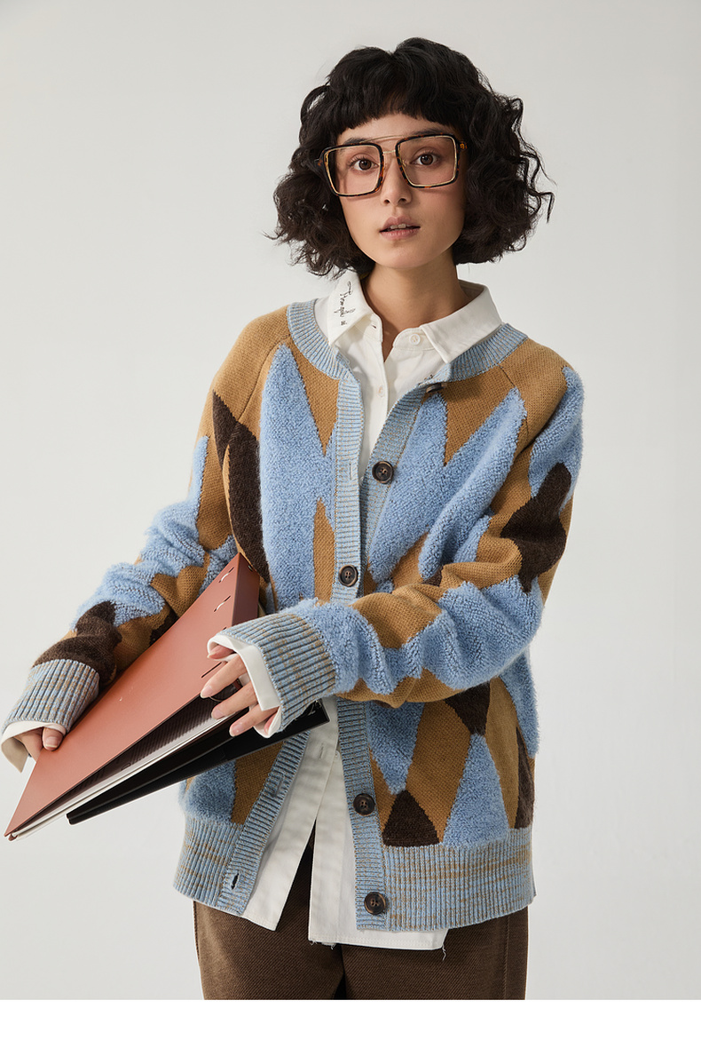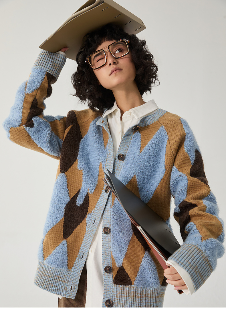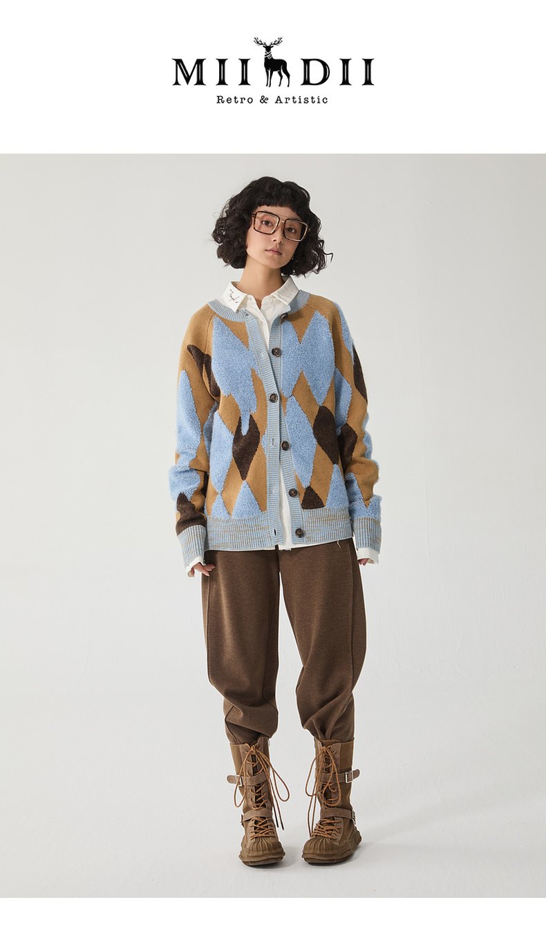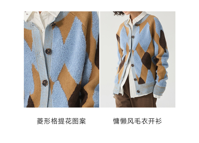 谜底圆领针织开衫女2024冬新品复古风百搭短款加厚毛衣244MZ1883